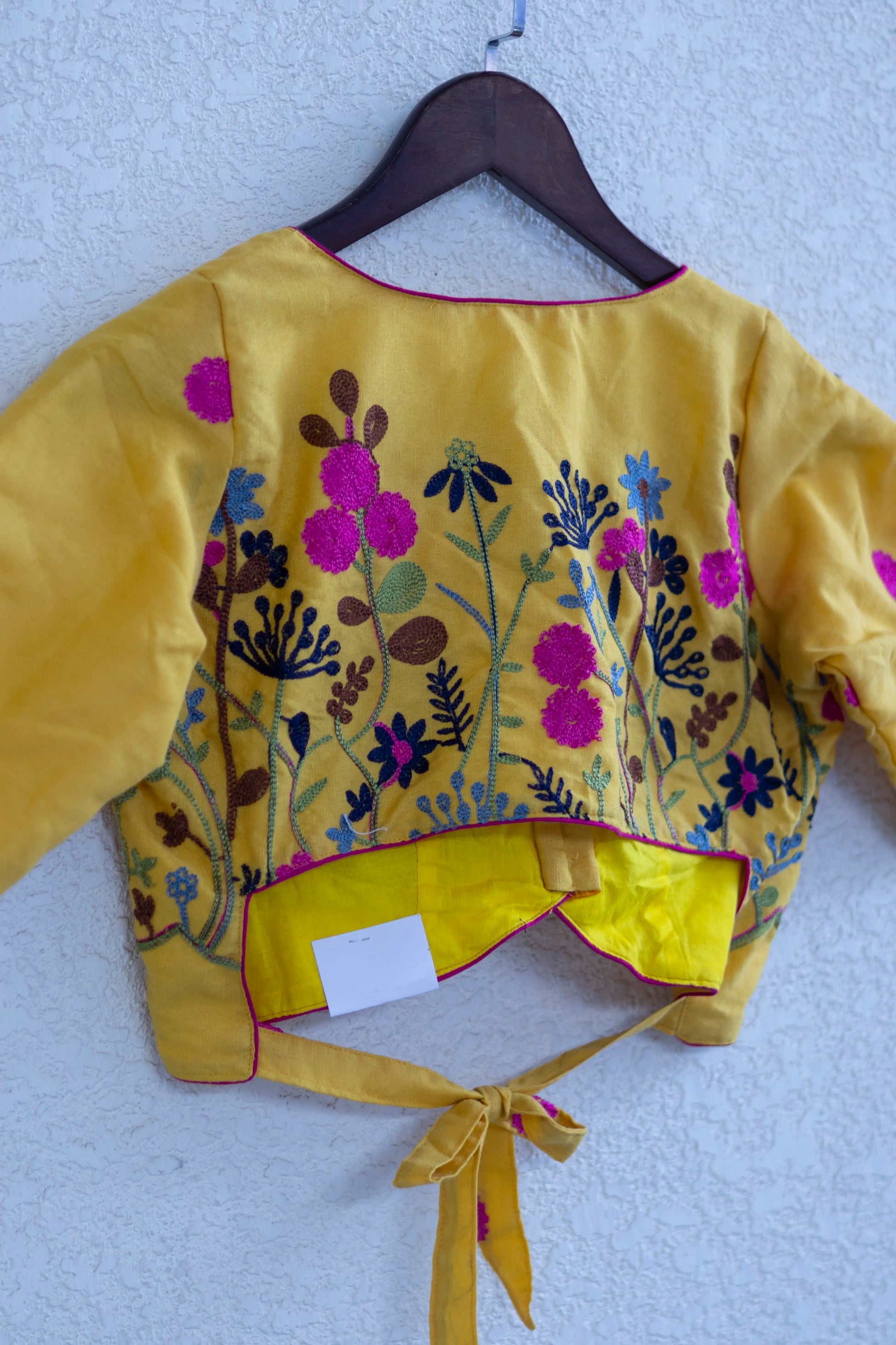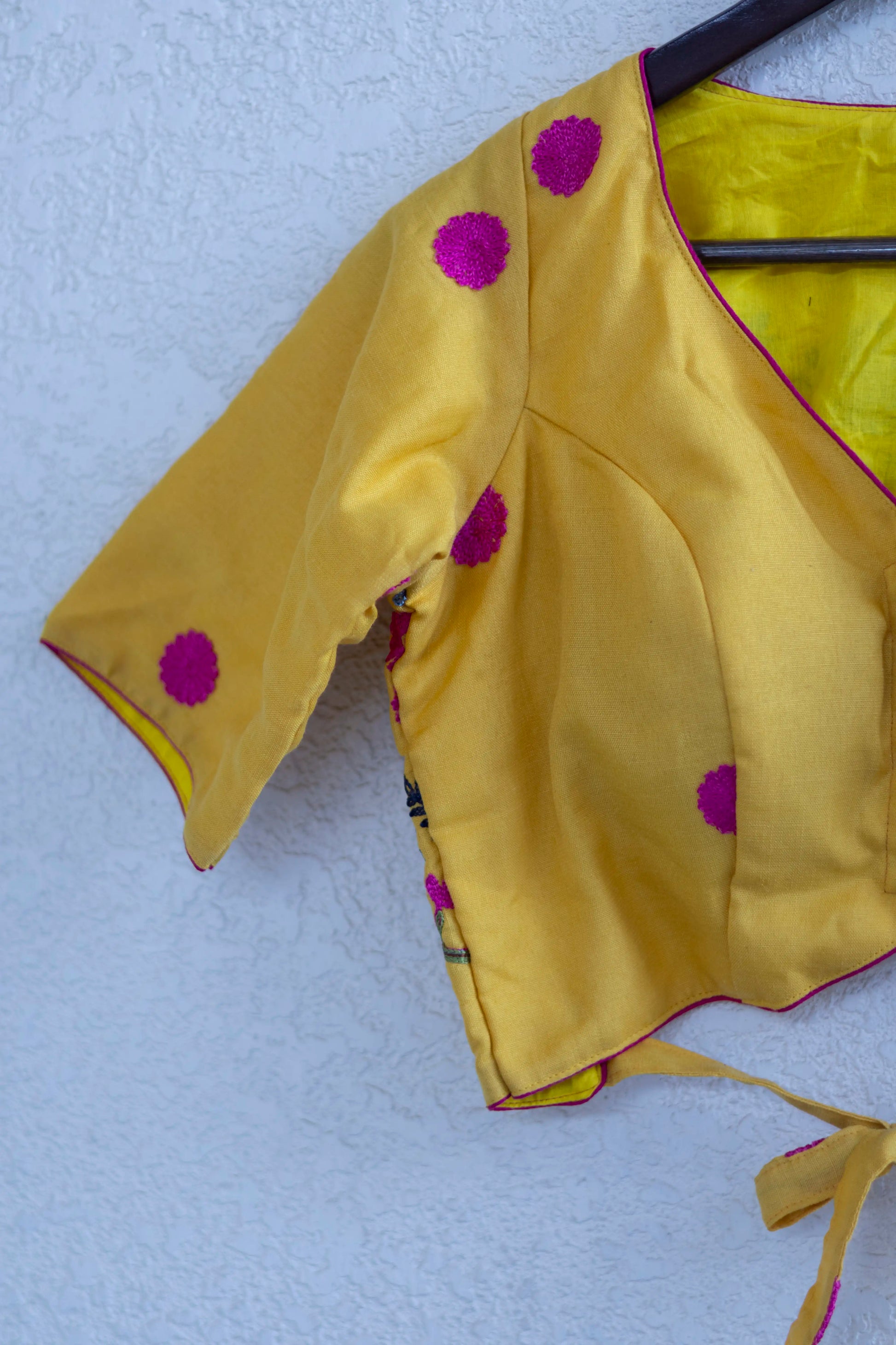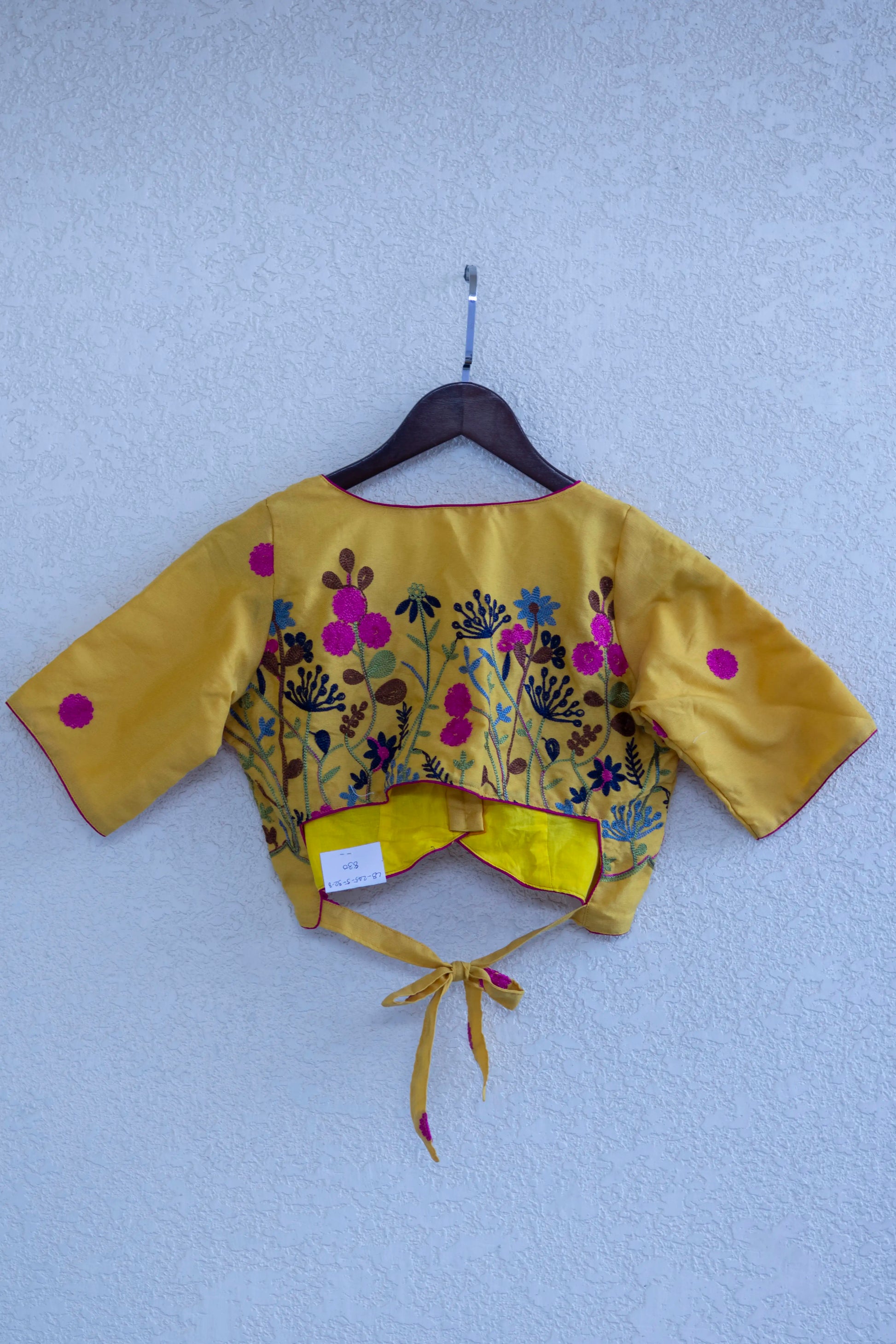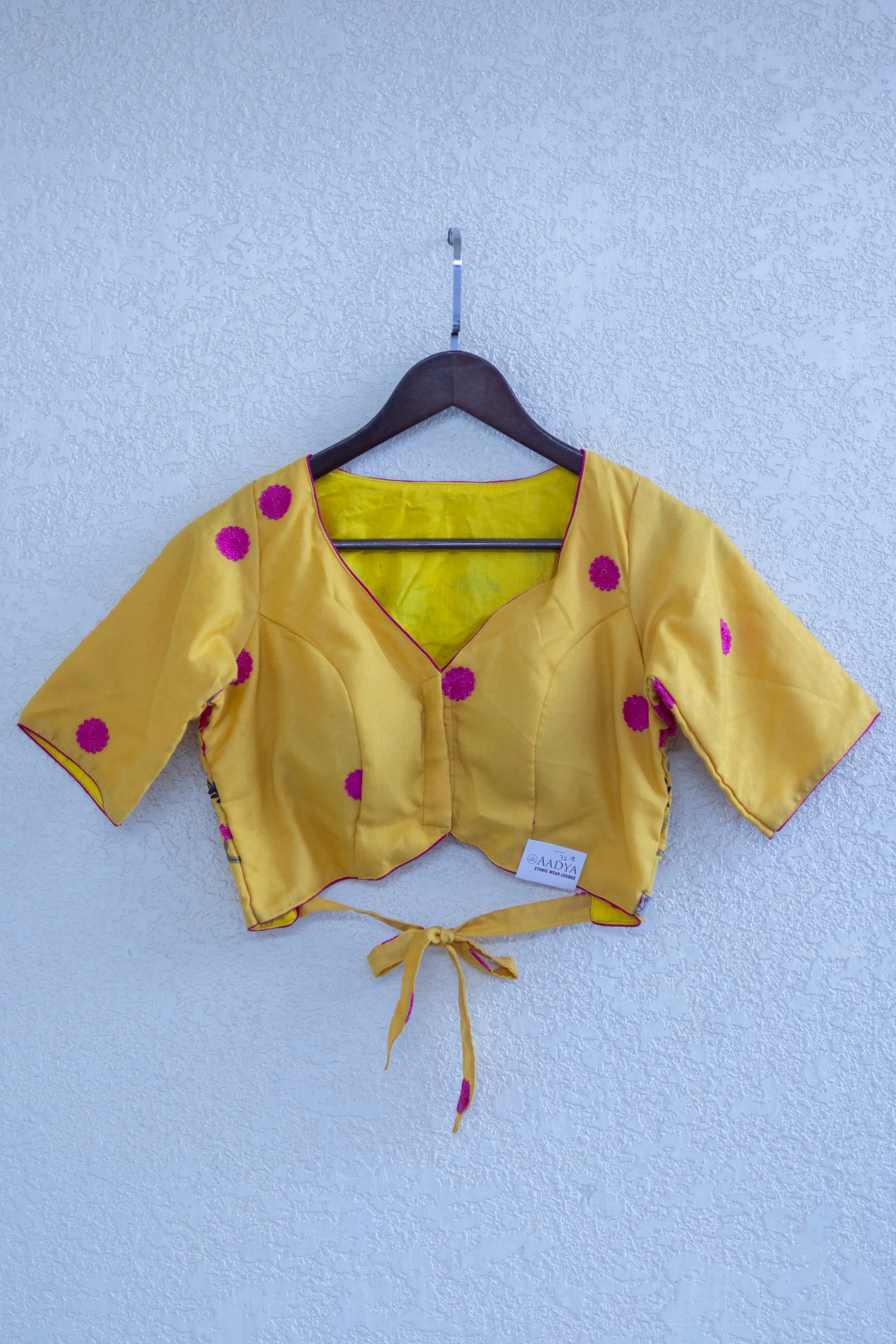 Yellow V Neck Silk Elbow Sleeve Blouse