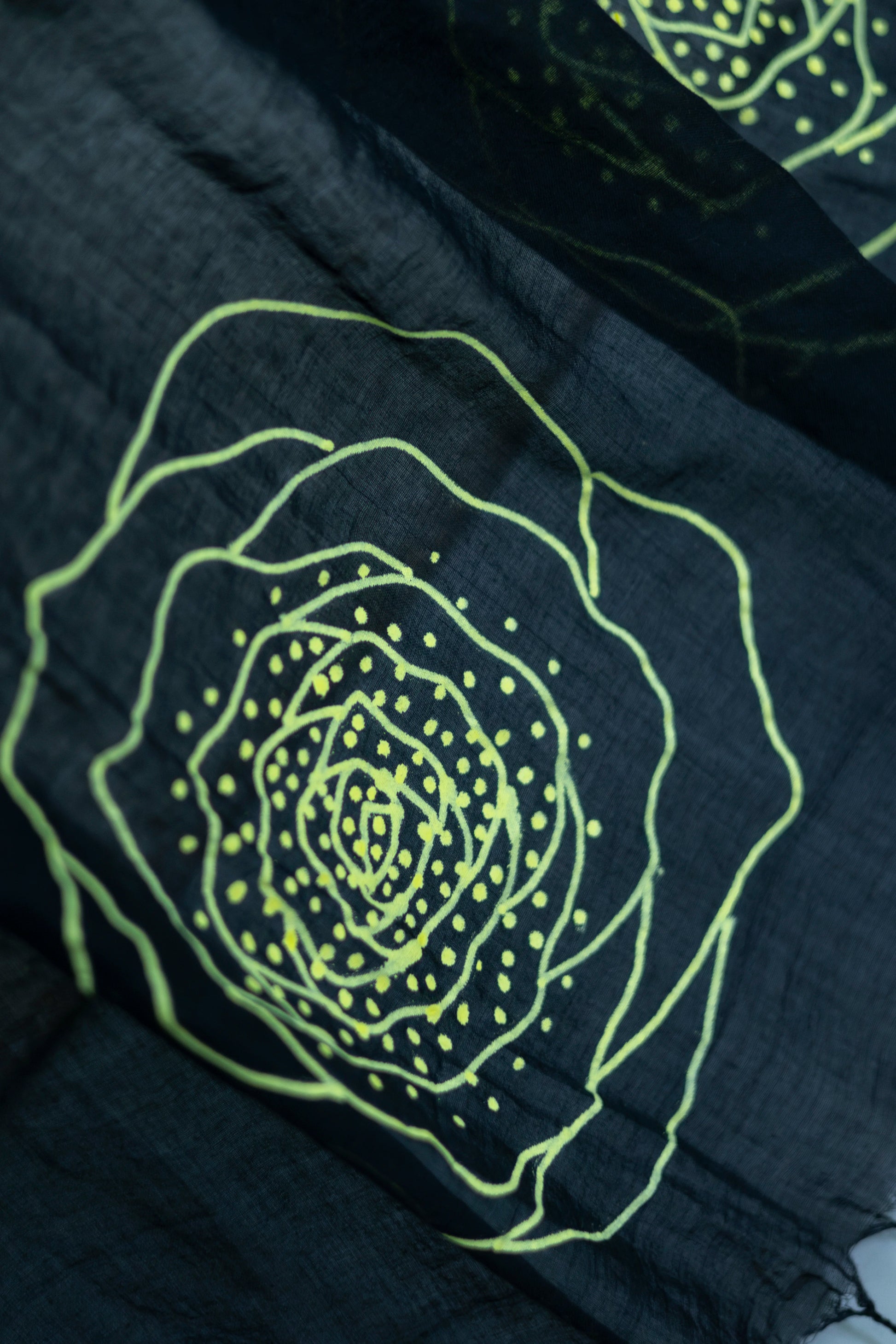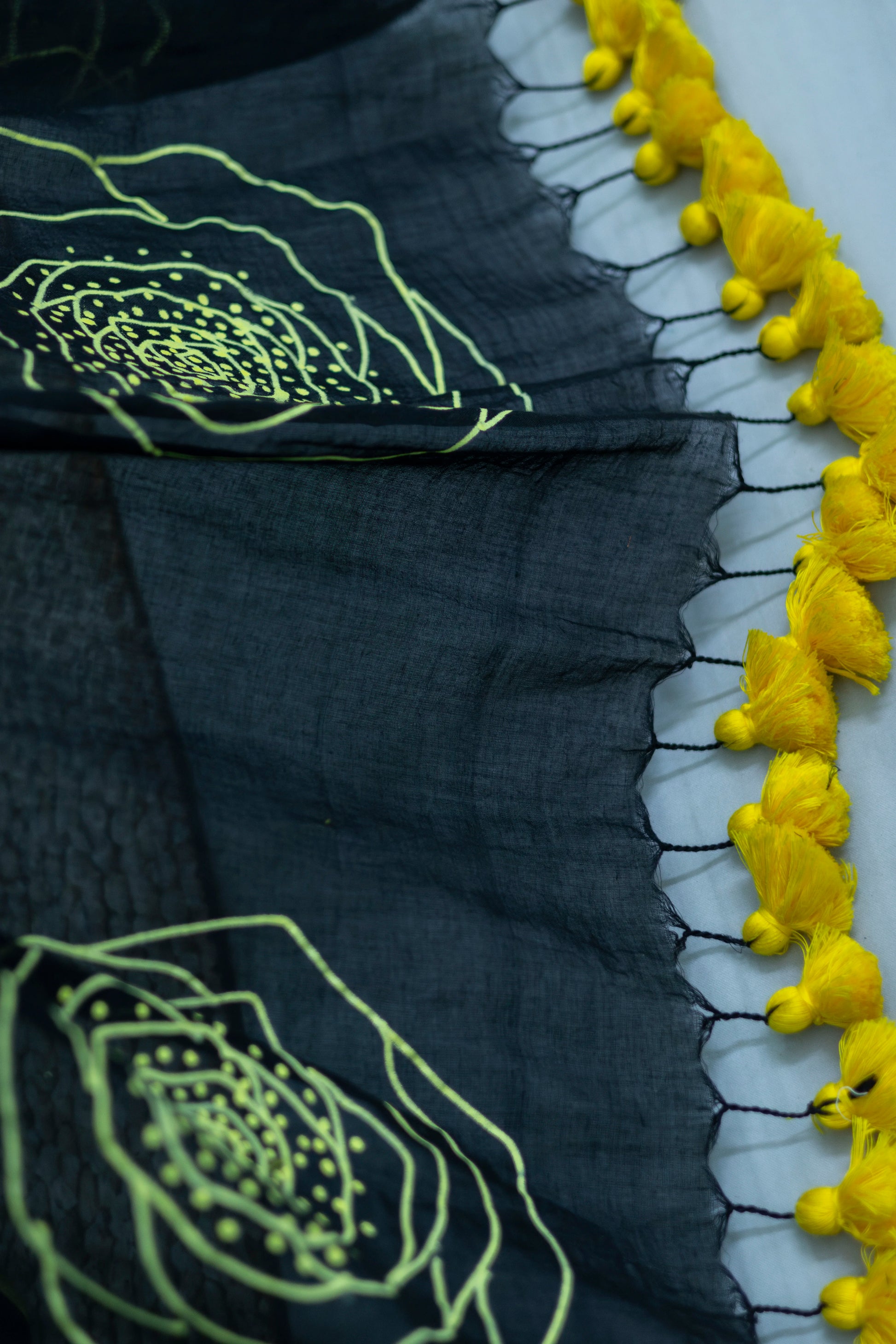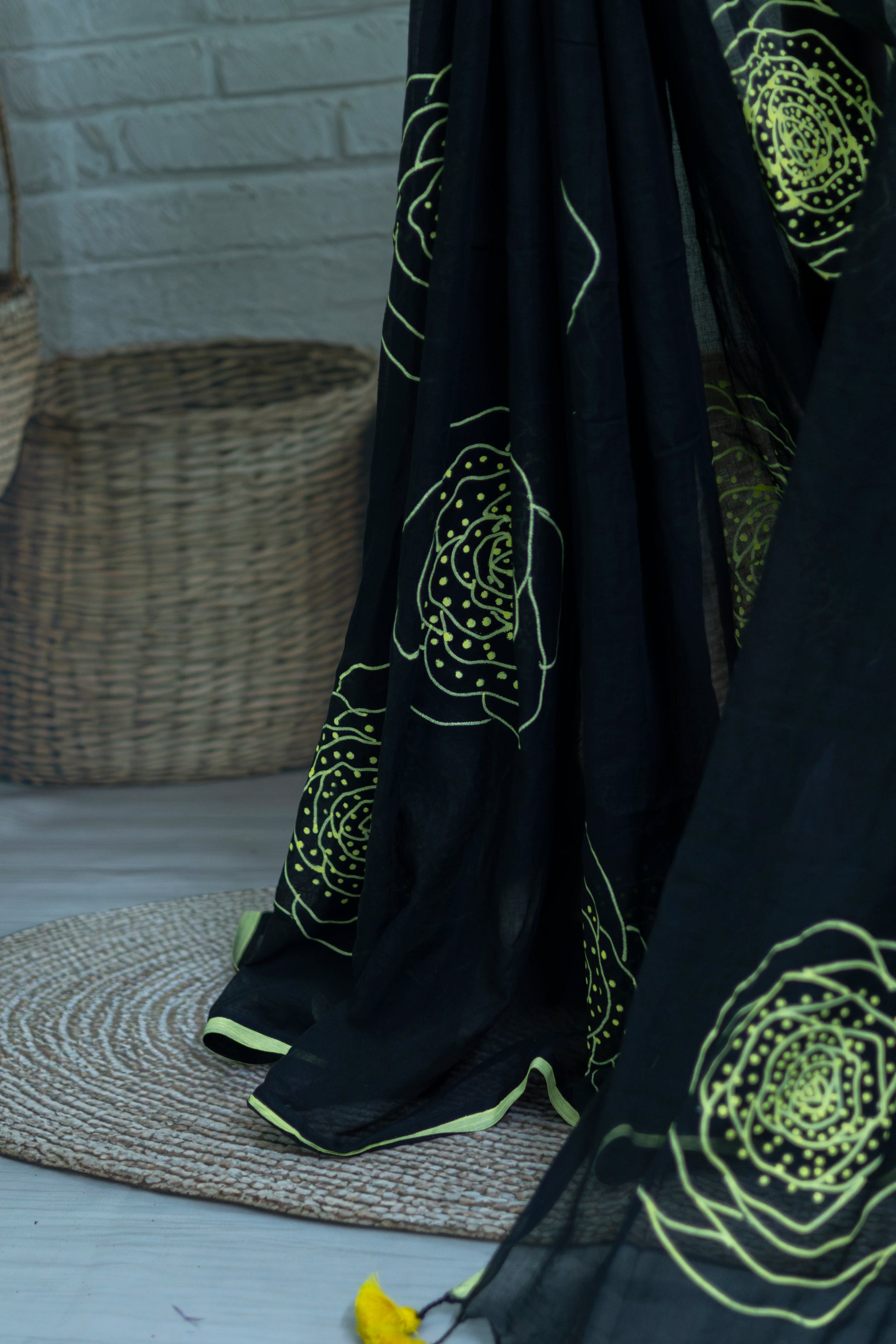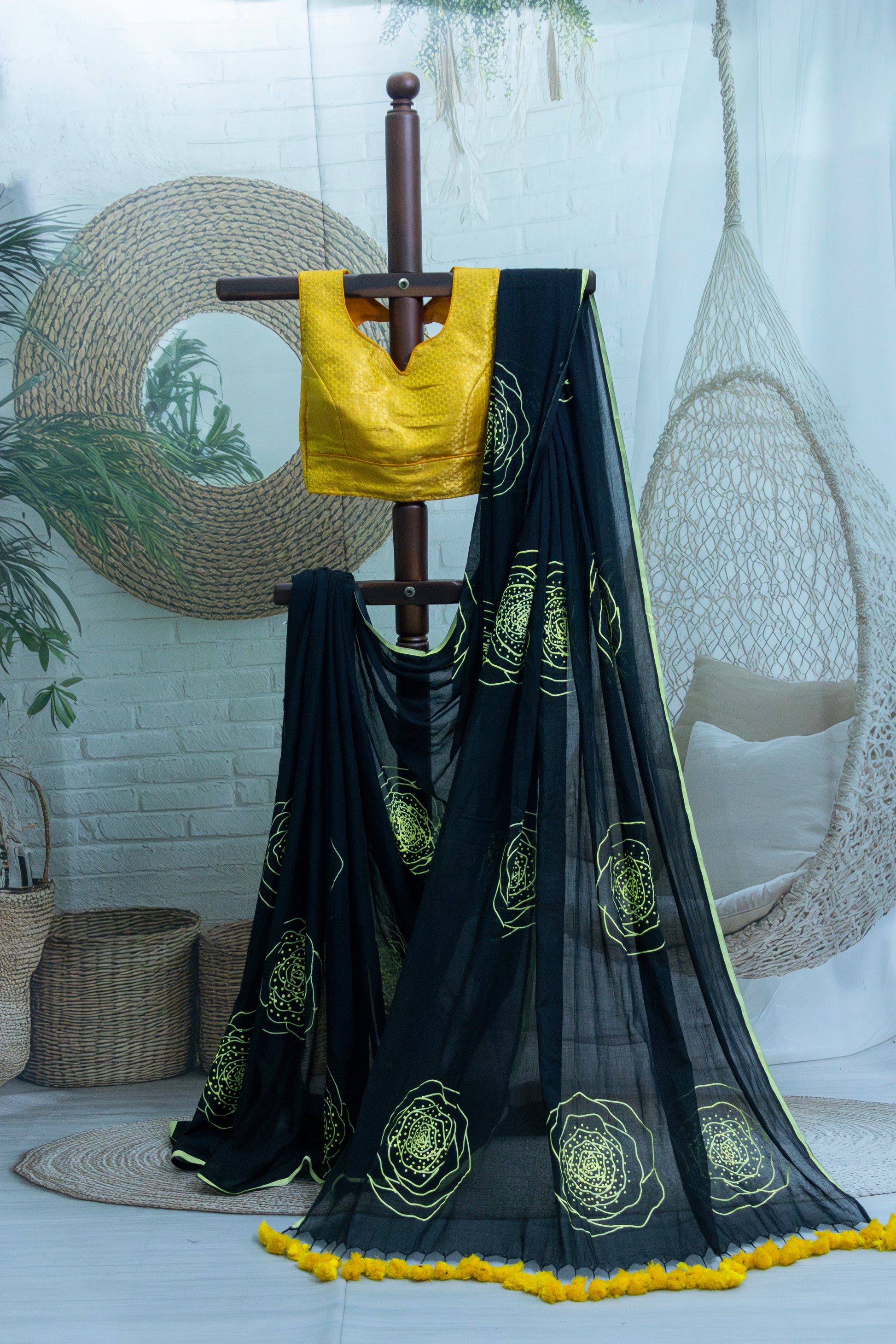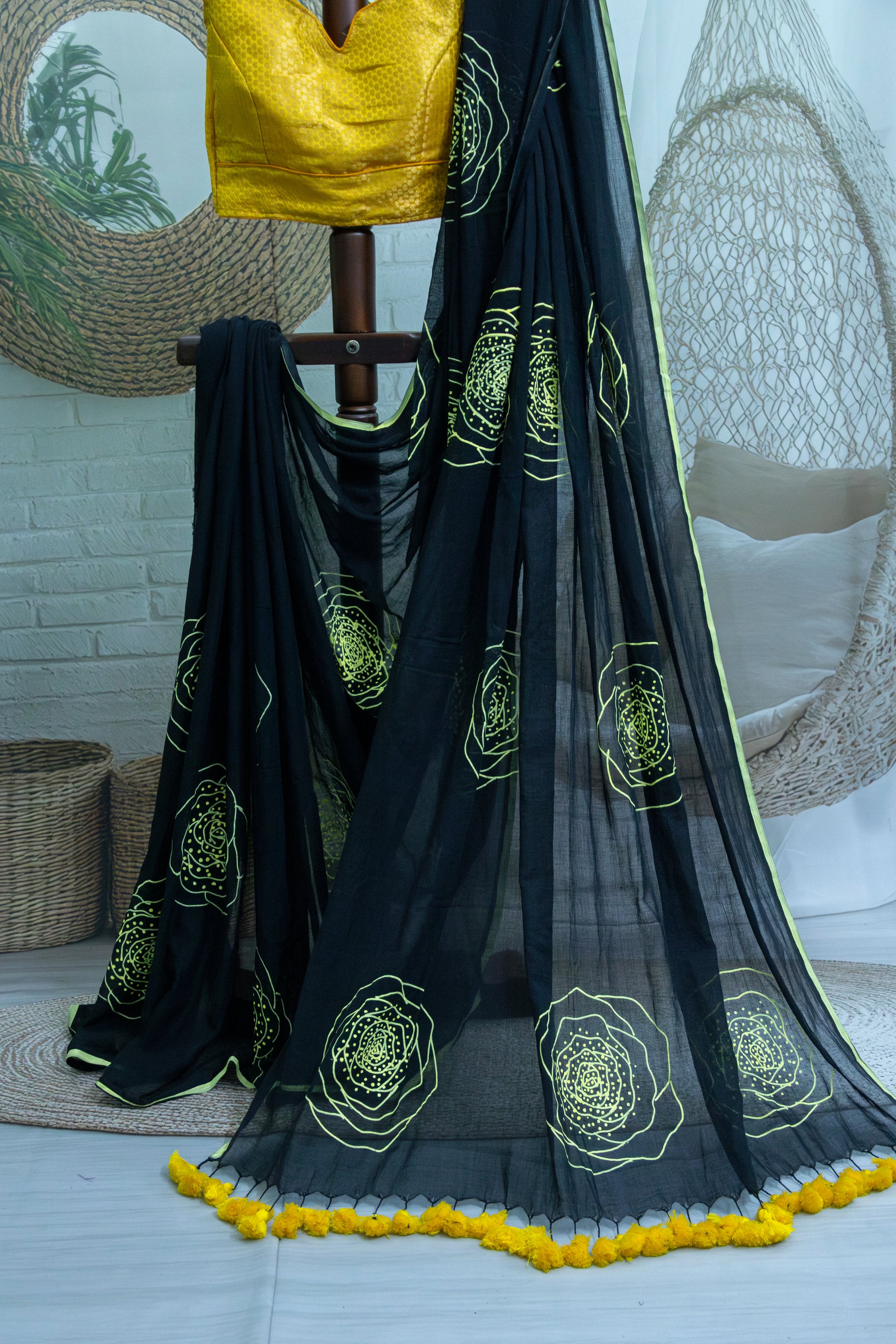 Rose Print Black Mul Cotton Saree With Black Tussils