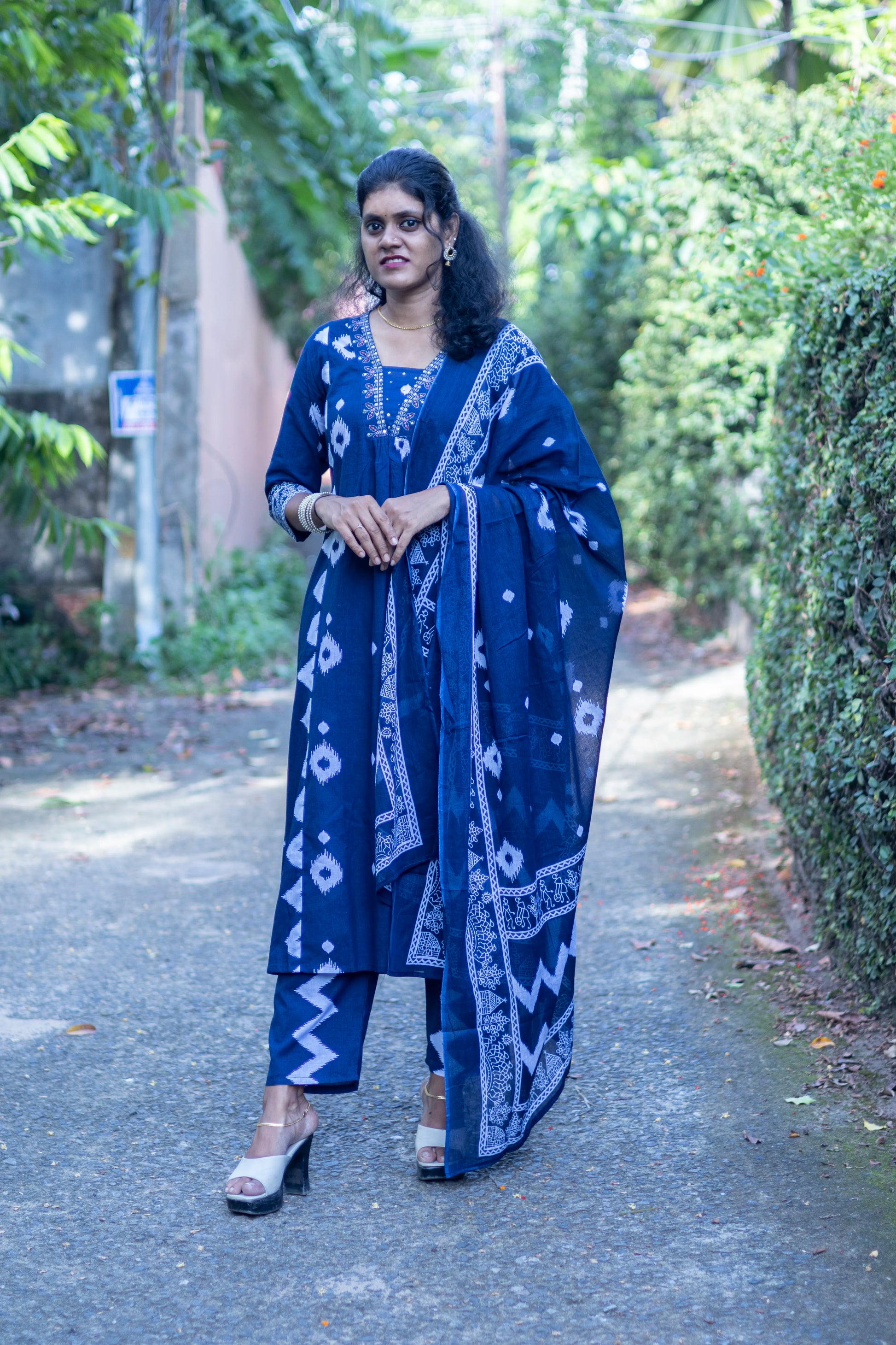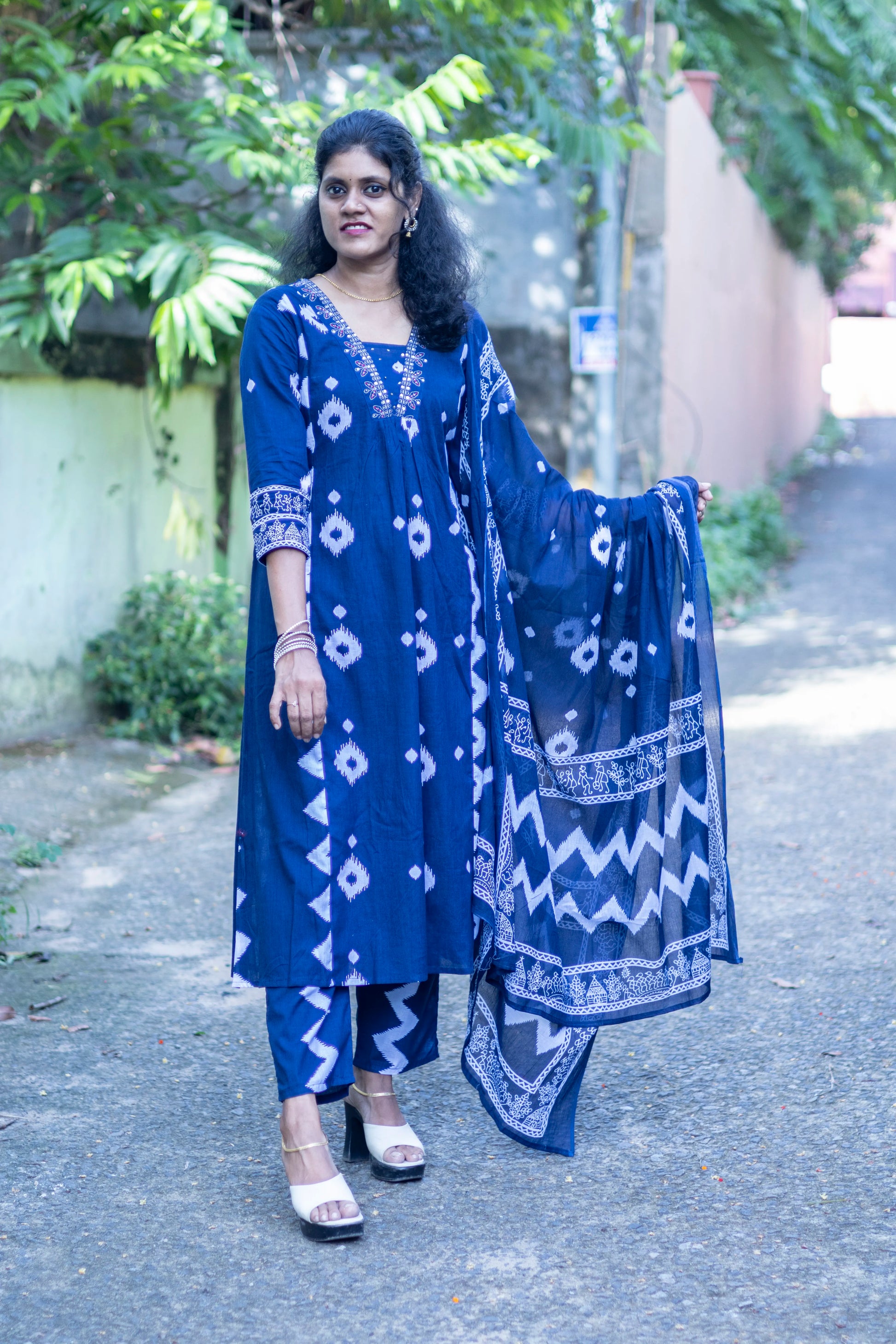 Blue A-Line Kurti Set With V-Neck