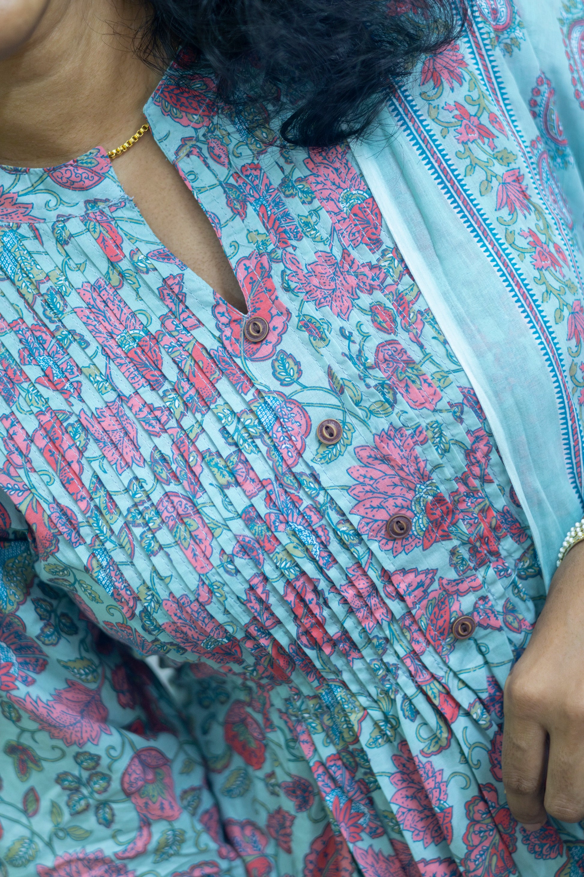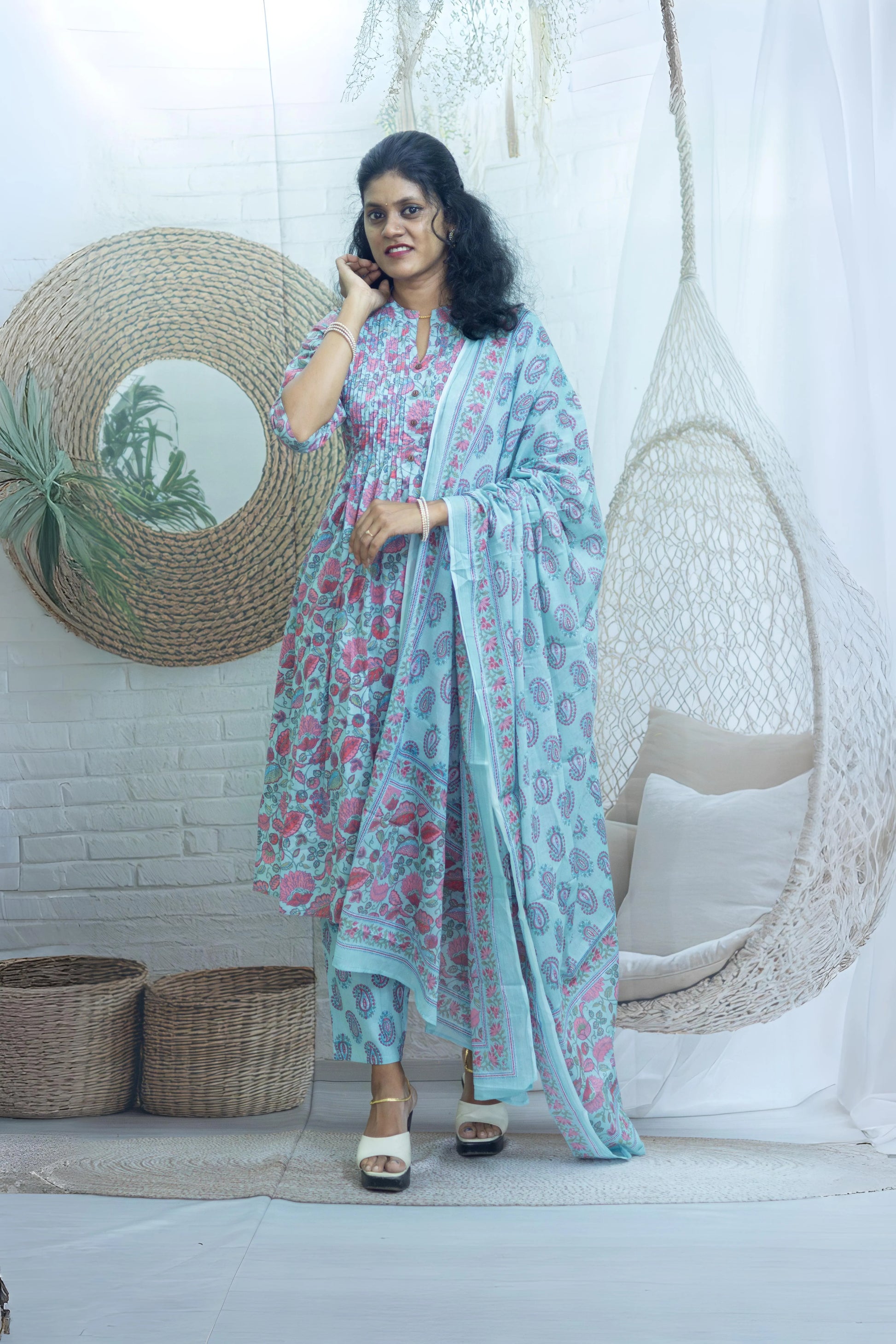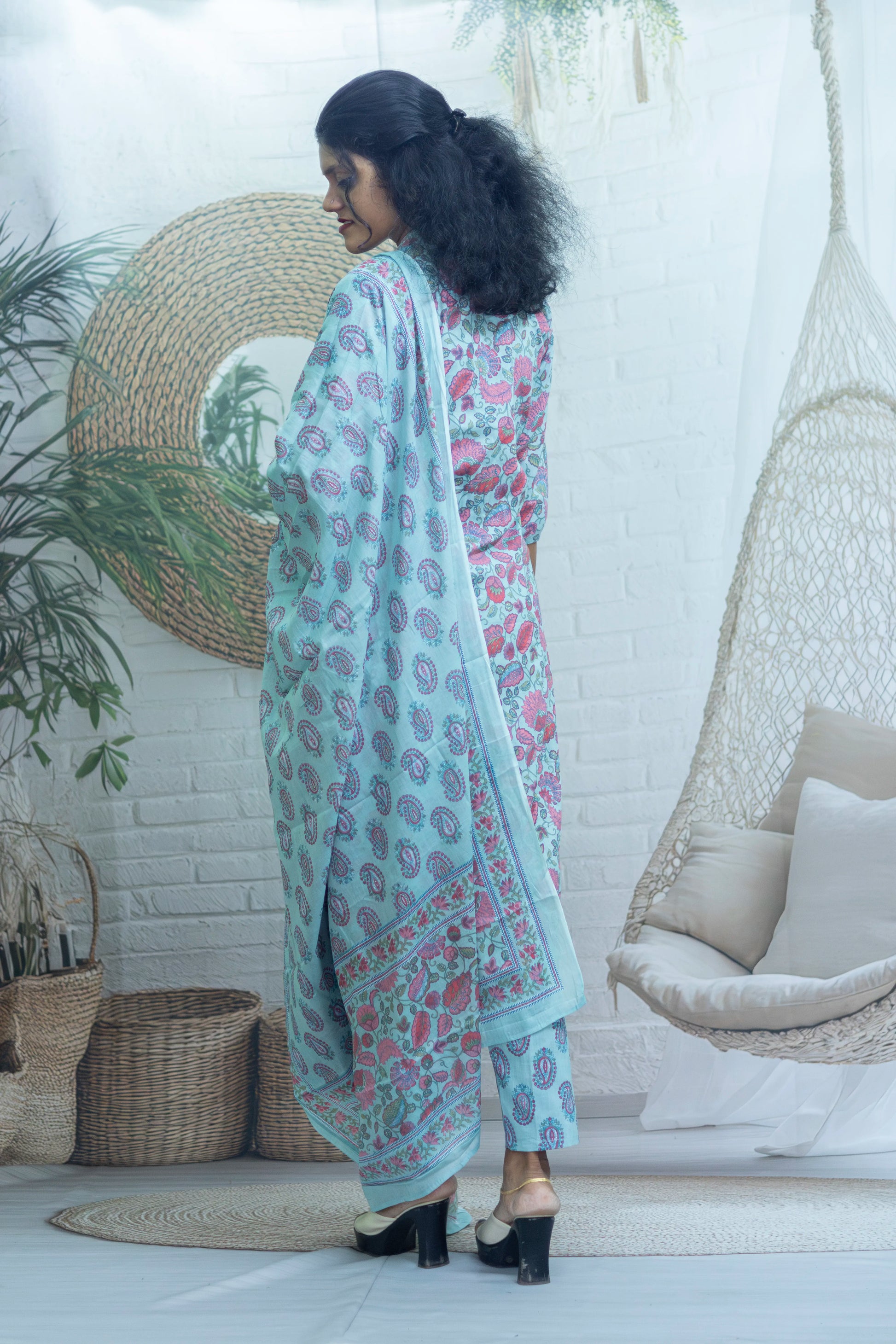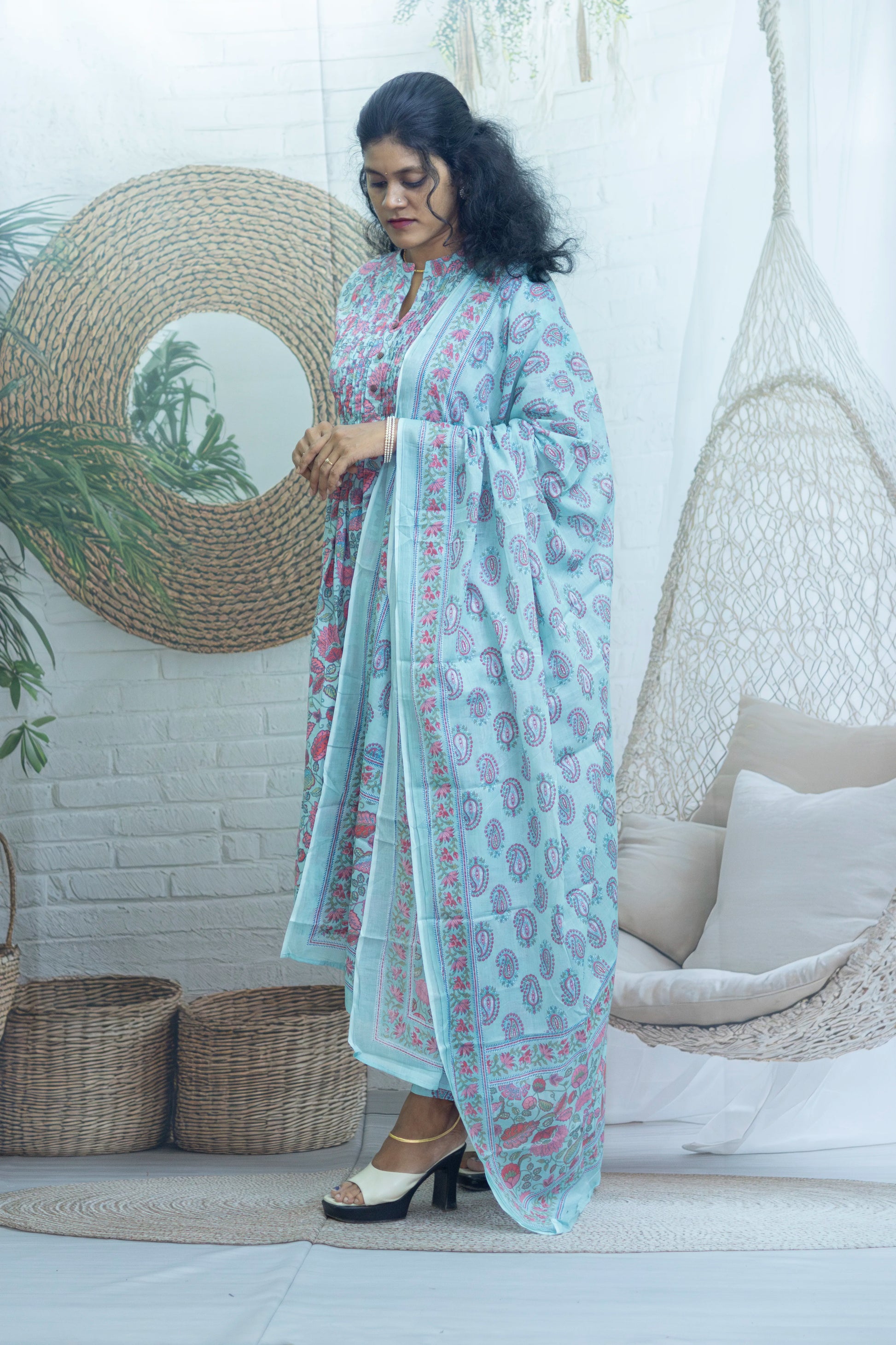 Blue Floral Printed Kurti with Bottom & Dupatta Set