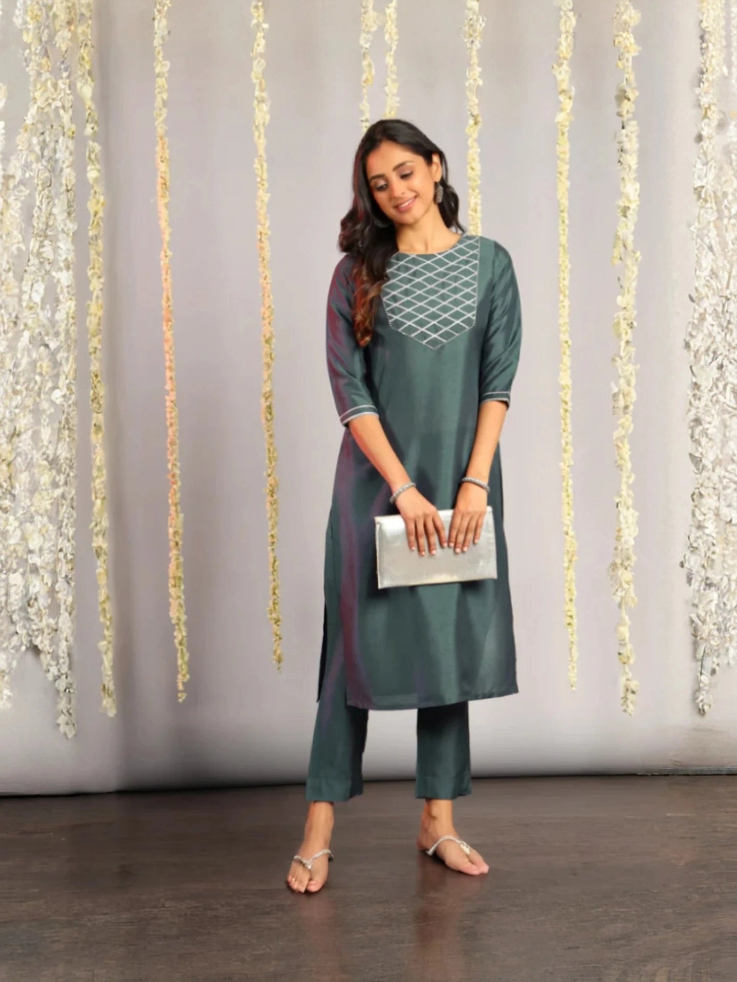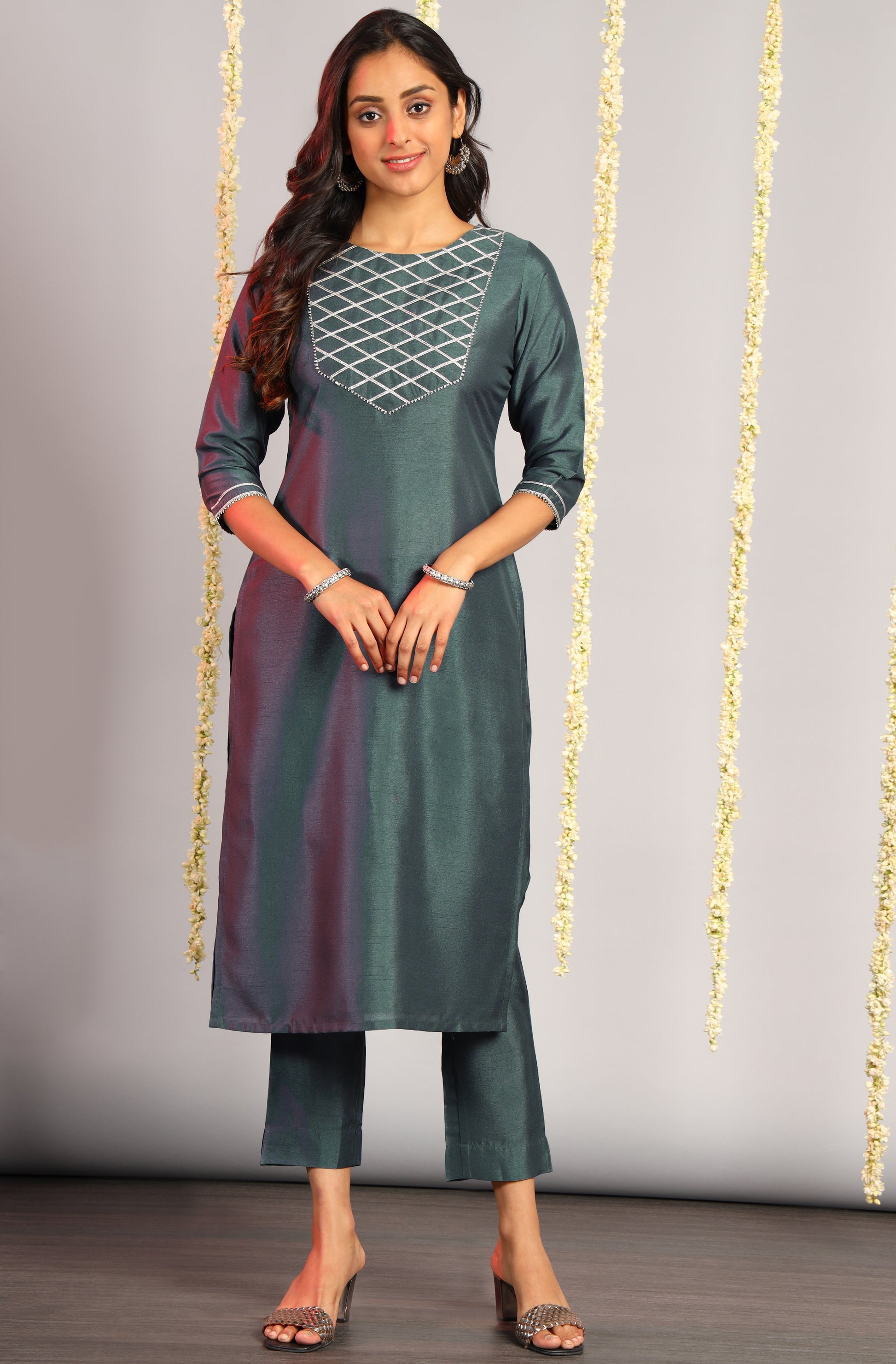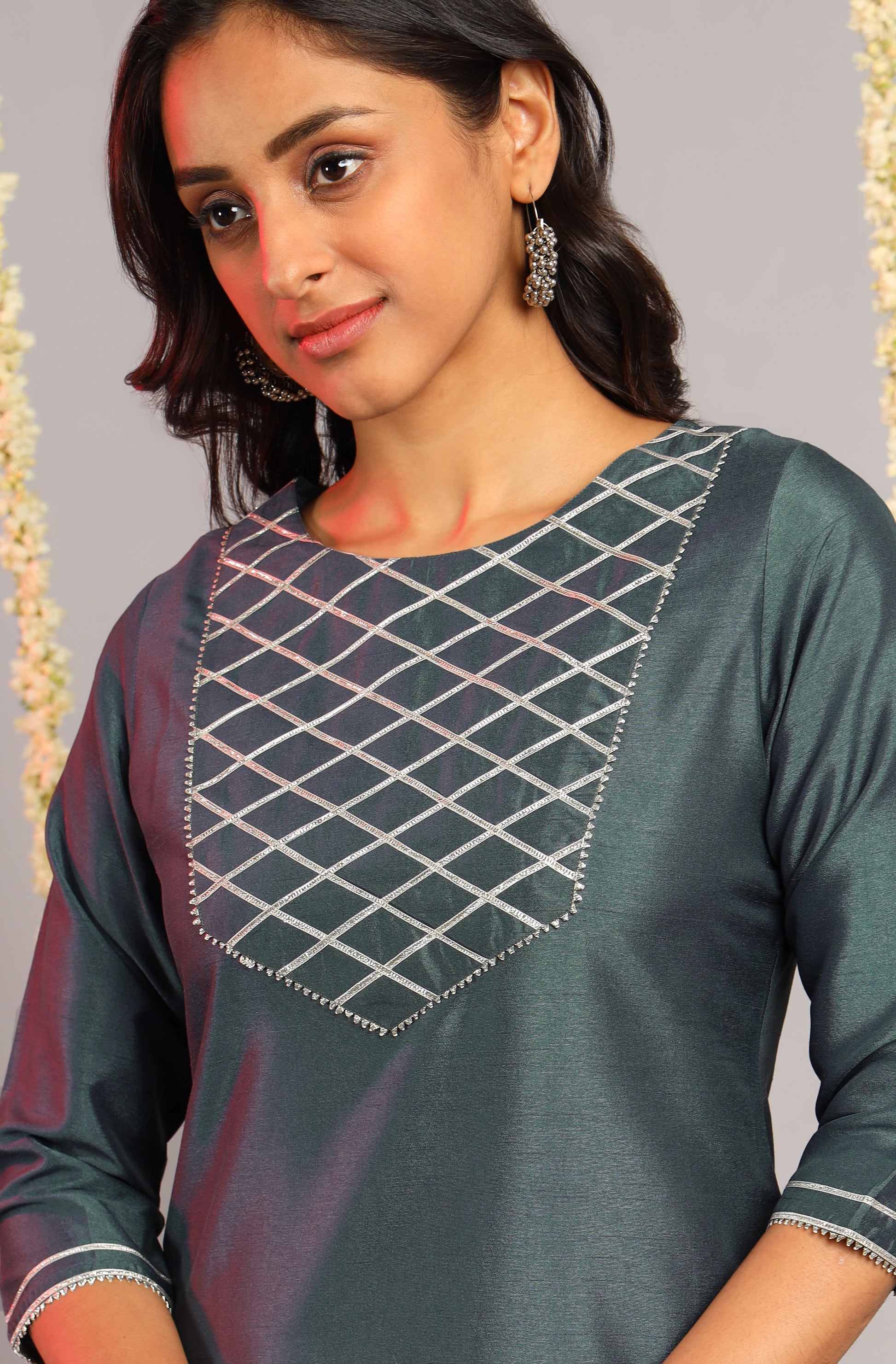 Grey Poly Silk Gotta Patti Yoke Design Kurti with Bottom Set