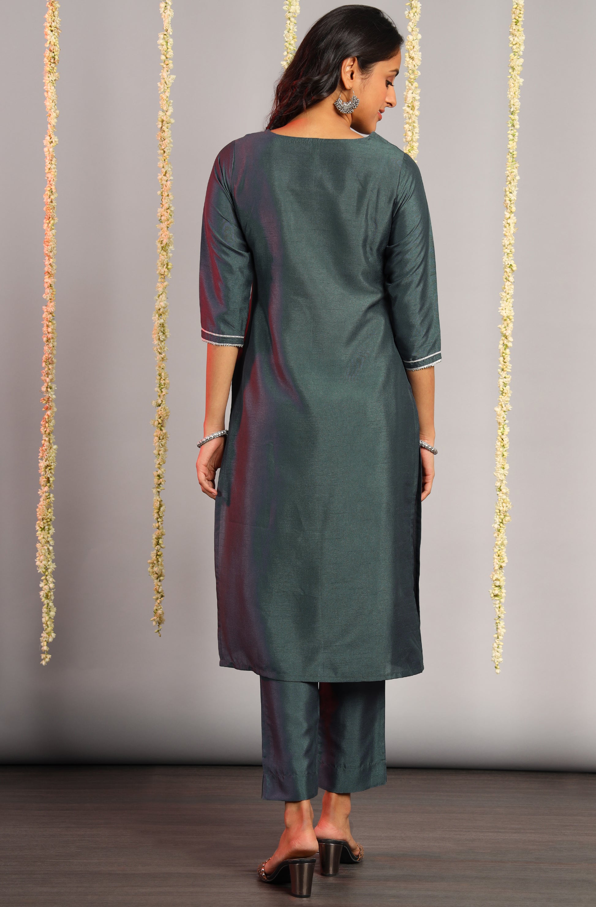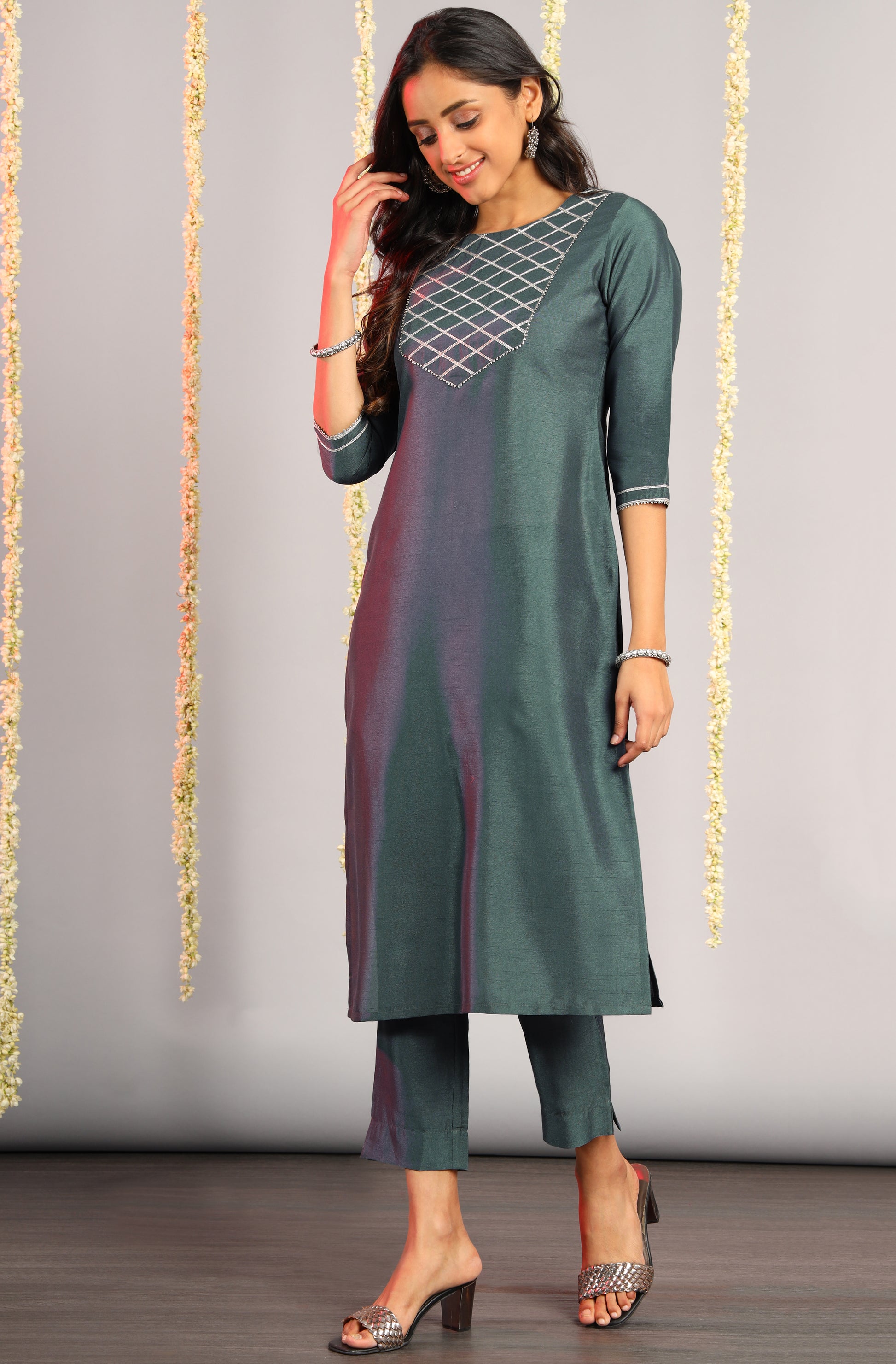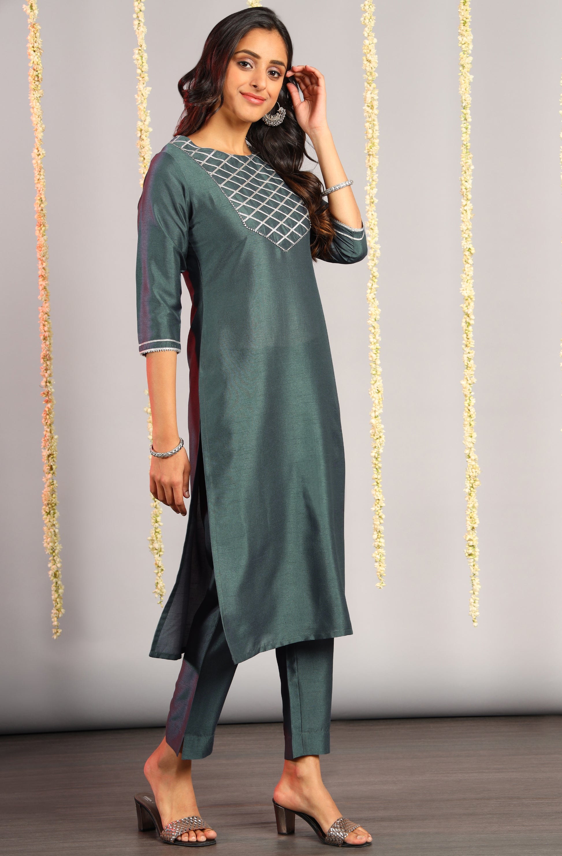 Grey Poly Silk Gotta Patti Yoke Design Kurti with Bottom Set