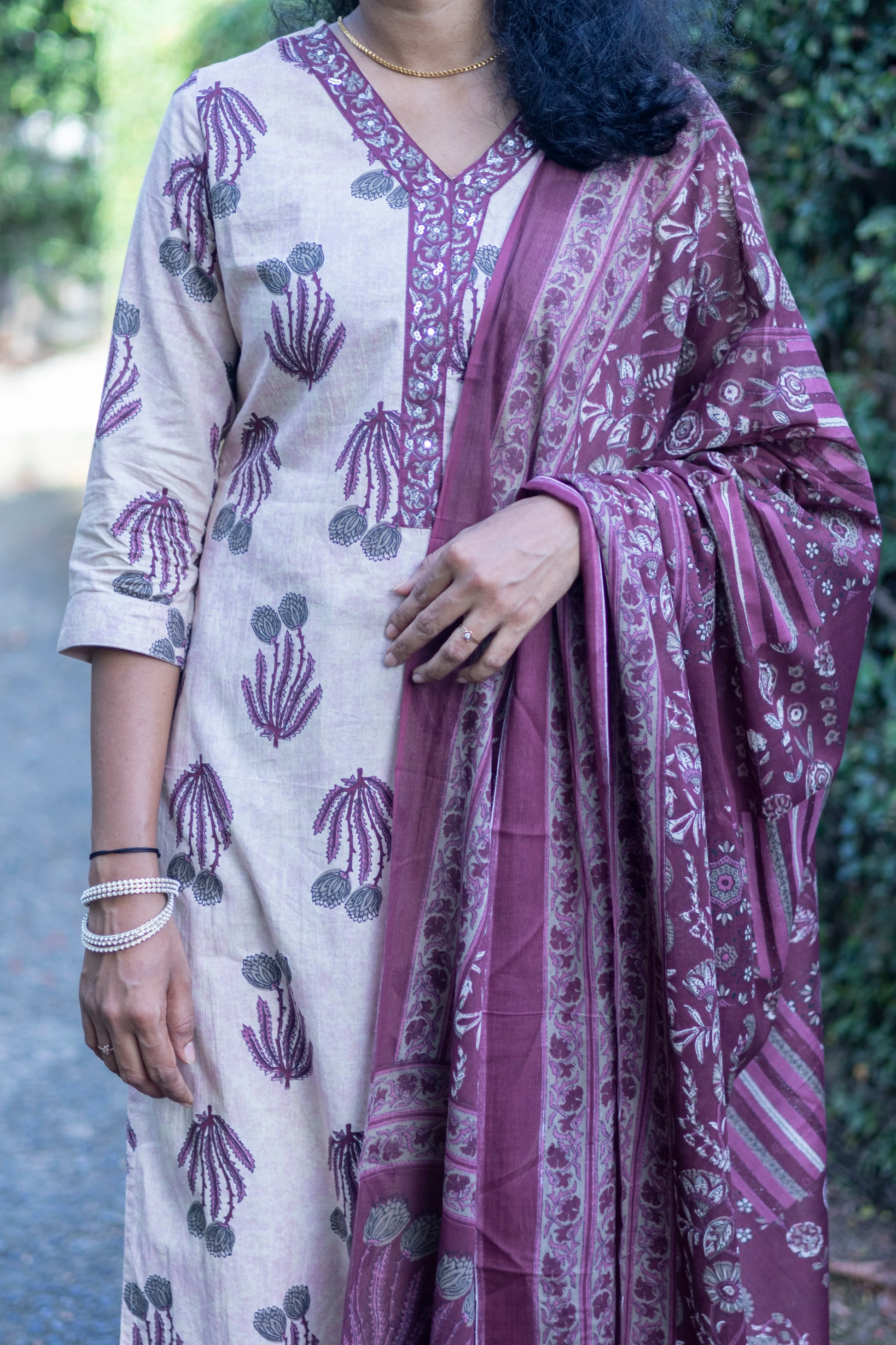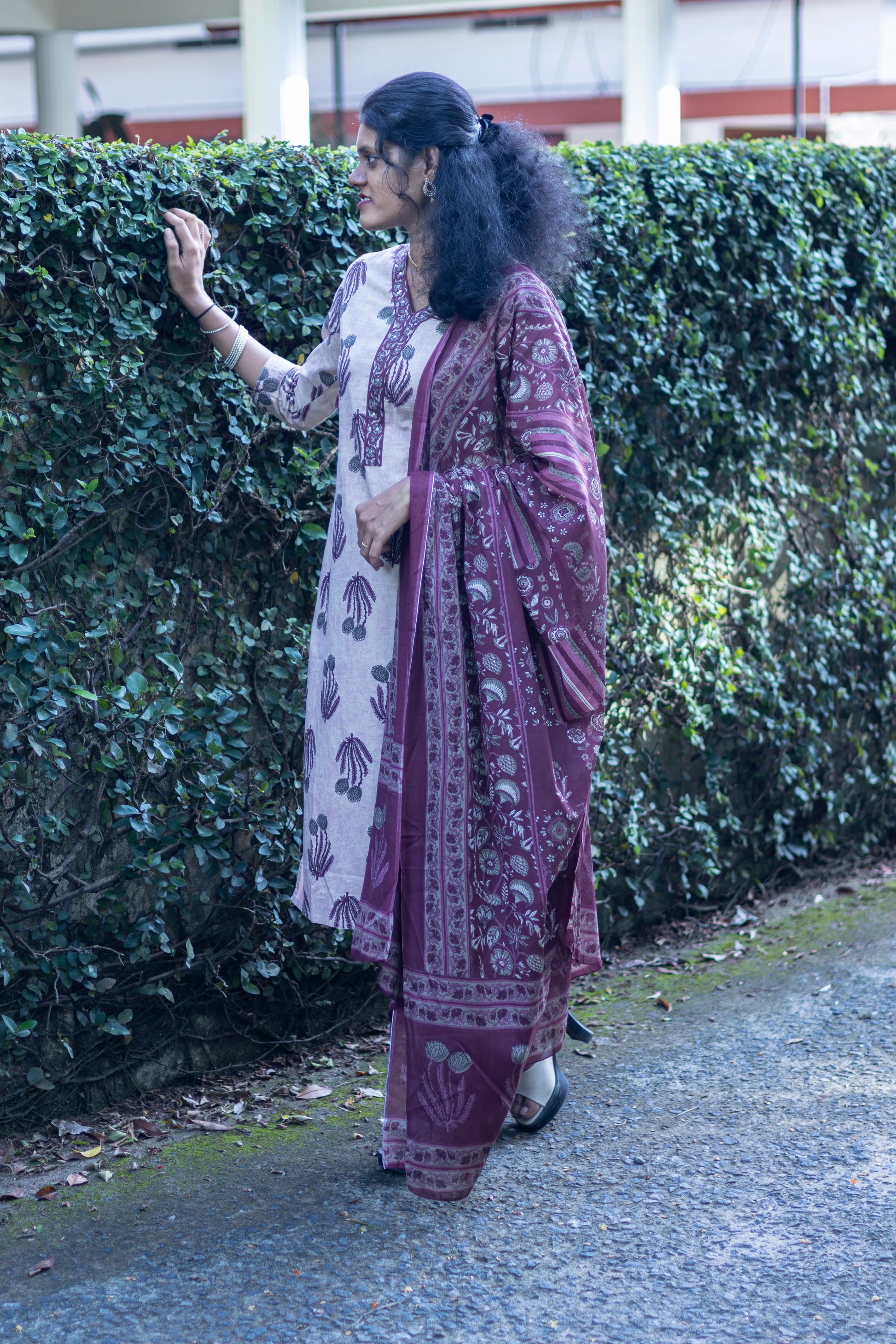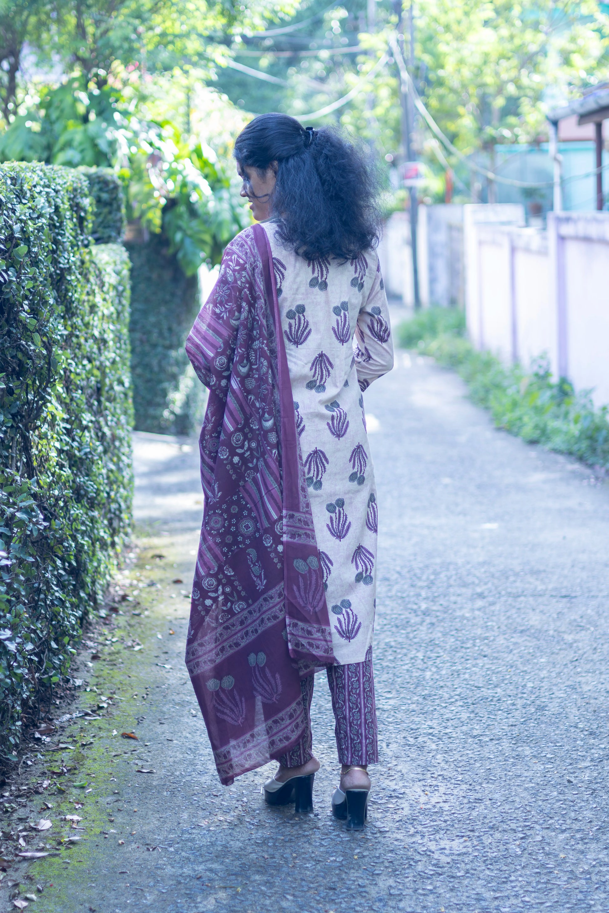 Creamer V-Neck with Floral Printed Kurti Pant Dupatta Set