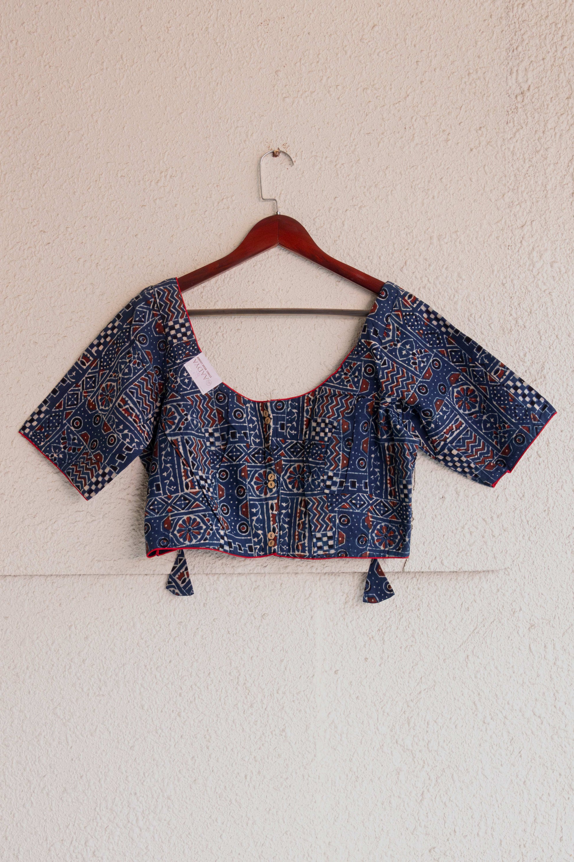 Navy Blue Color Round Neck Ajrakh Printed Blouse