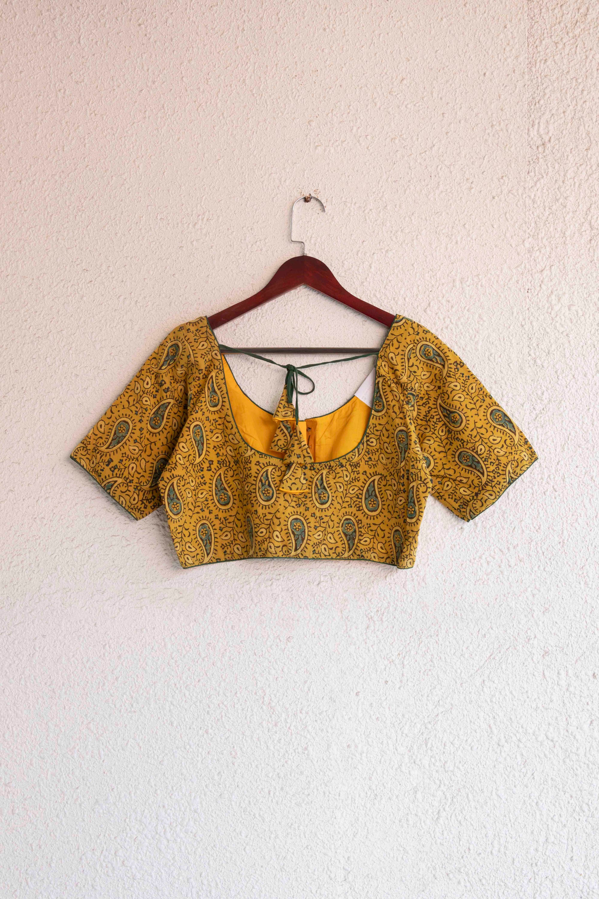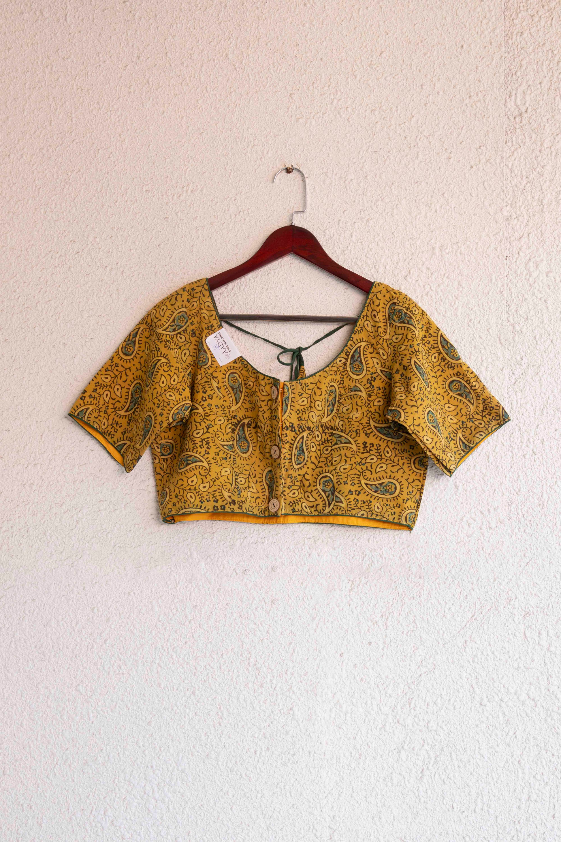 Yellow Color Mango Print Ajrakh Blouse with Round Neck