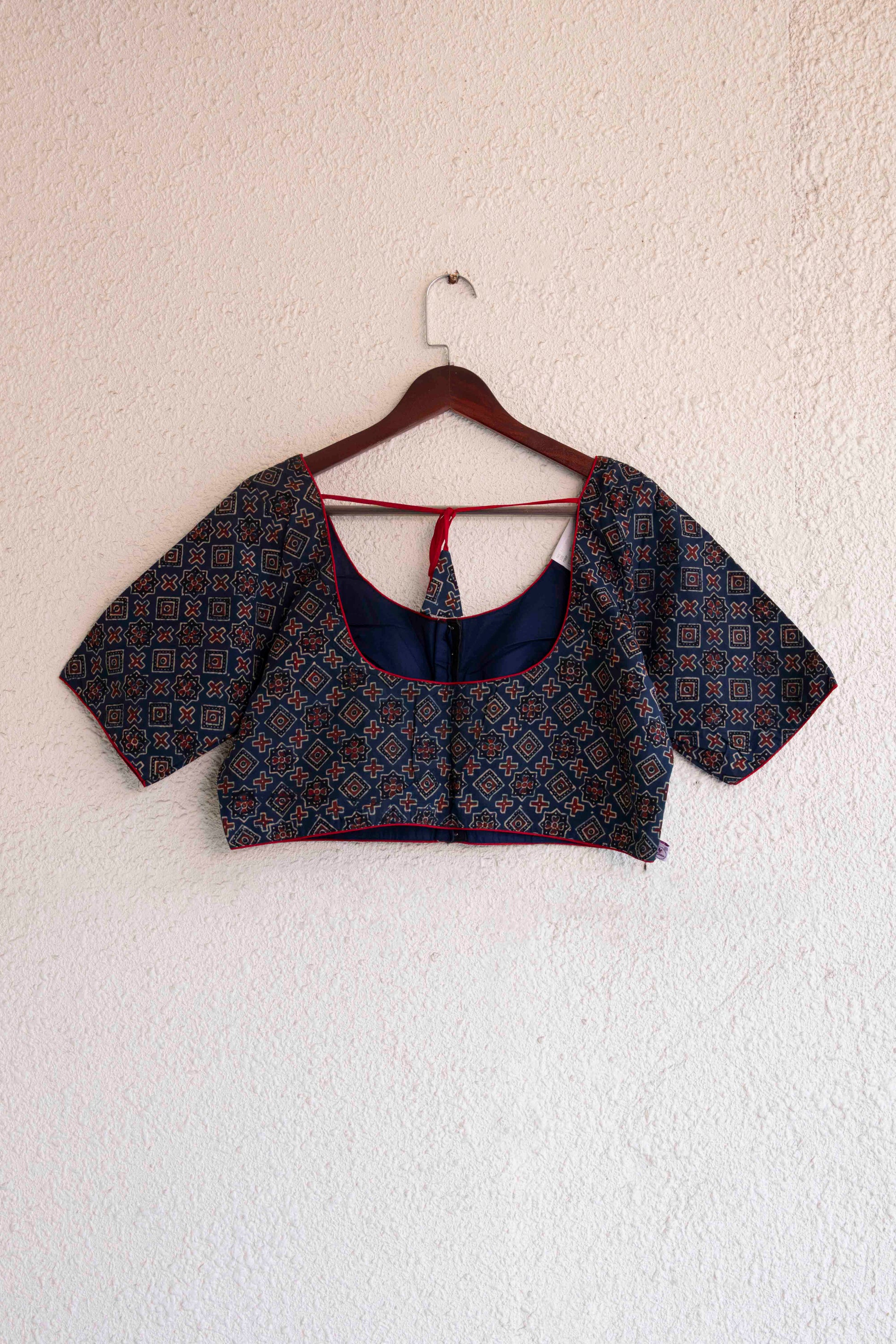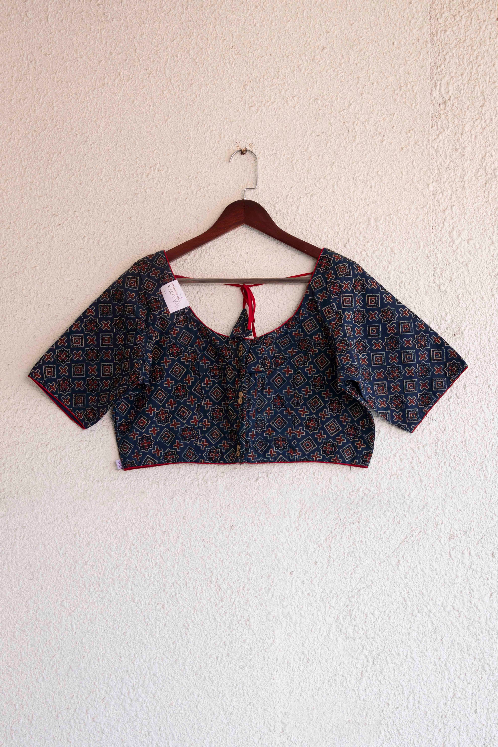 Navy Blue Color Block Printed Ajrakh Blouse with Round Neck