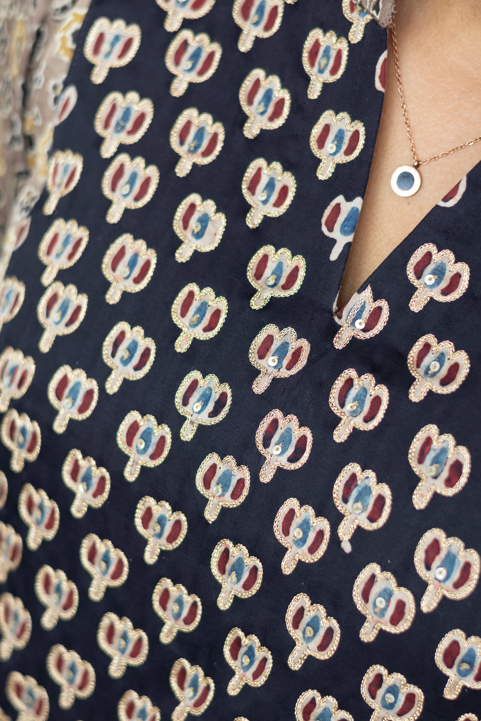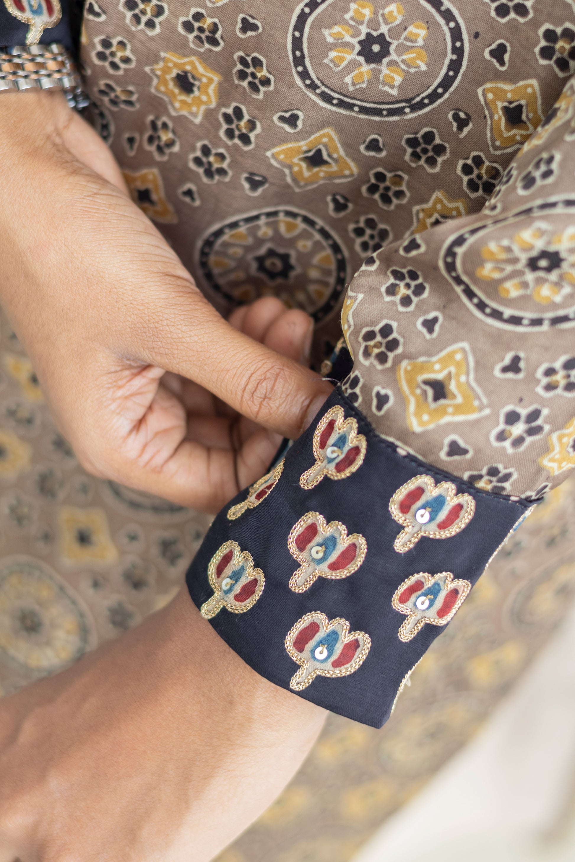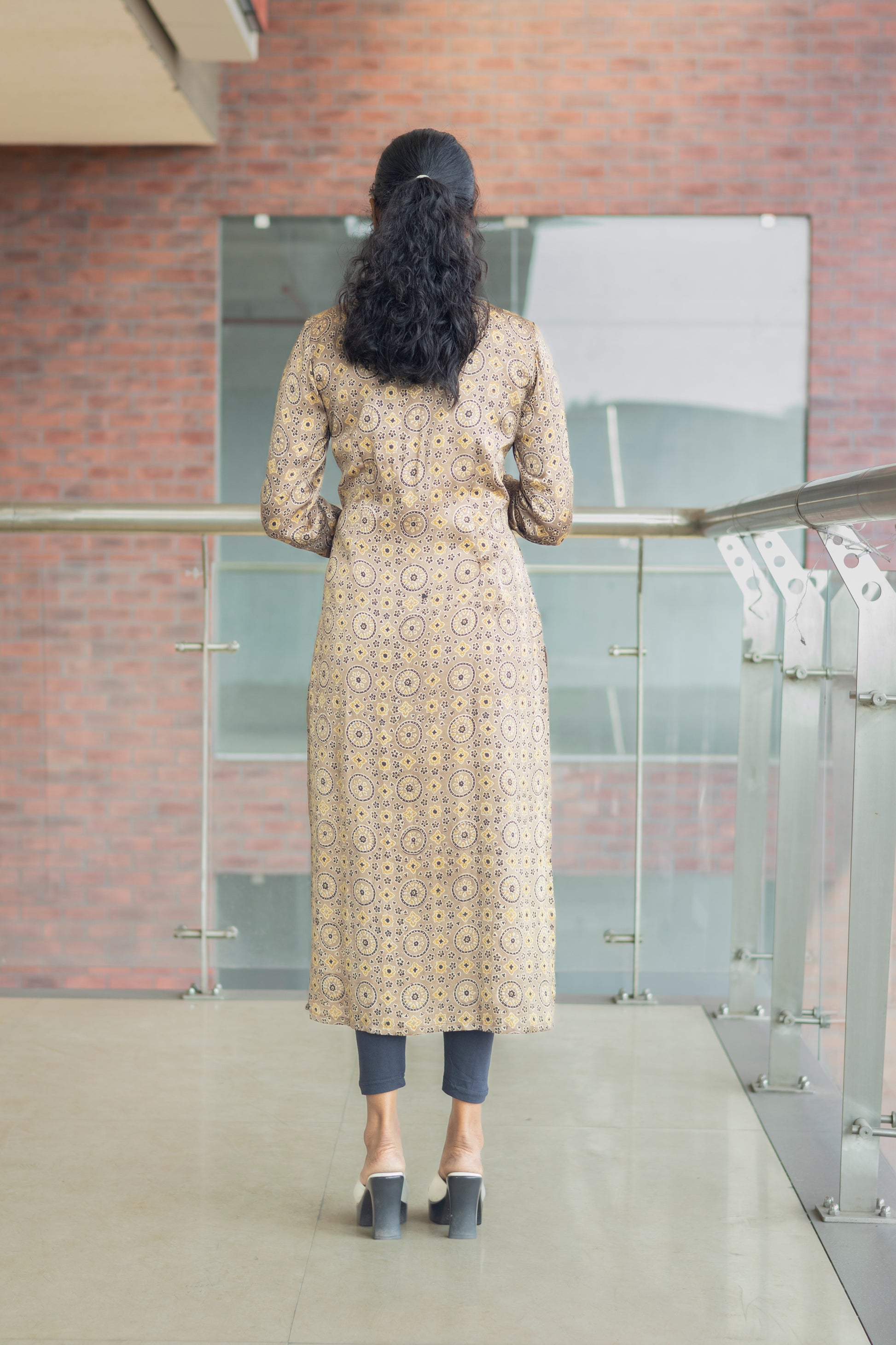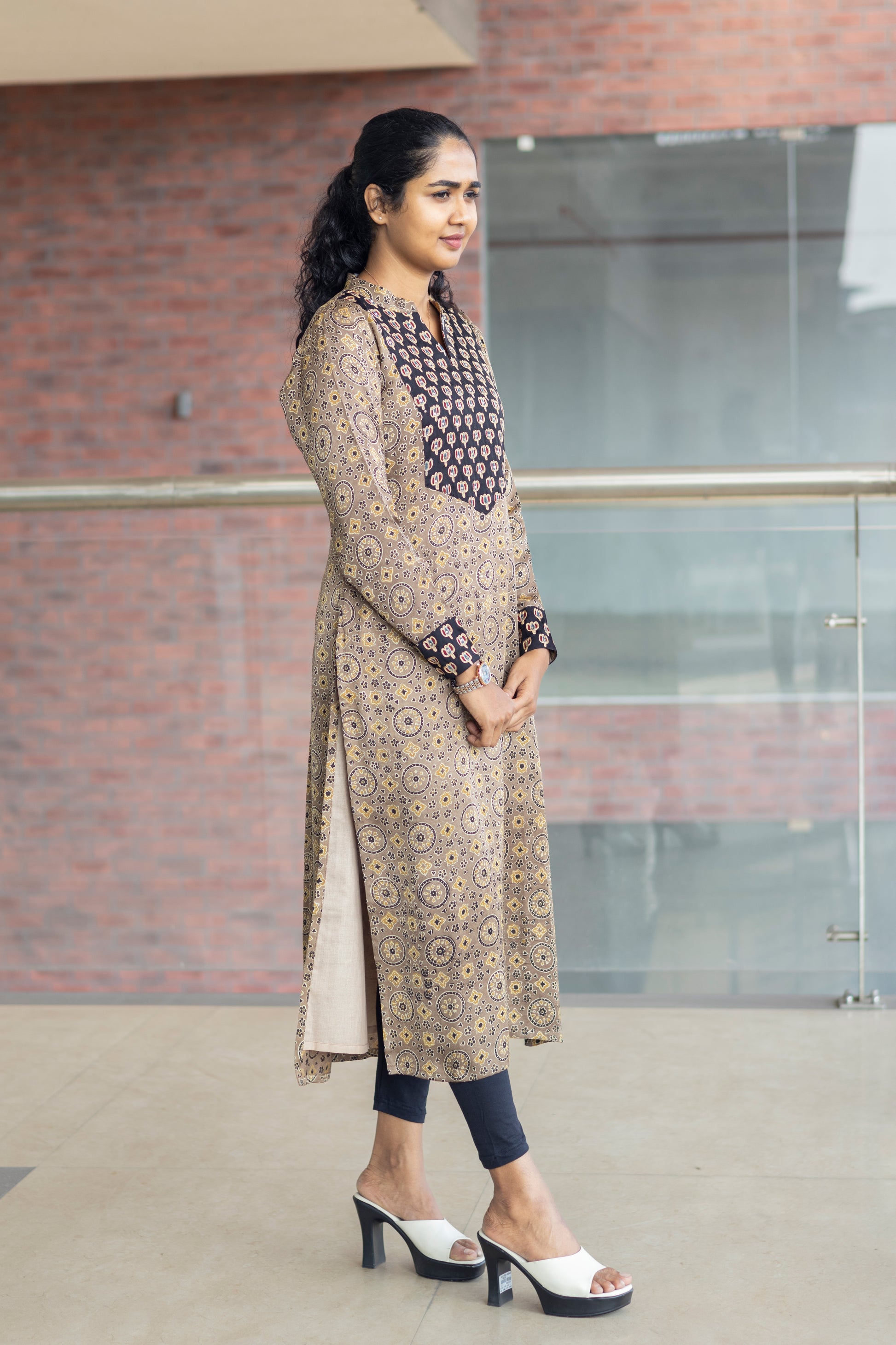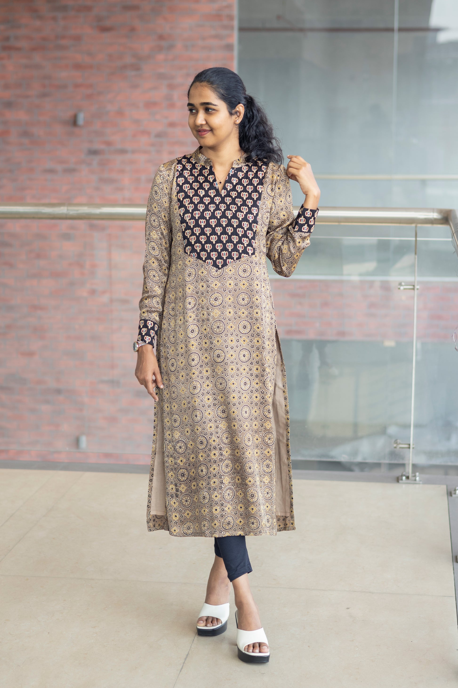 Modal Silk Biege Collar Neck Kurti Black Yoke