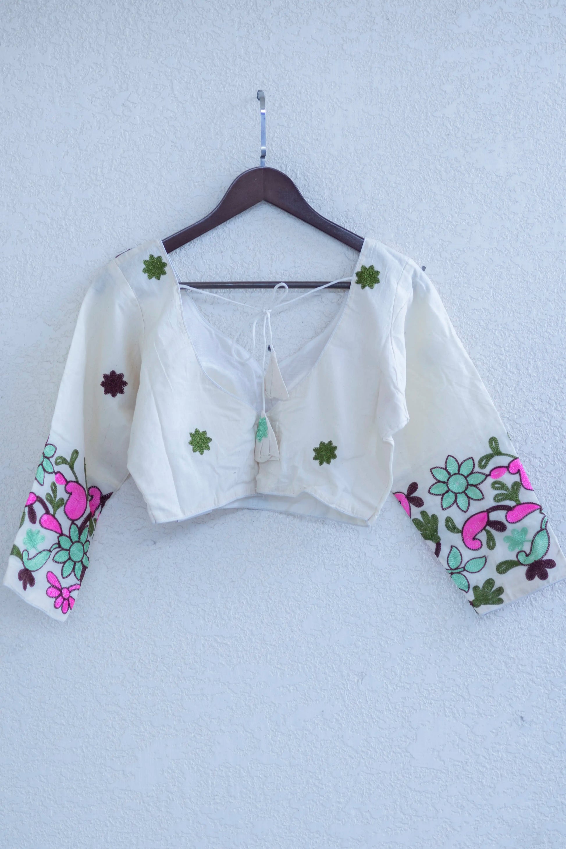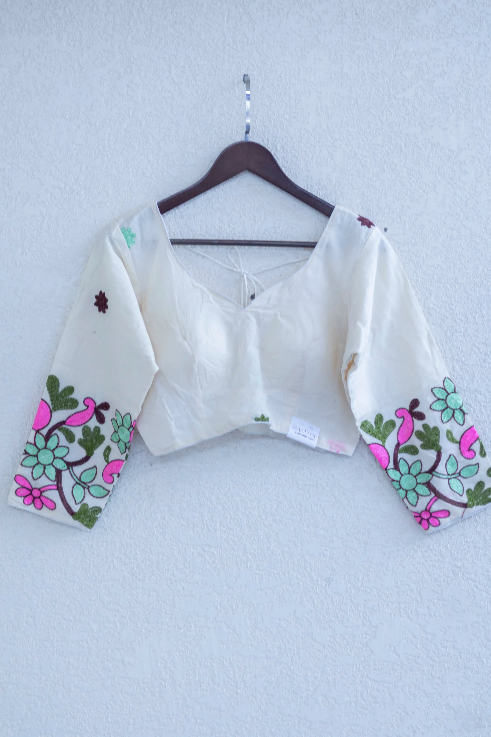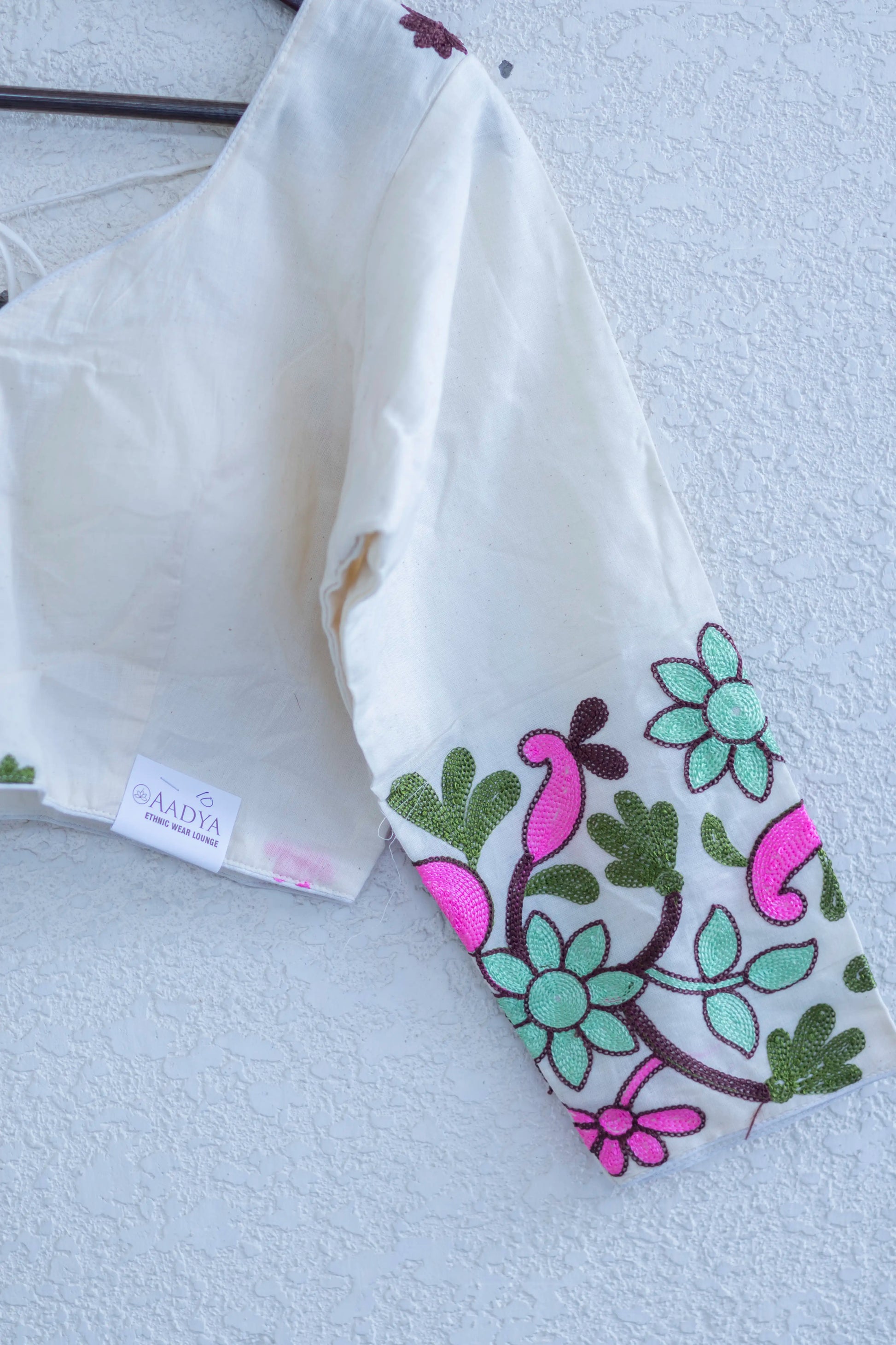 White Leaf Neck Khadi Cotton Full Sleeve Blouse