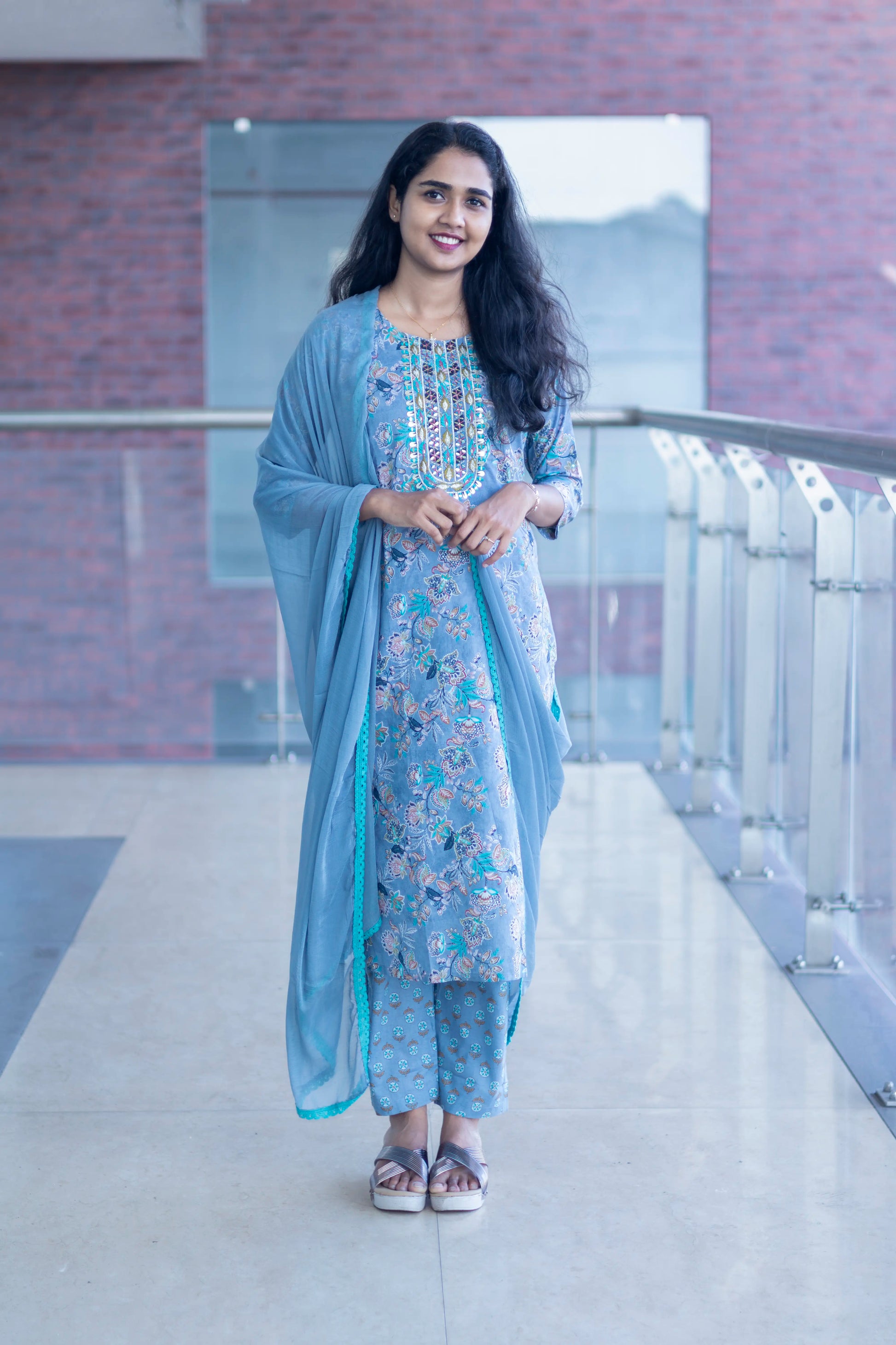 Grey Kurti Set with Round Neck Highlighting Embroidery work