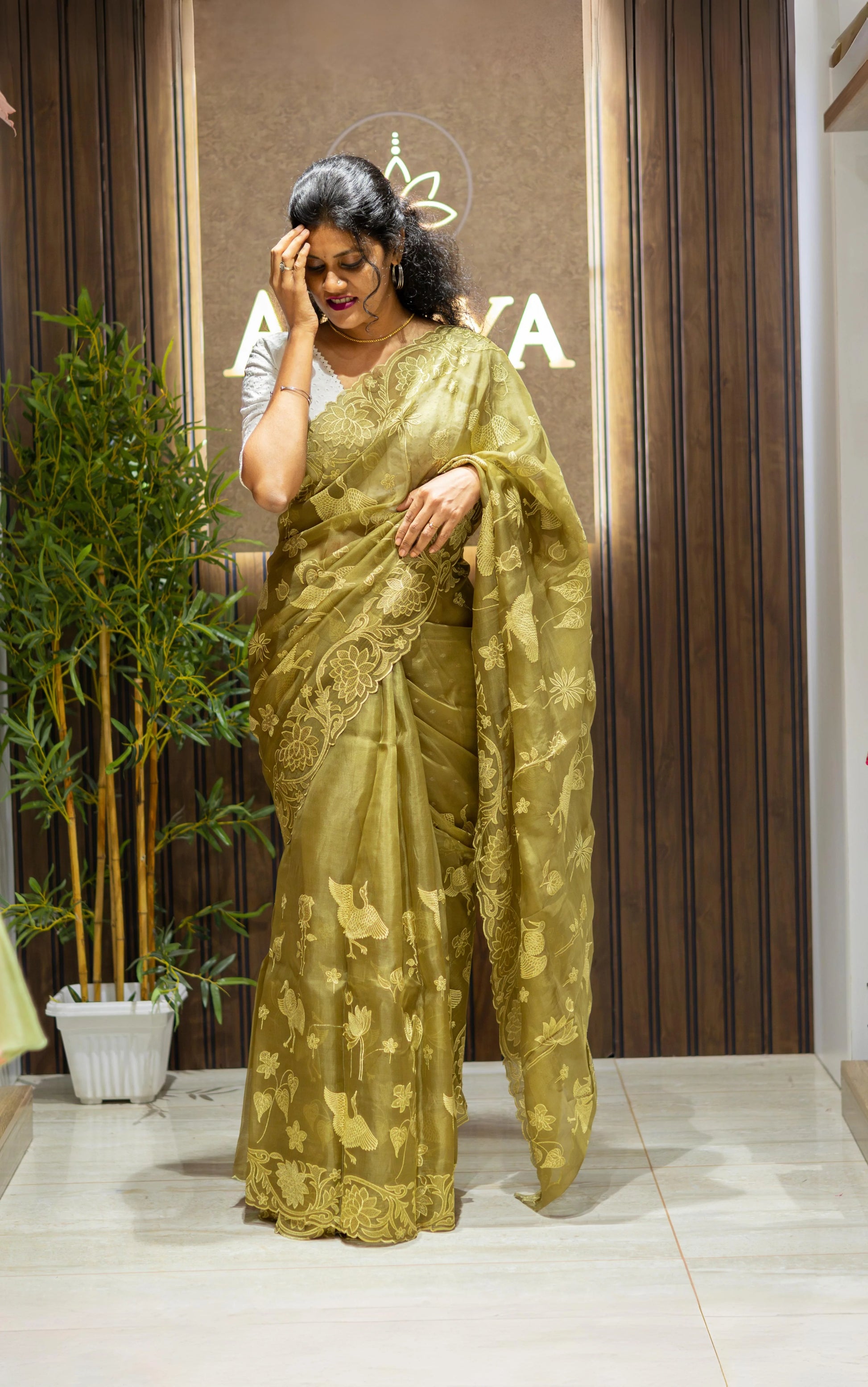 Olive Green Organza Saree With Embroidered Work