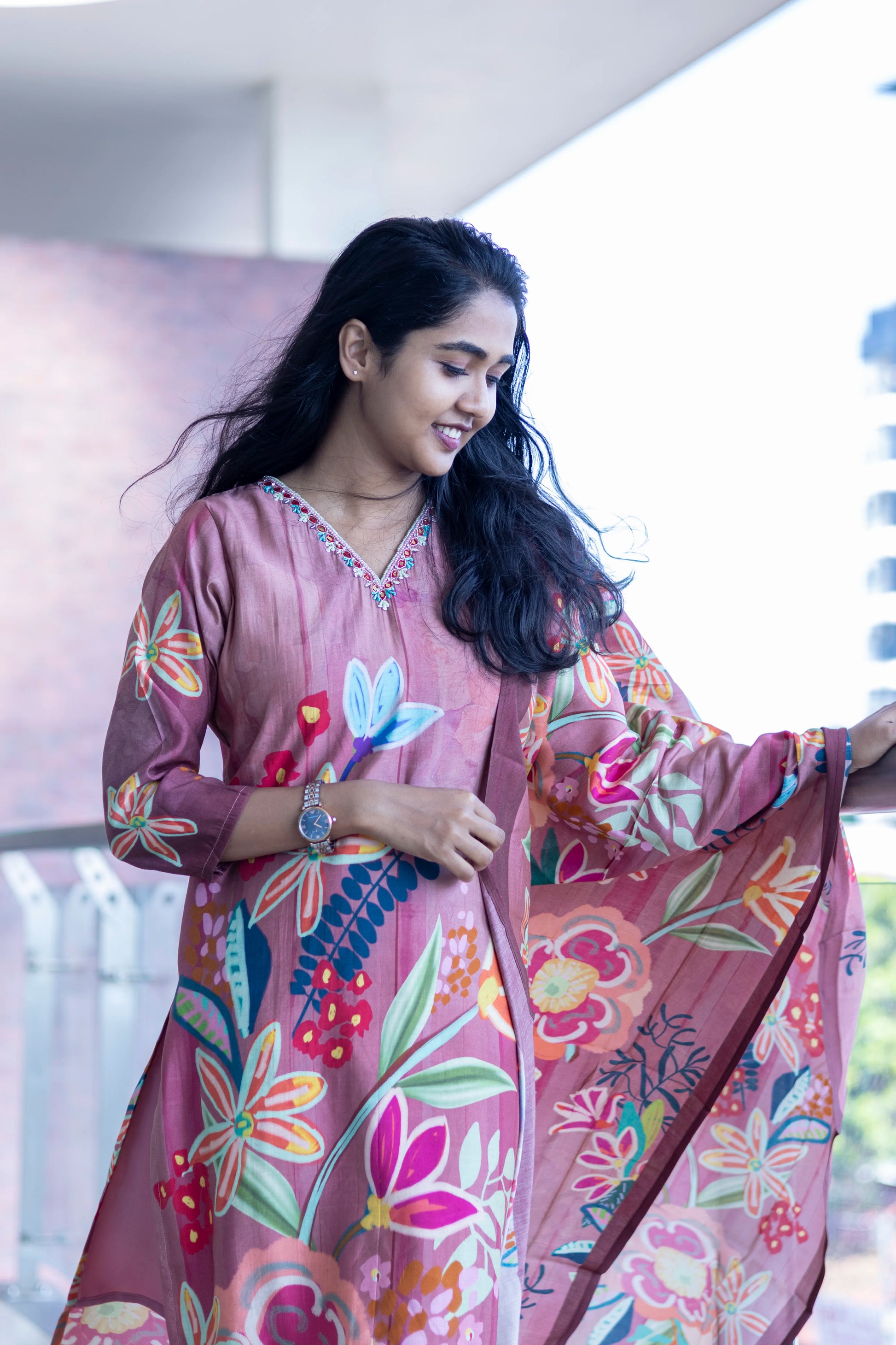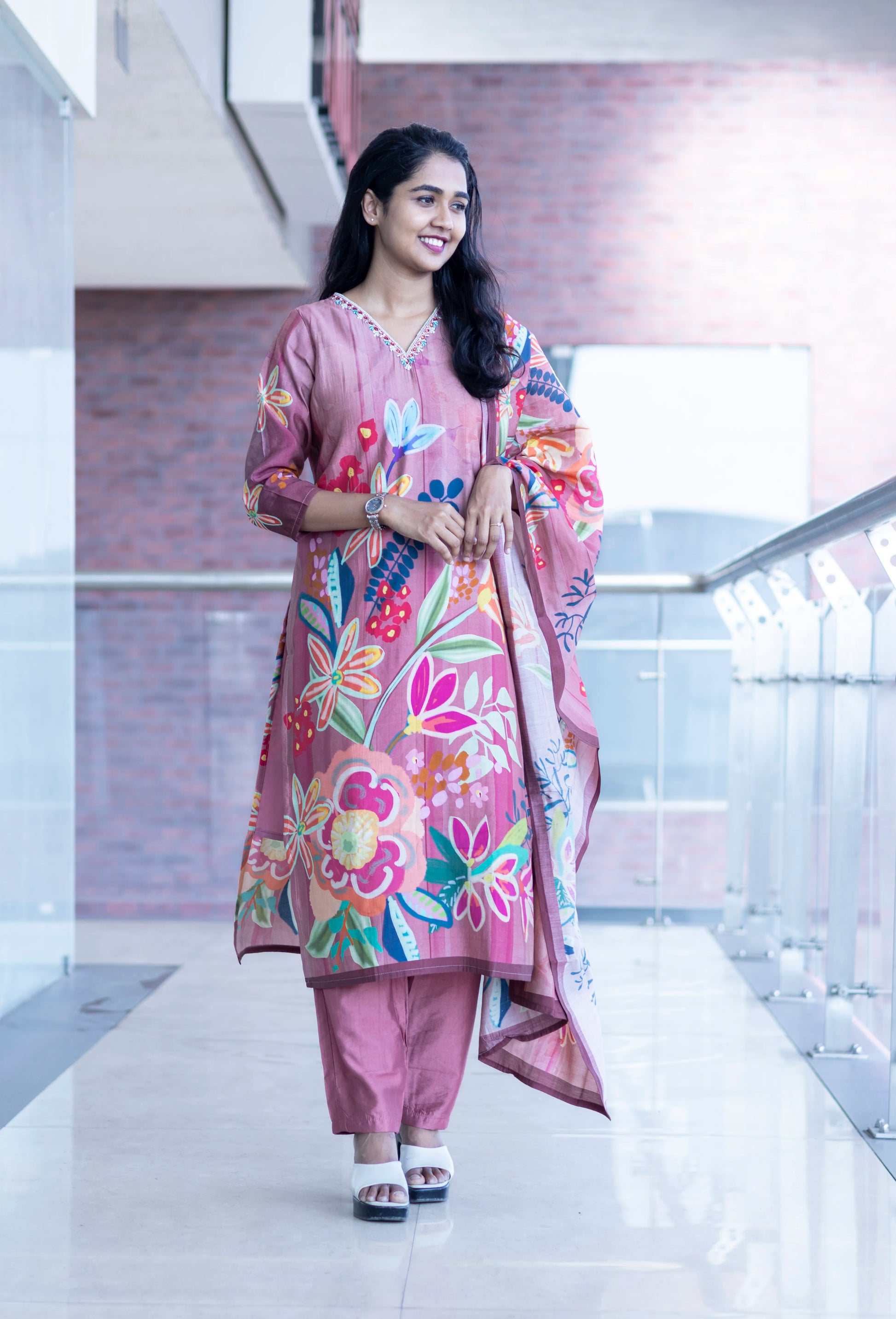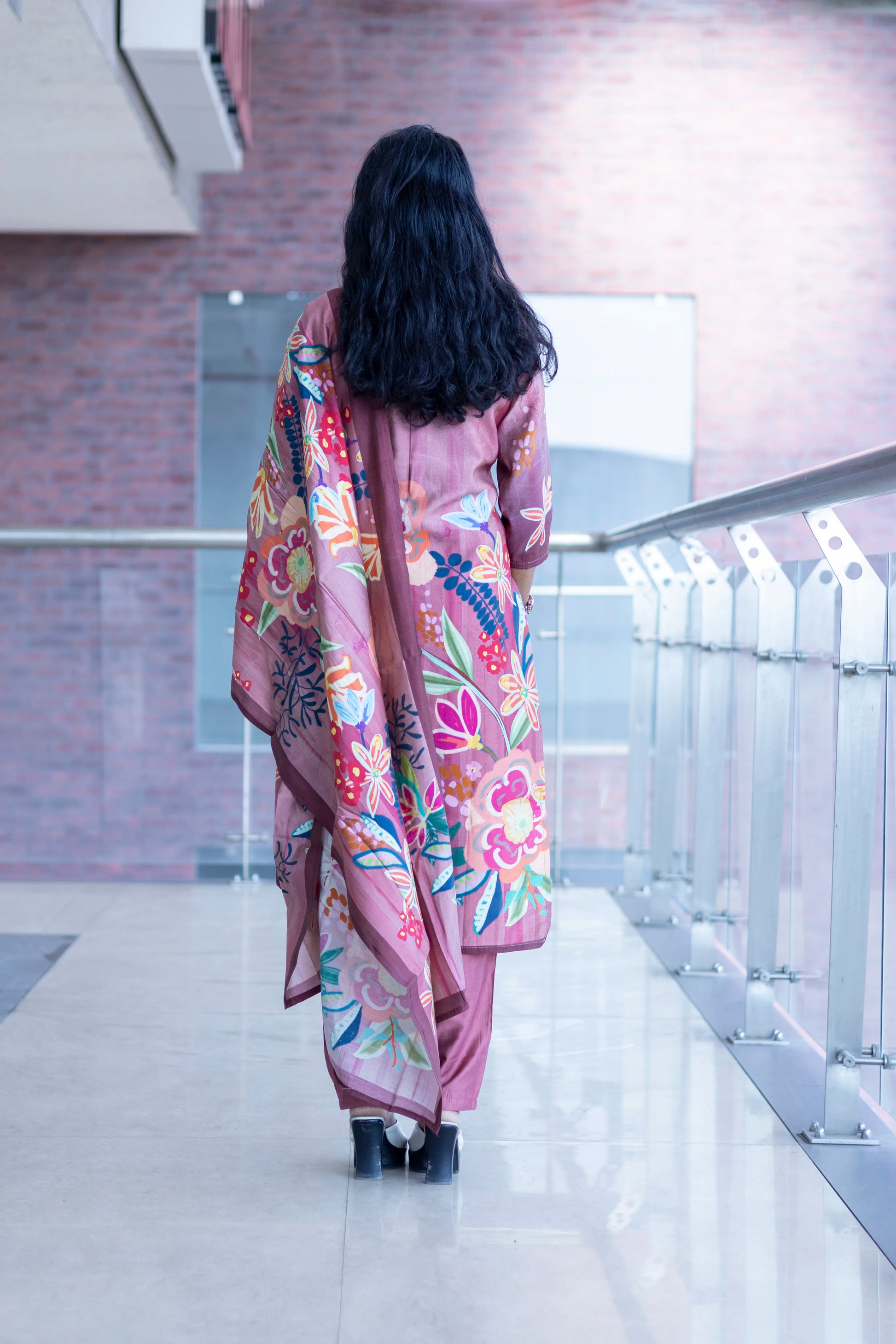 Onion Pink Floral Printed Modal Silk Kurta pant with Dupatta Set