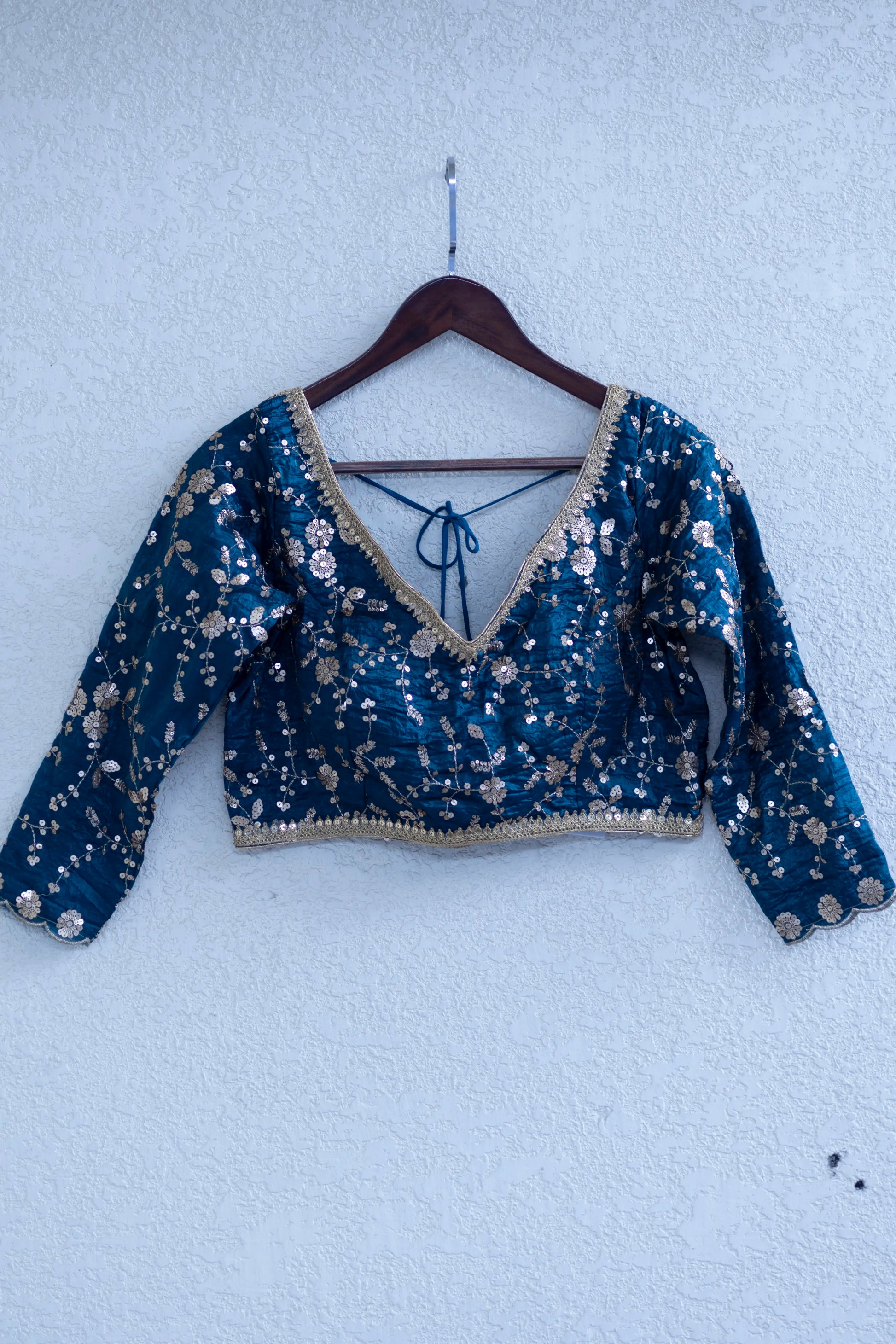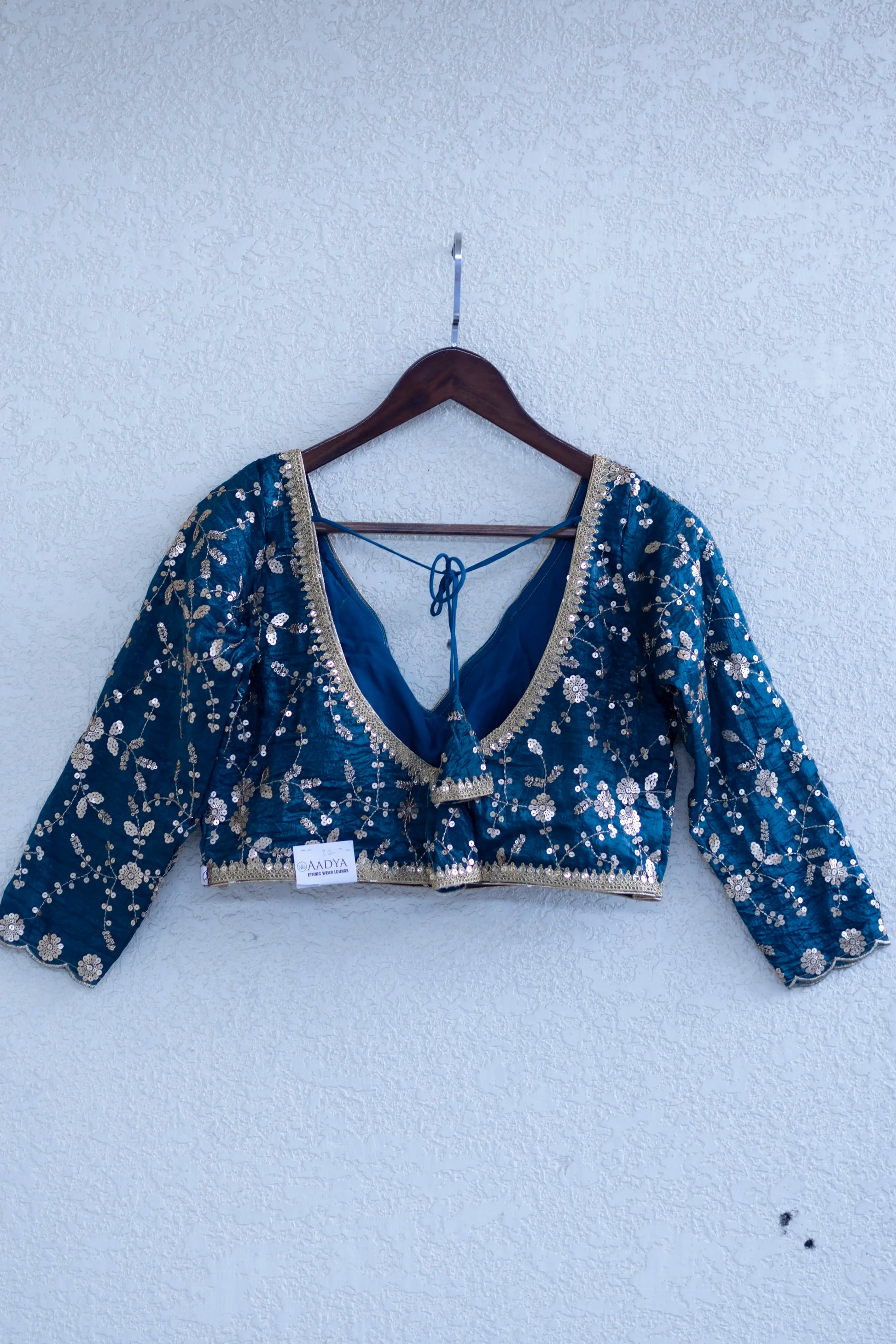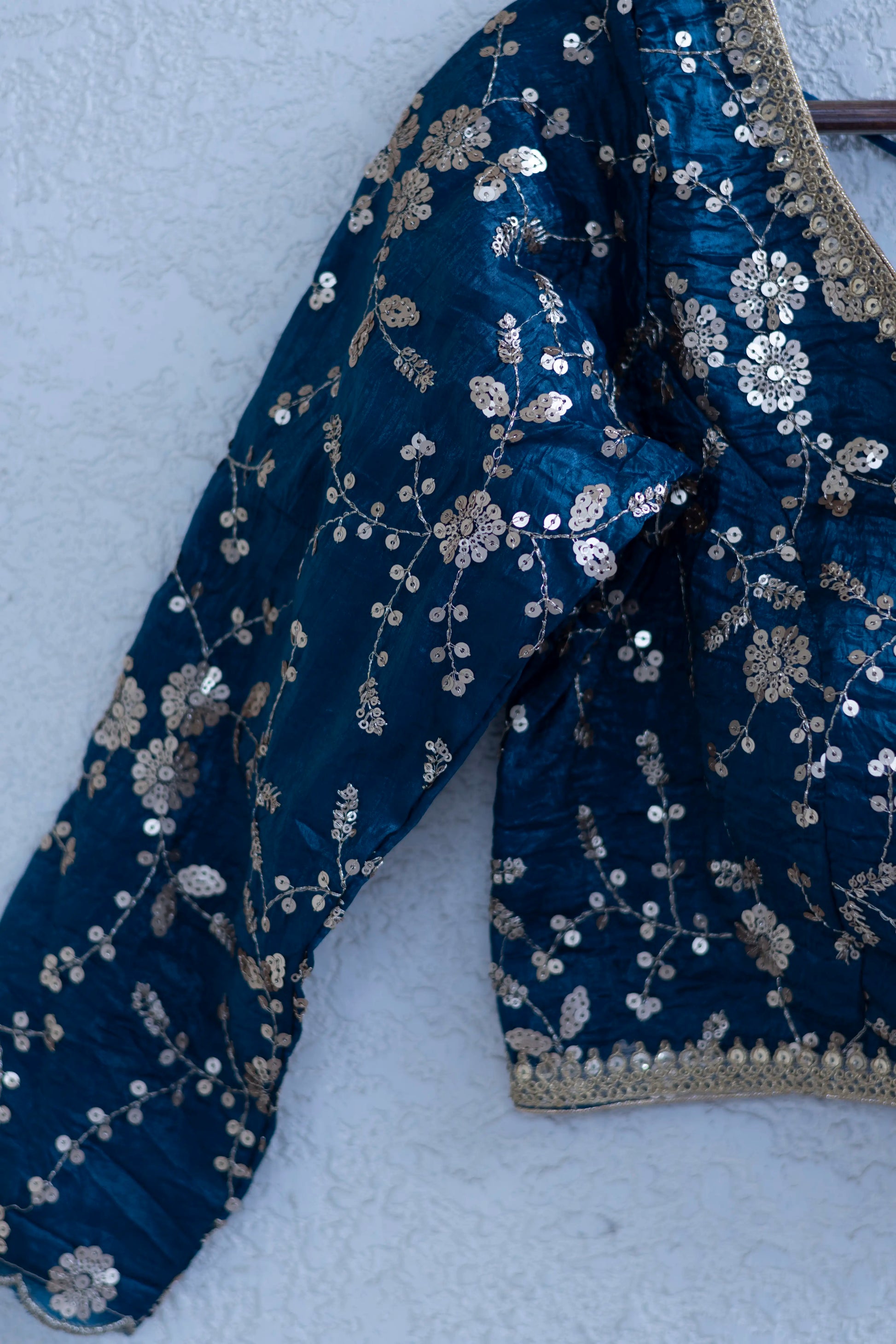 Peacock Blue Leaf Neck Crushed Silk Full Sleeve Blouse