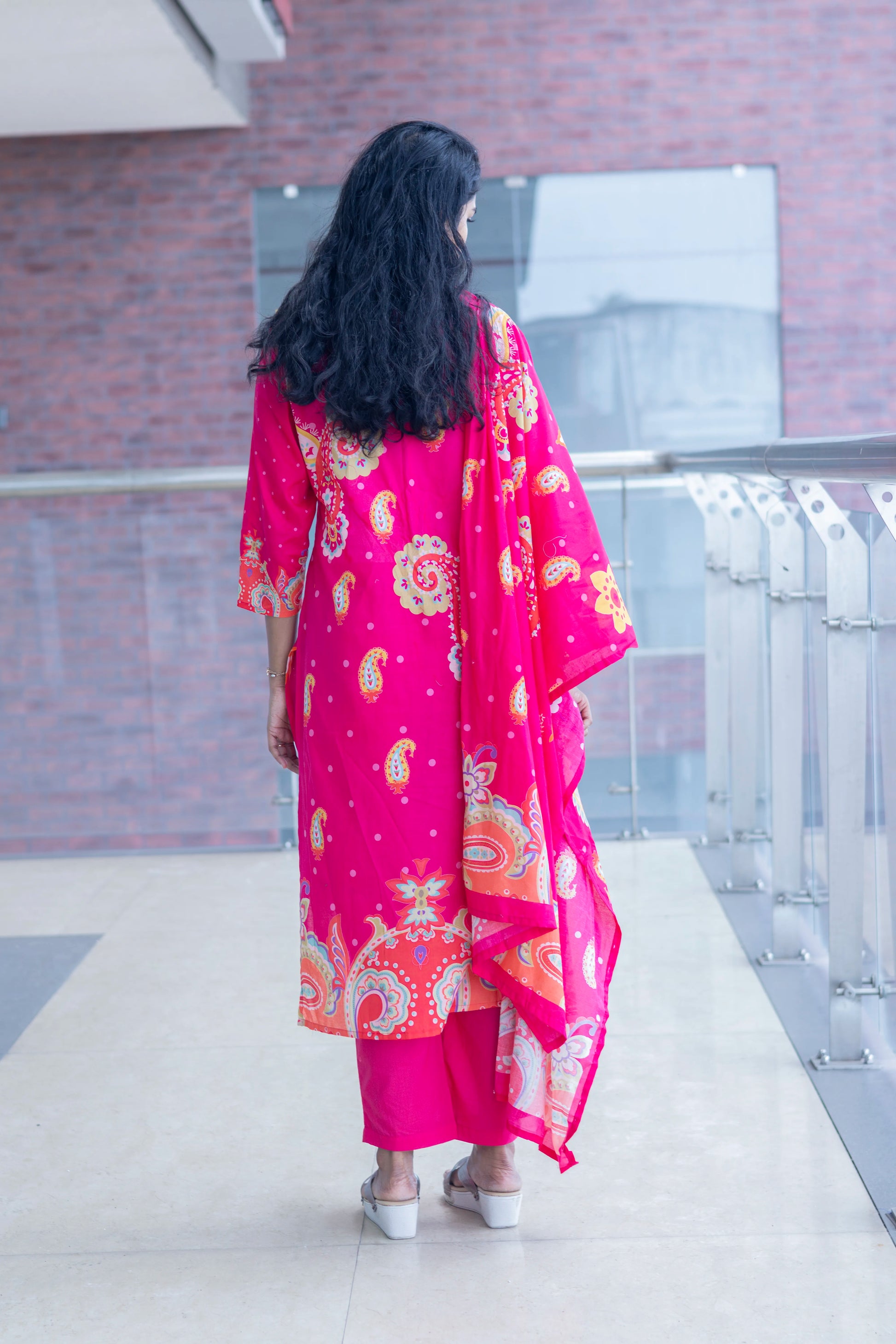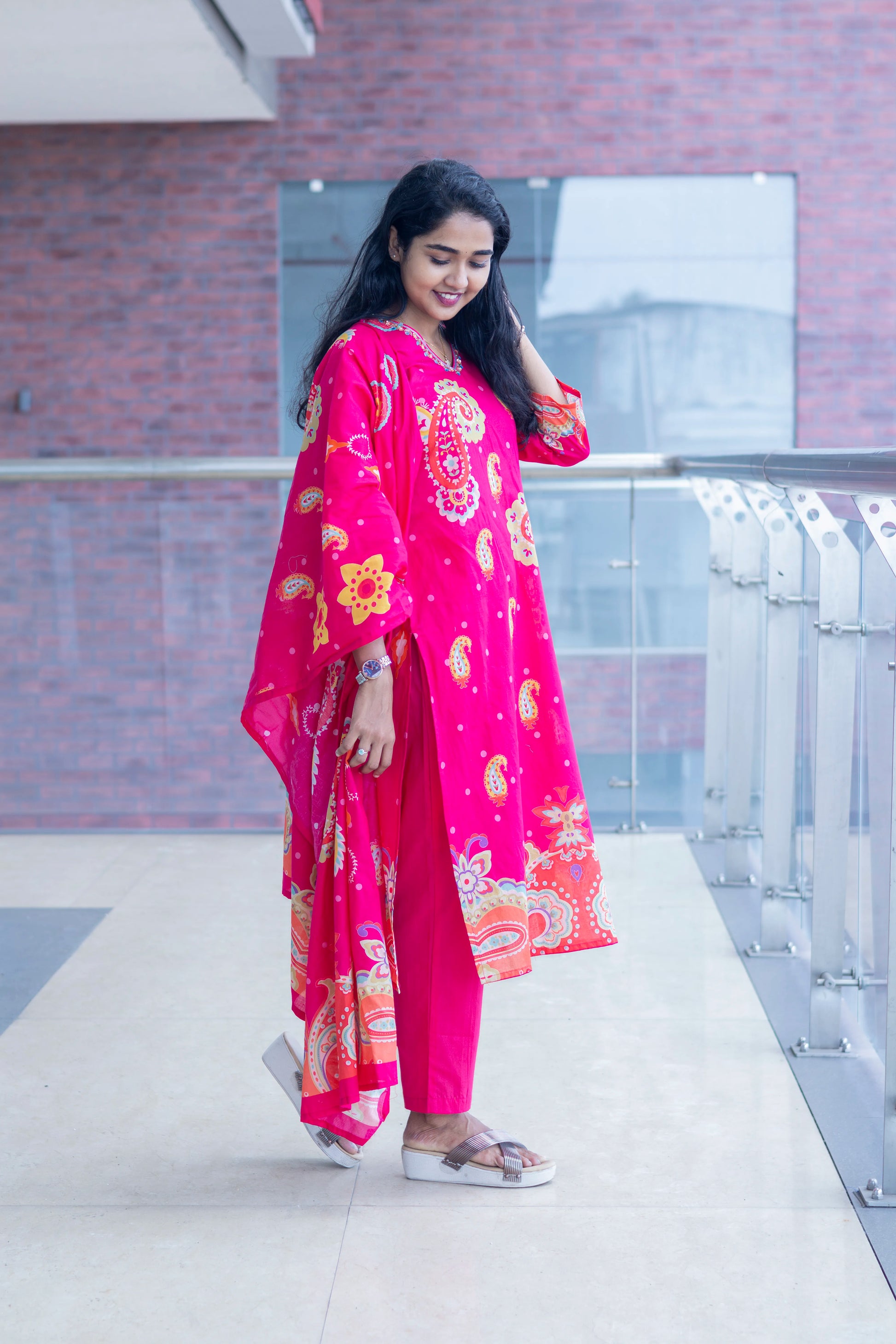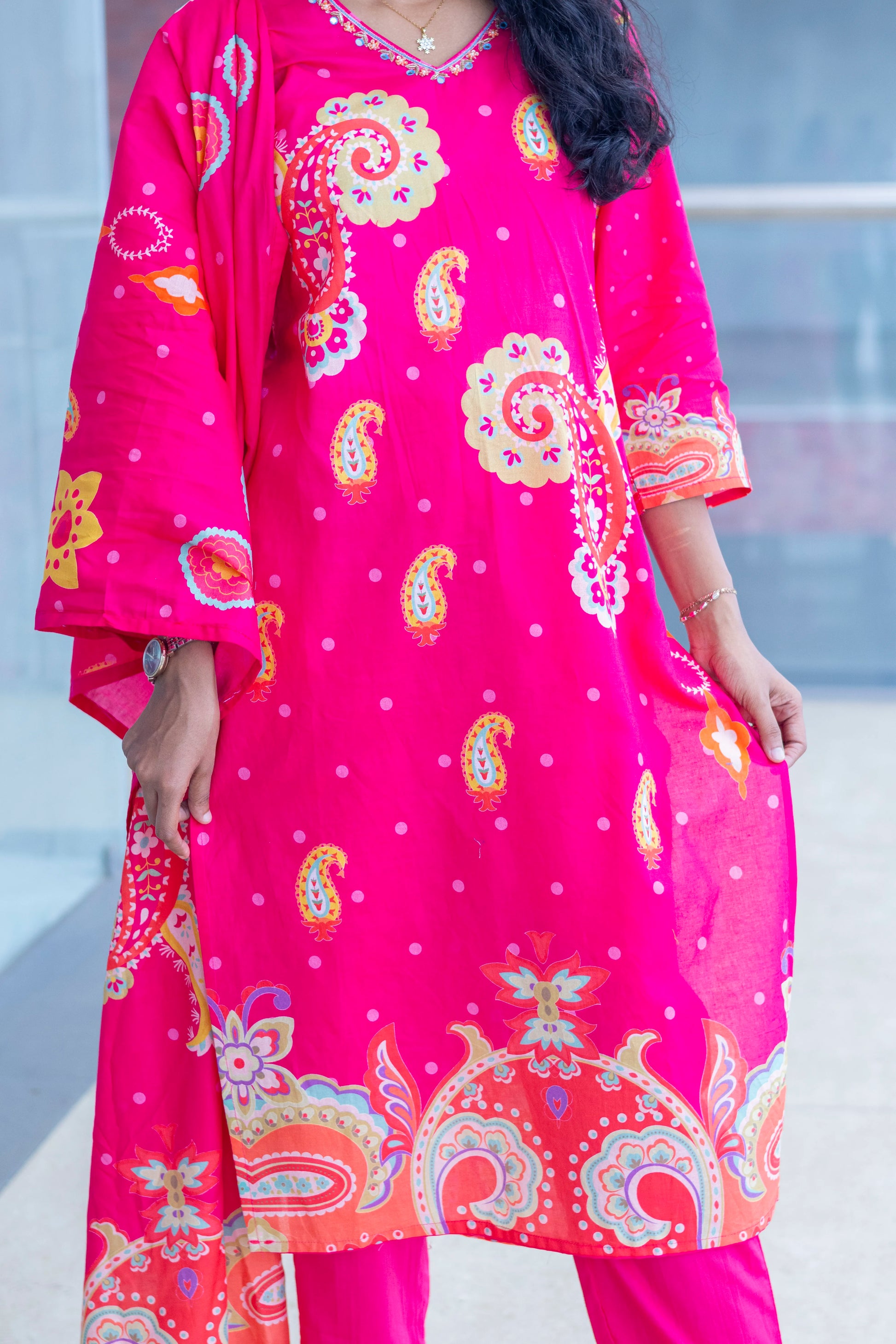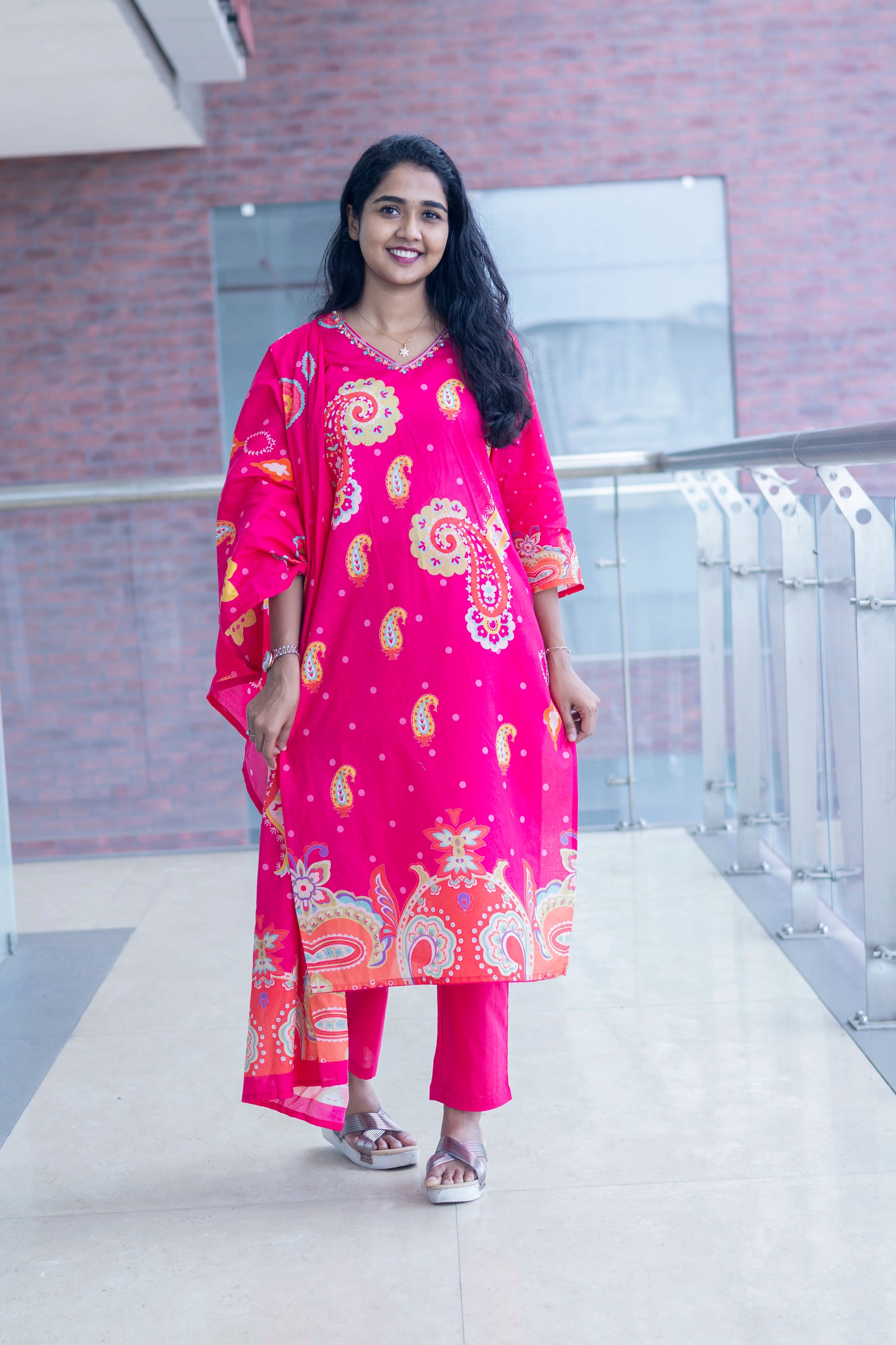 Pink V-Neck Kurti Pant Dupatta Set with Hghlighting Embroidery