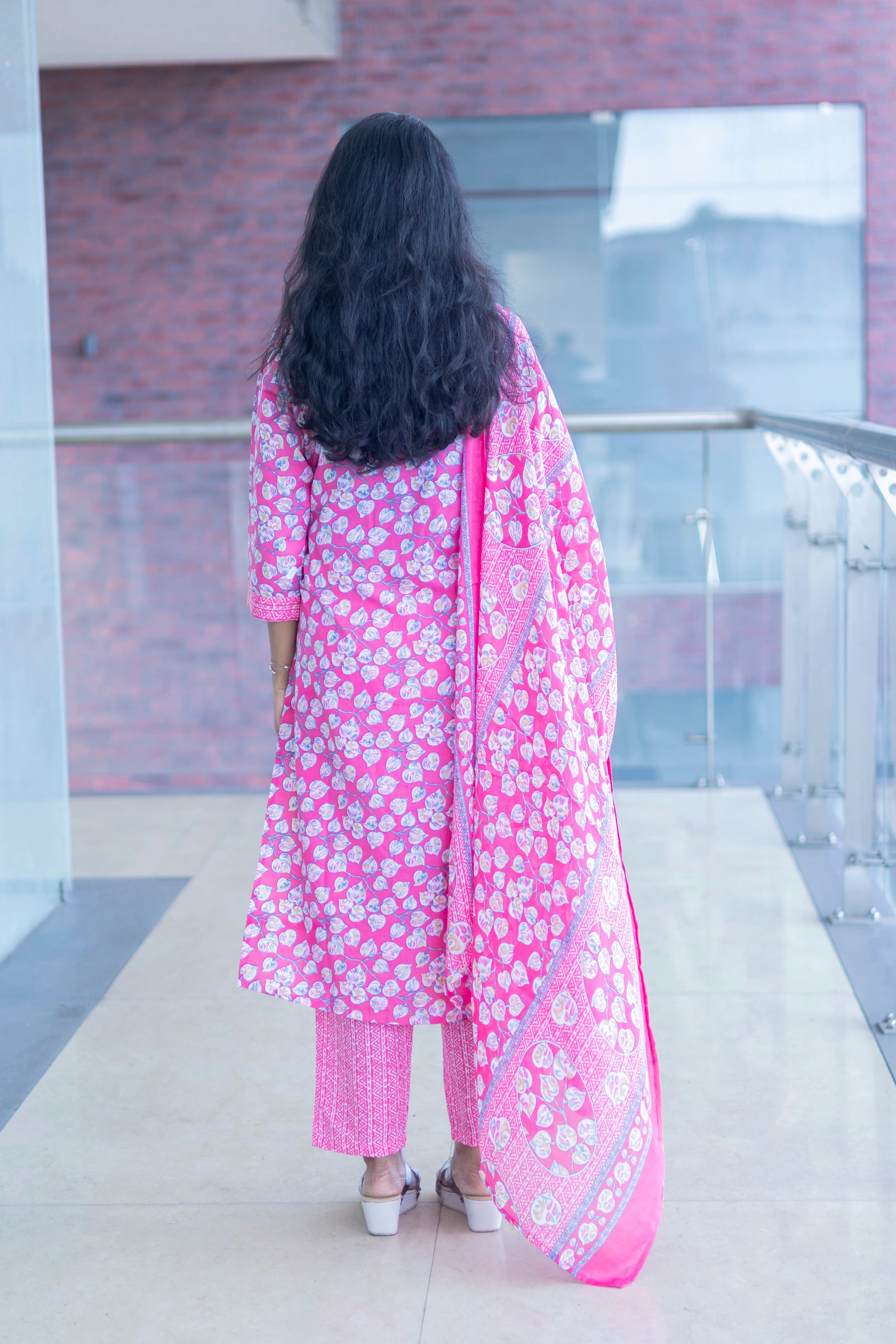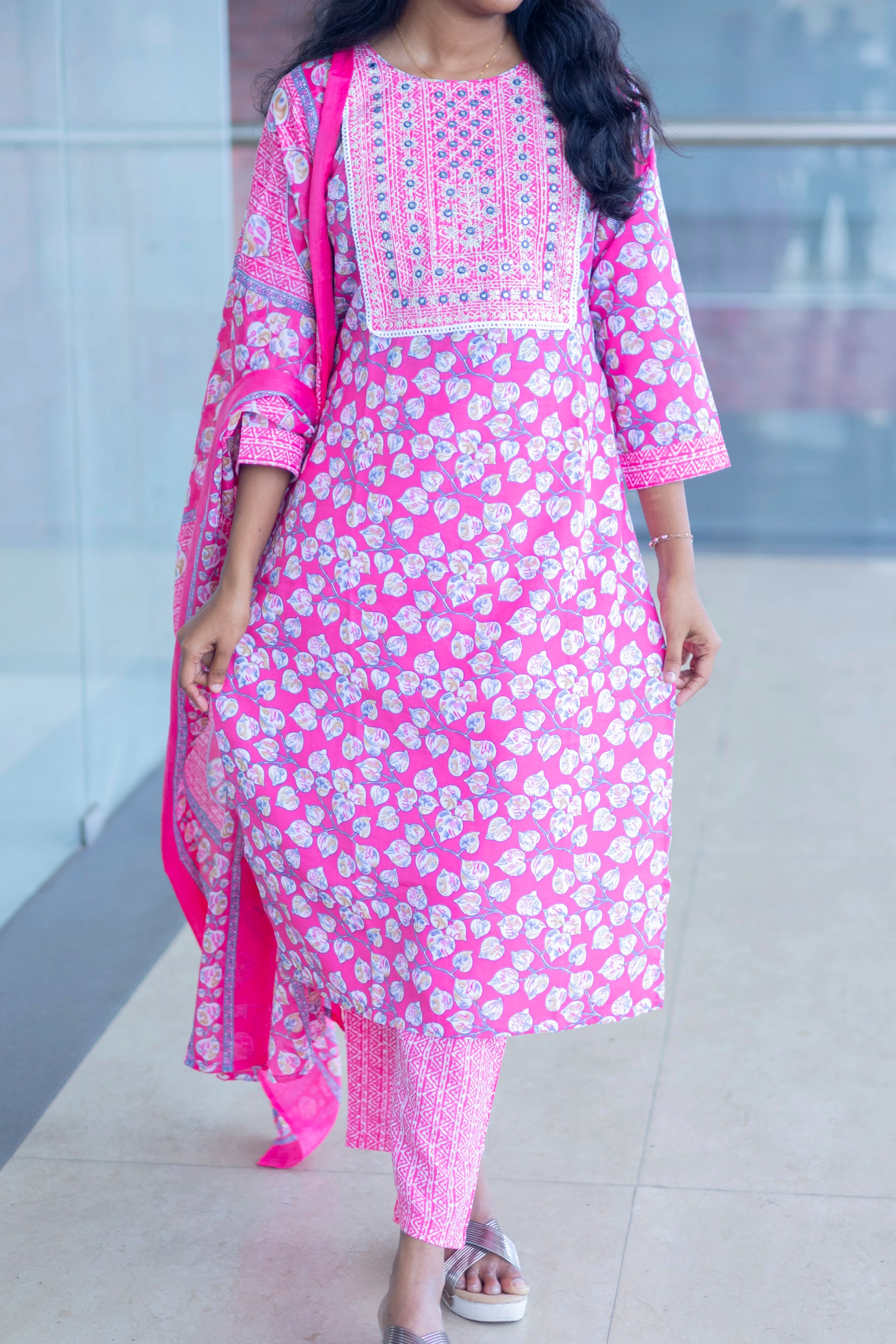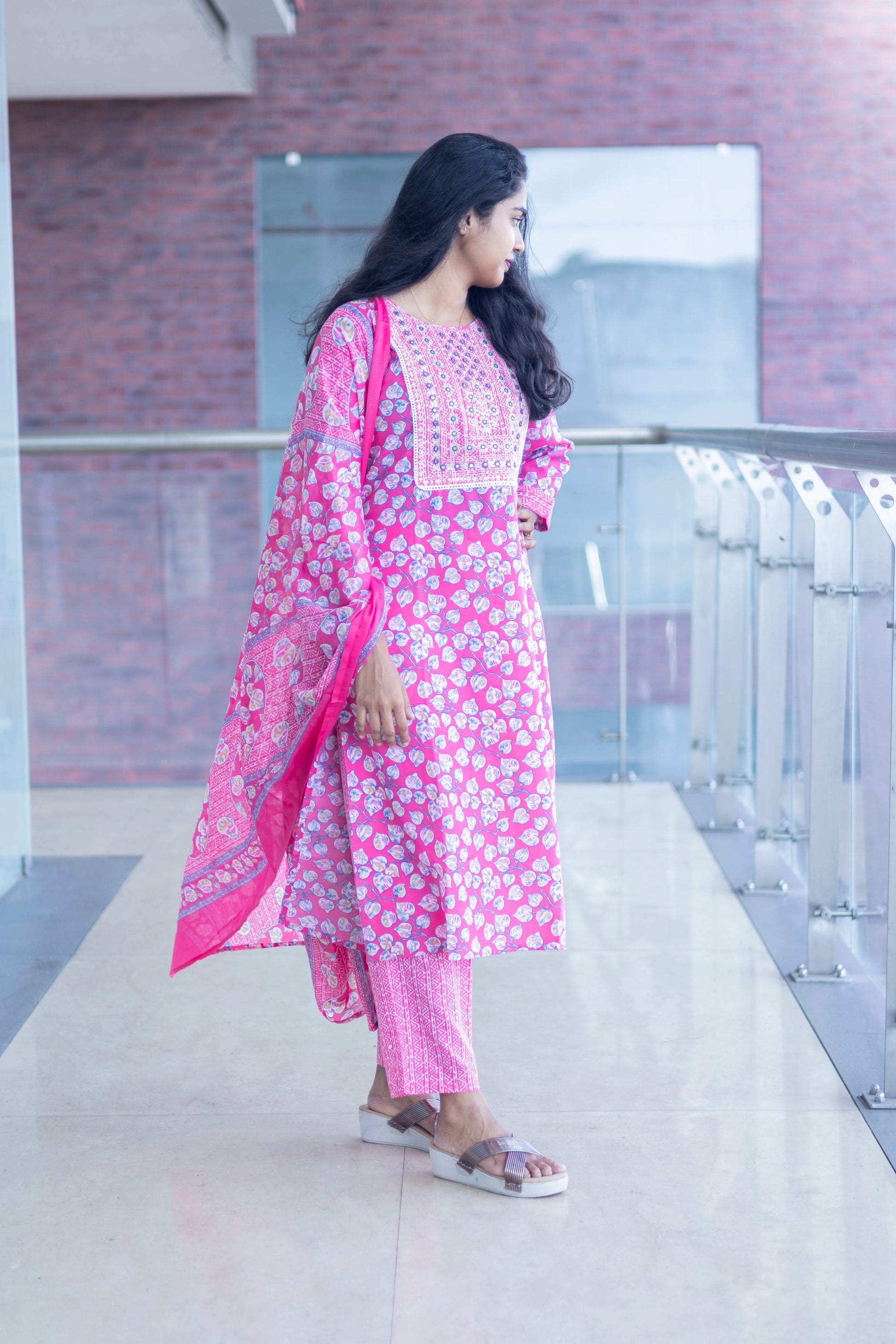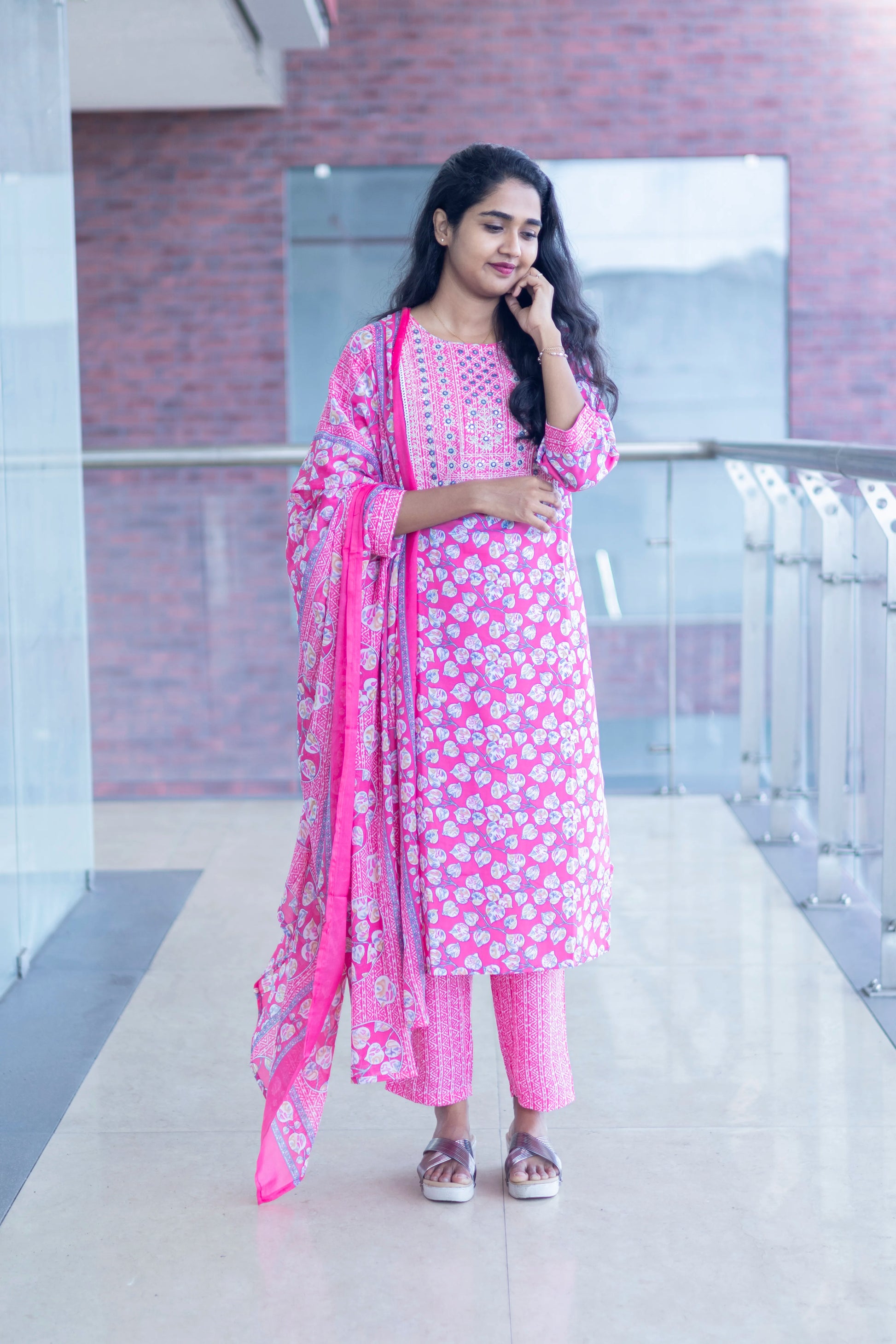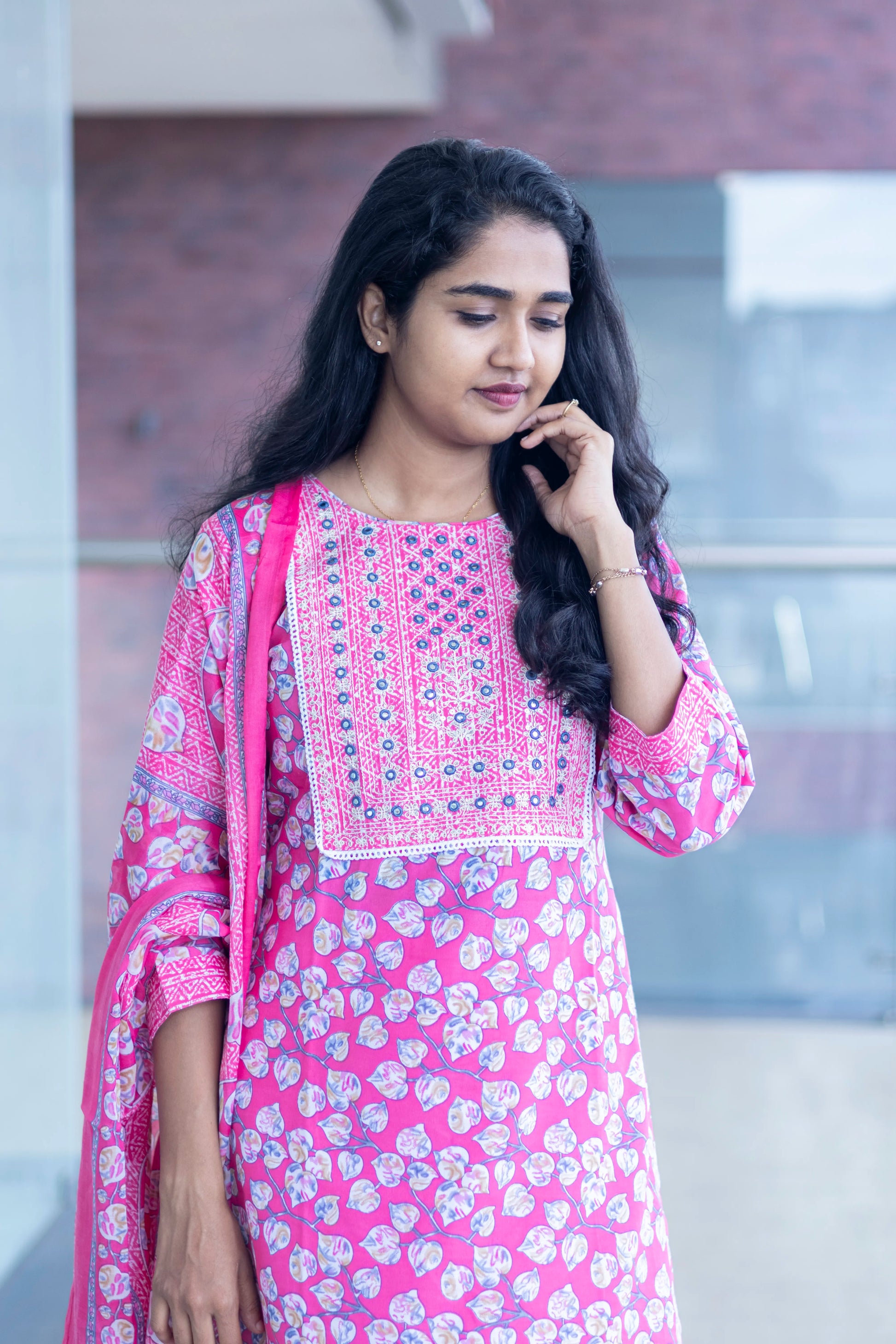 Pink Kurti Set with Round Neck And Highlighting Embroidery work