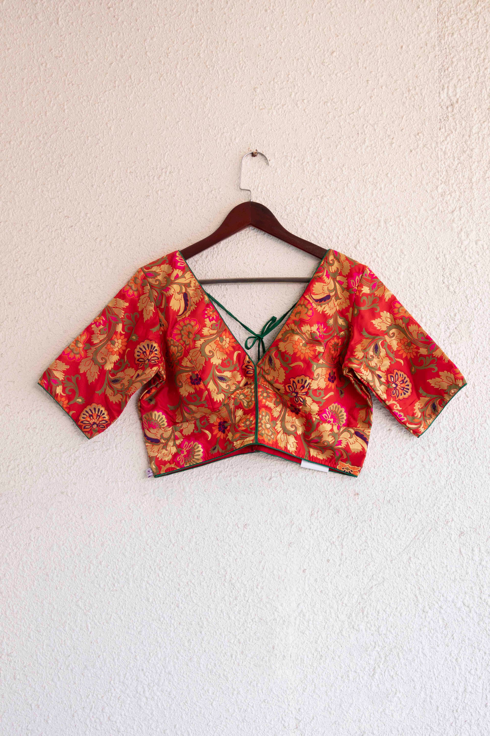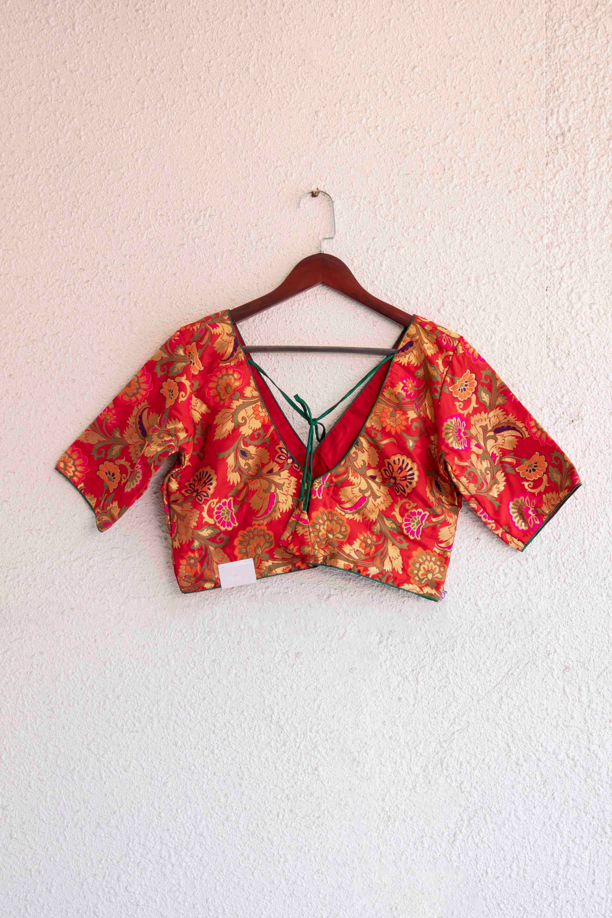 Red Color Banarasi Silk With Back Open Wide V Neck Padded Blouse