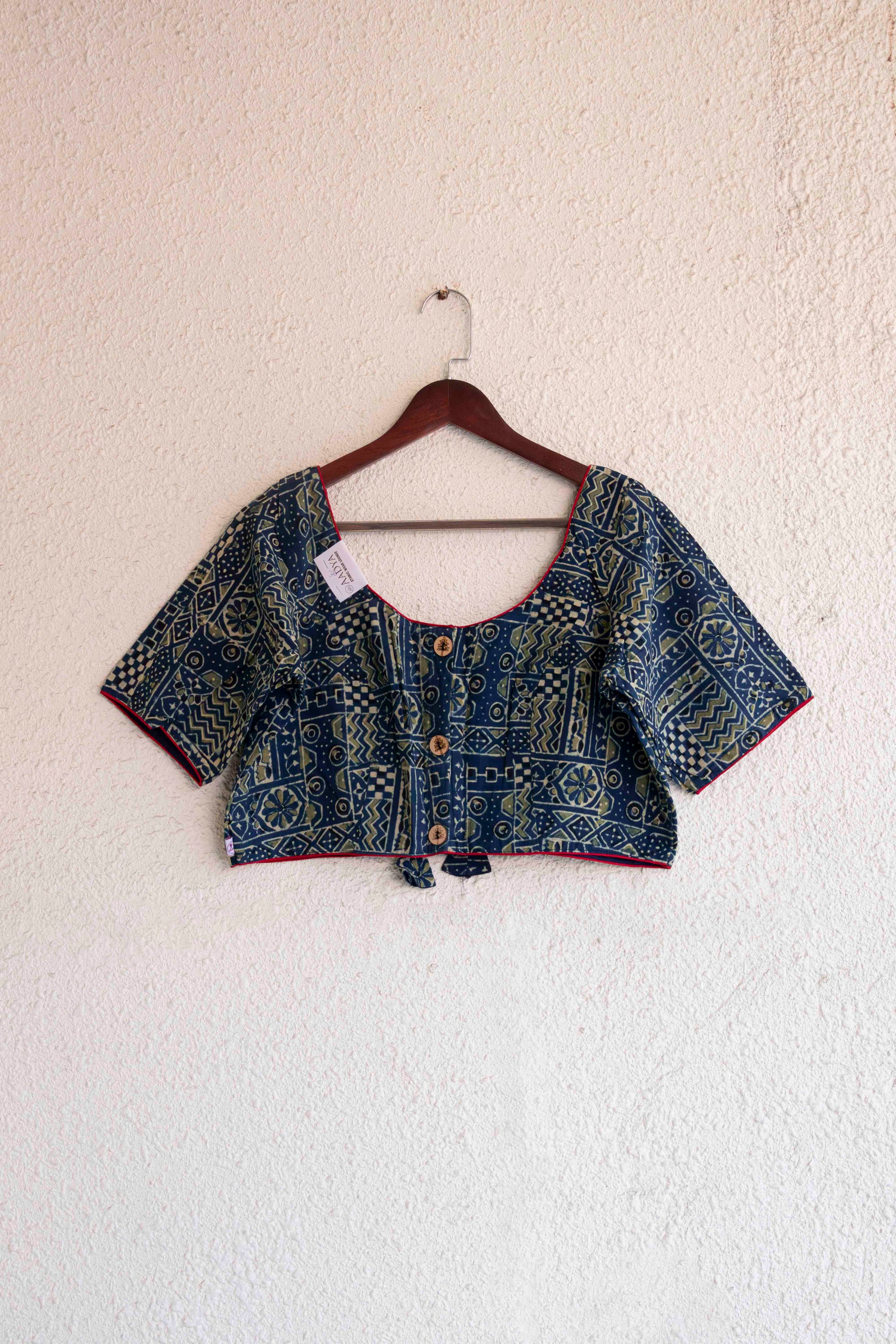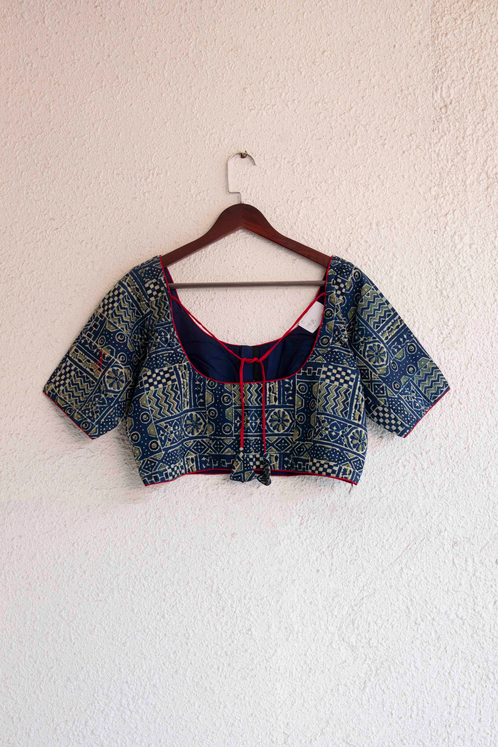 Indigo color Round Neck Ajrakh Box Printed Blouse