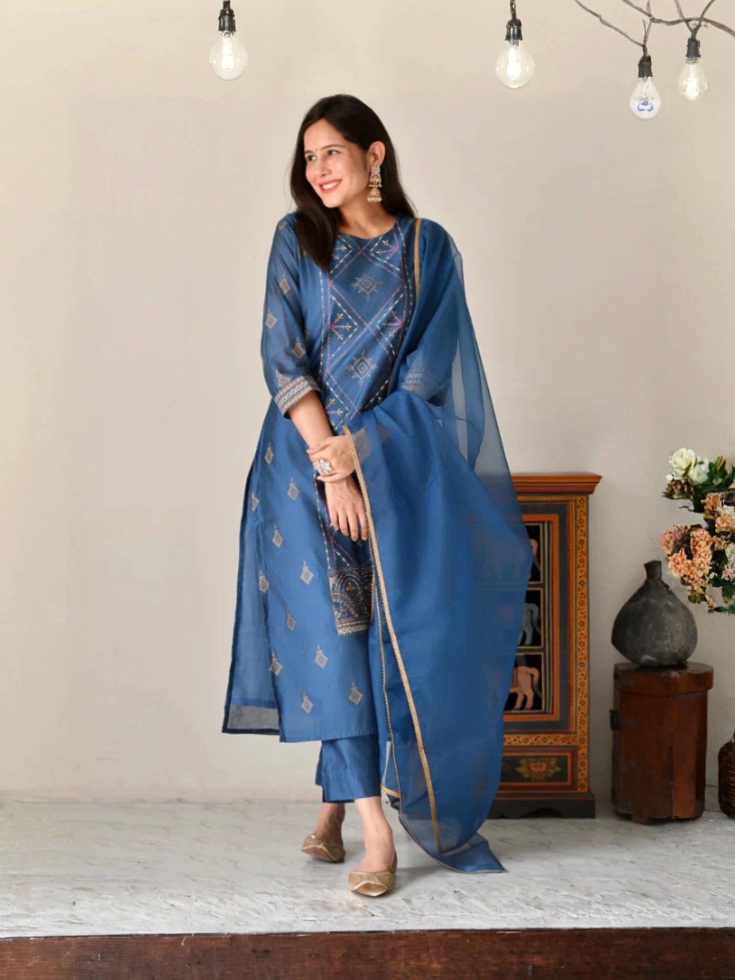 Teal Blue Printed Straight Cut Kurti with Straight Pant & Dupatta