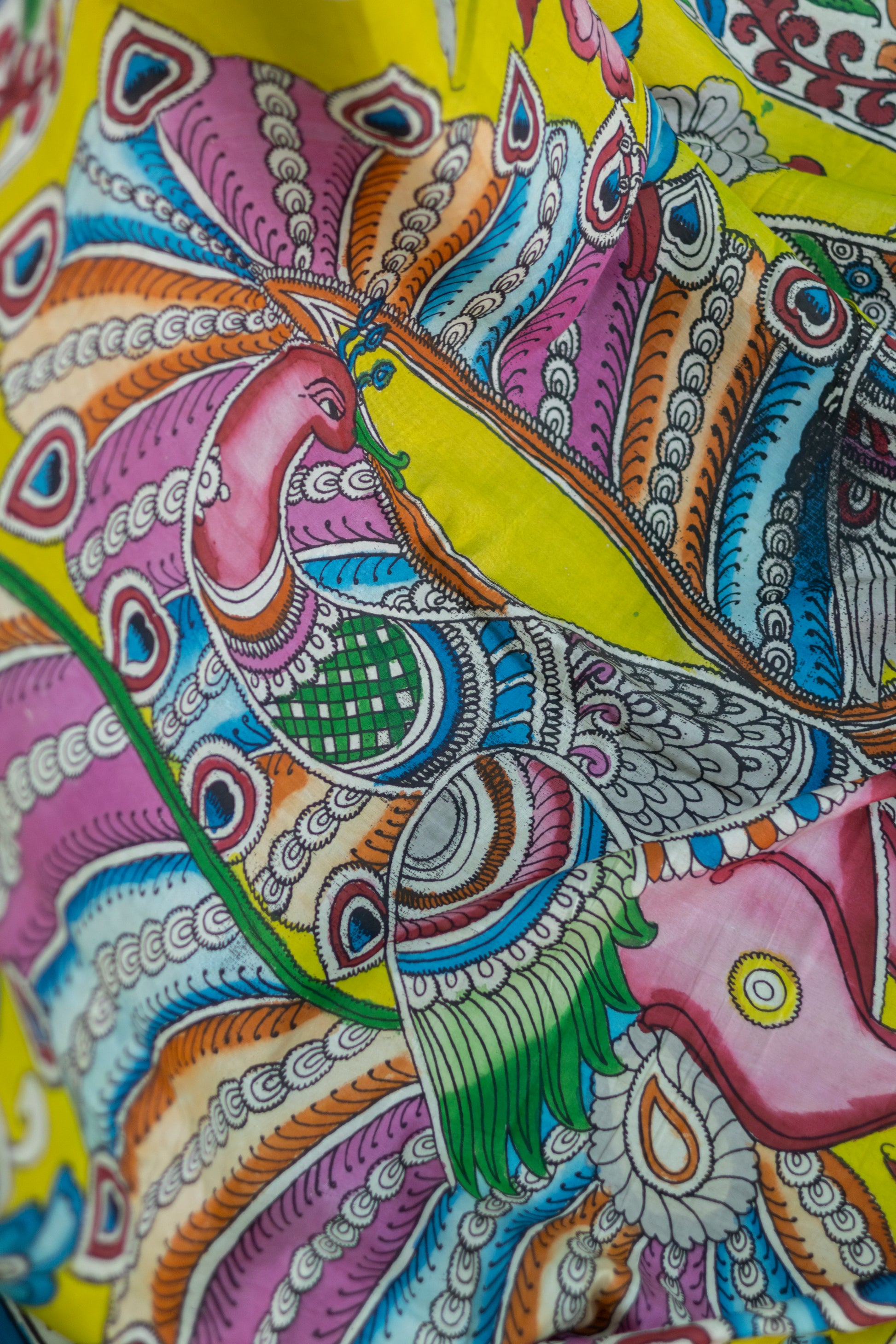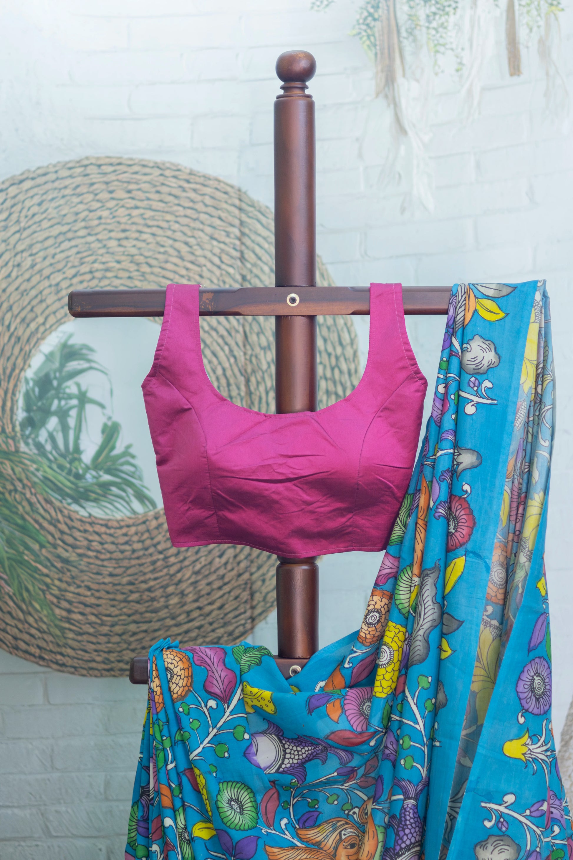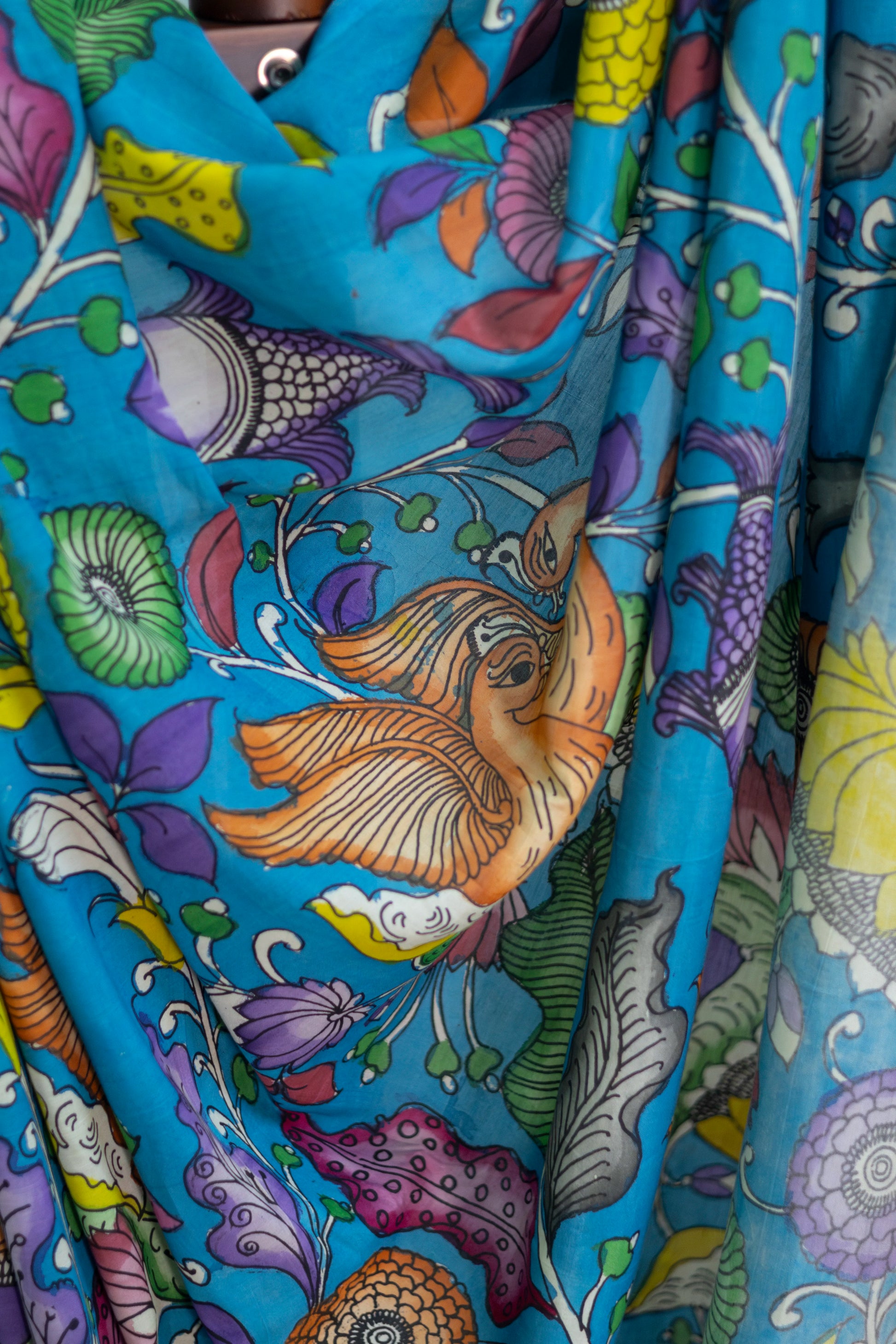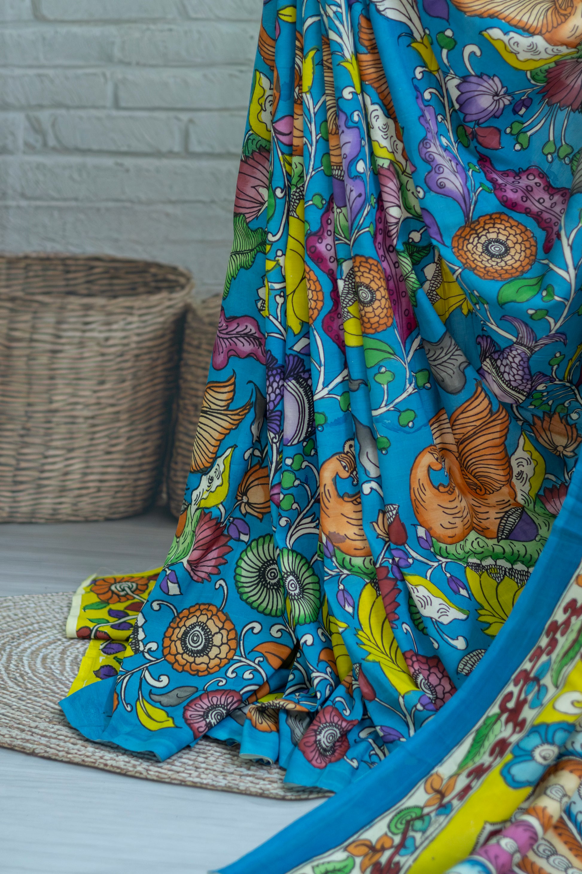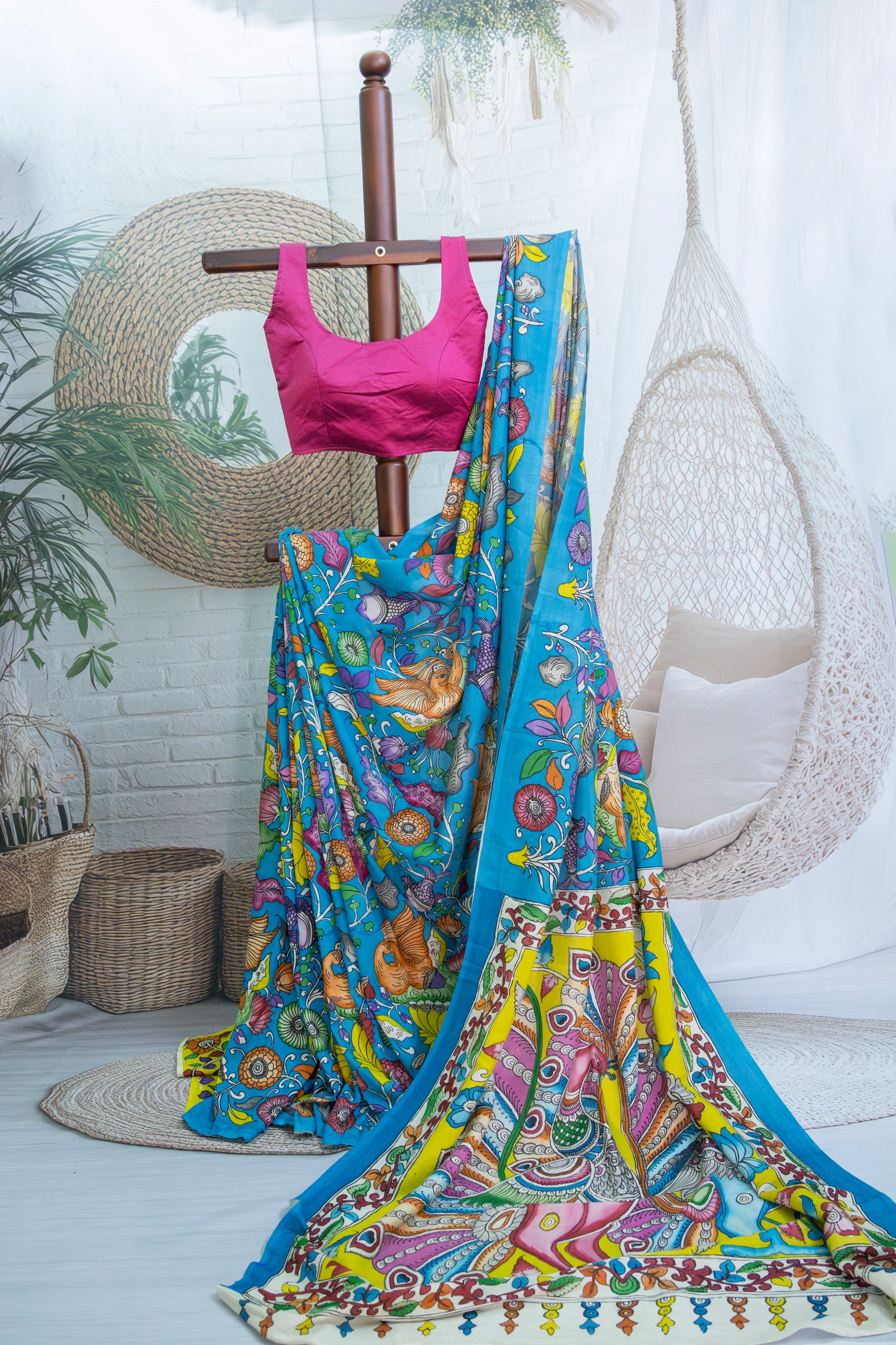 Blue color Hand Painted Pen Kalamkari Bangalore Silk borderless Saree