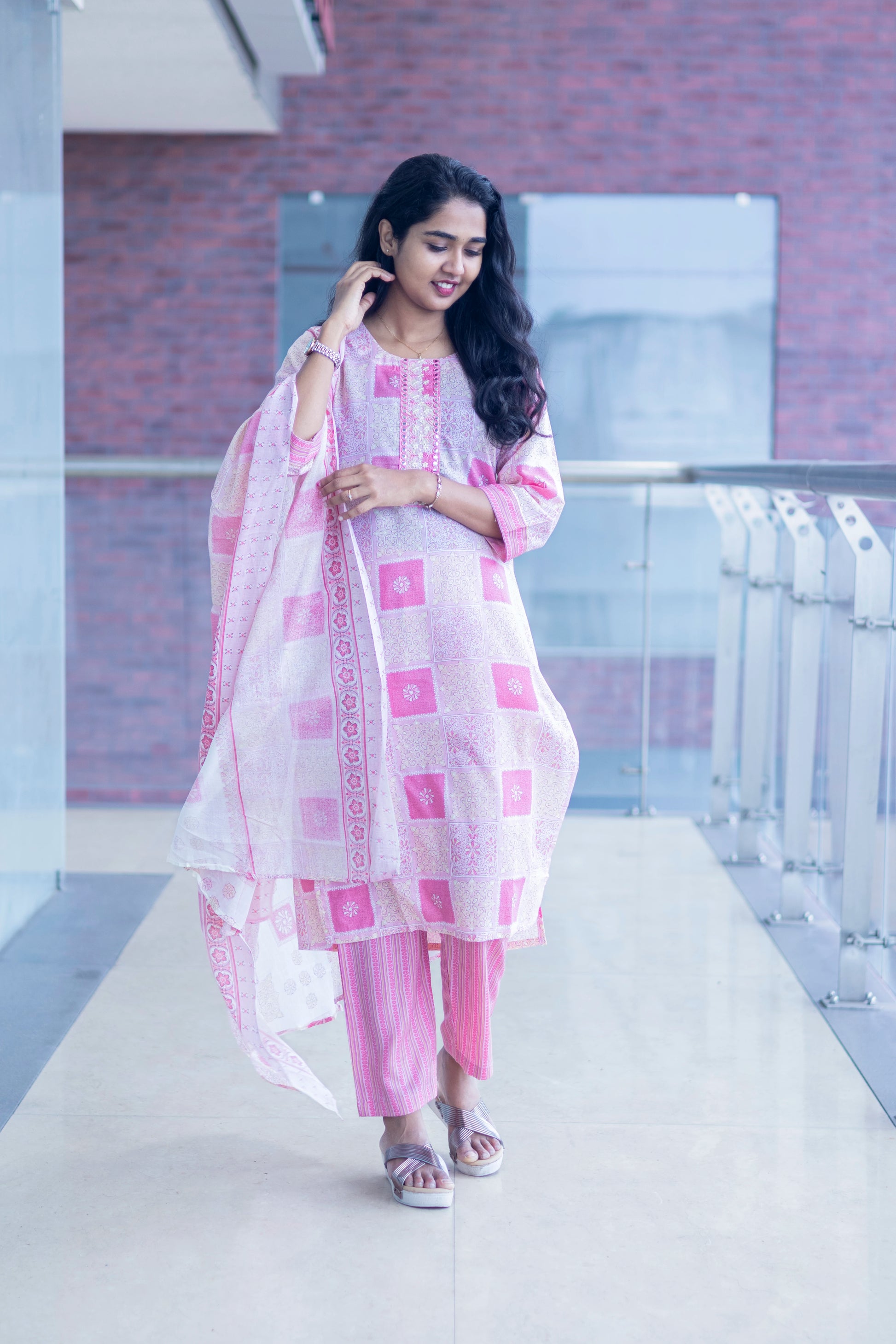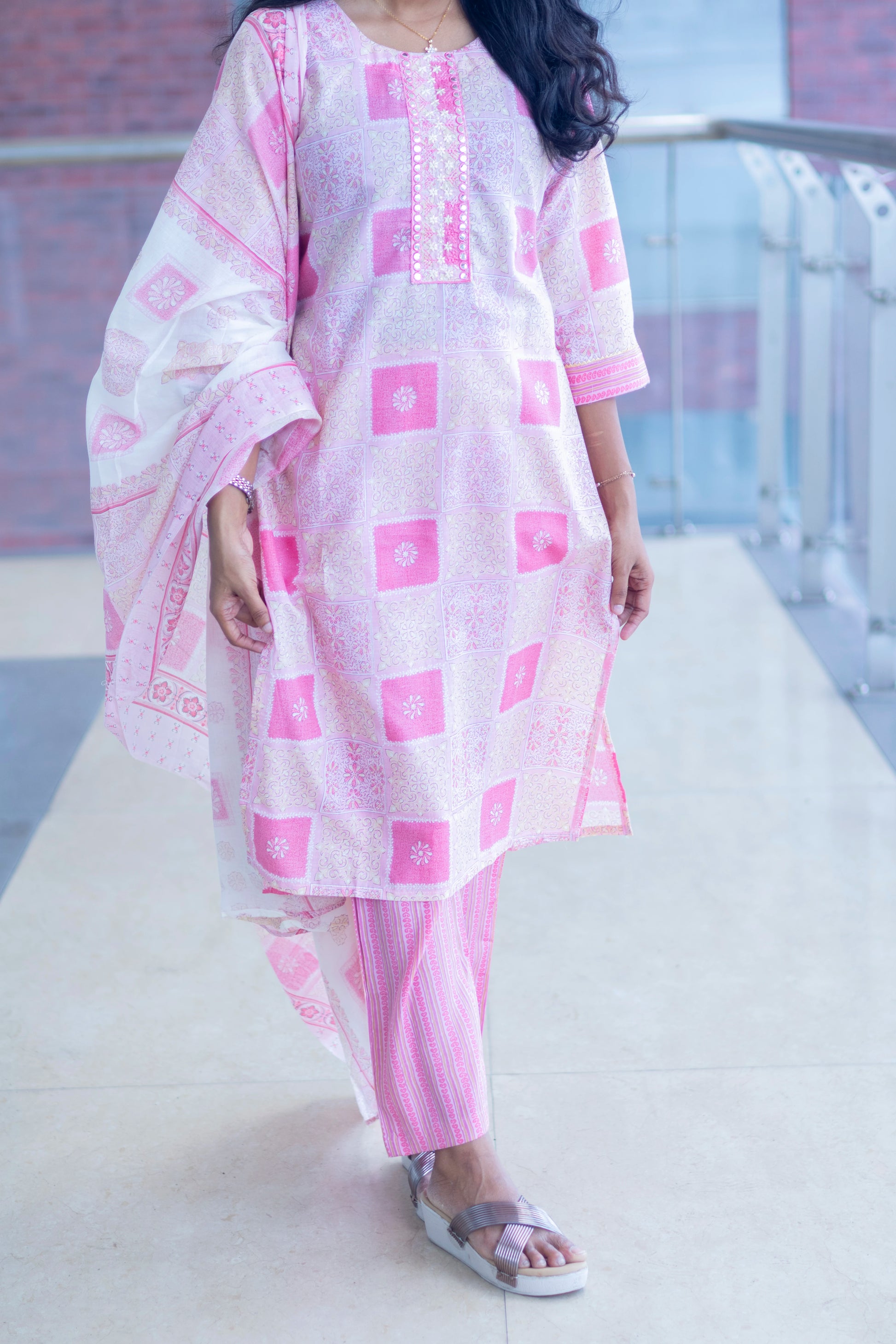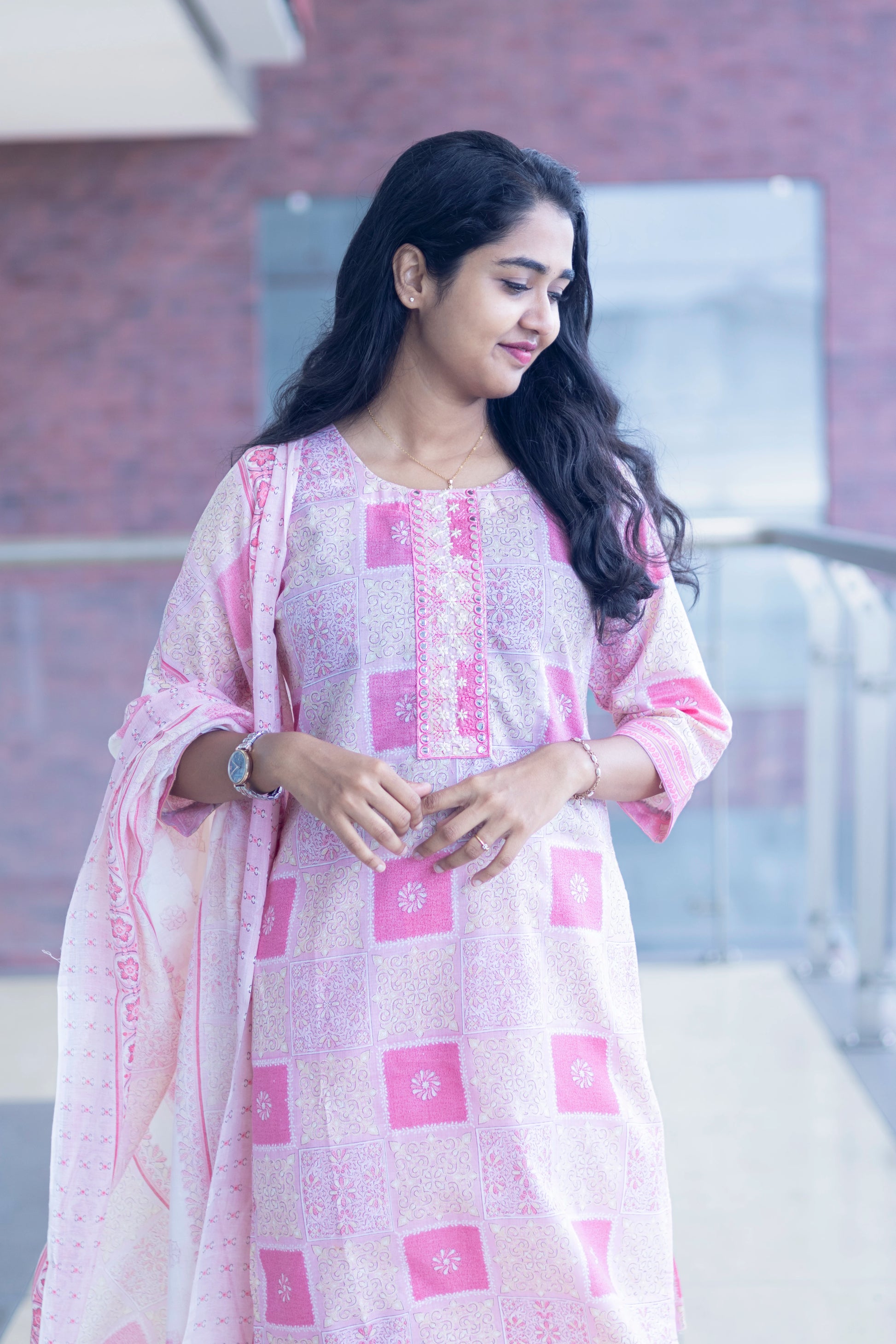 Pink kurti set with round neck highlighting embroidery Yoke work