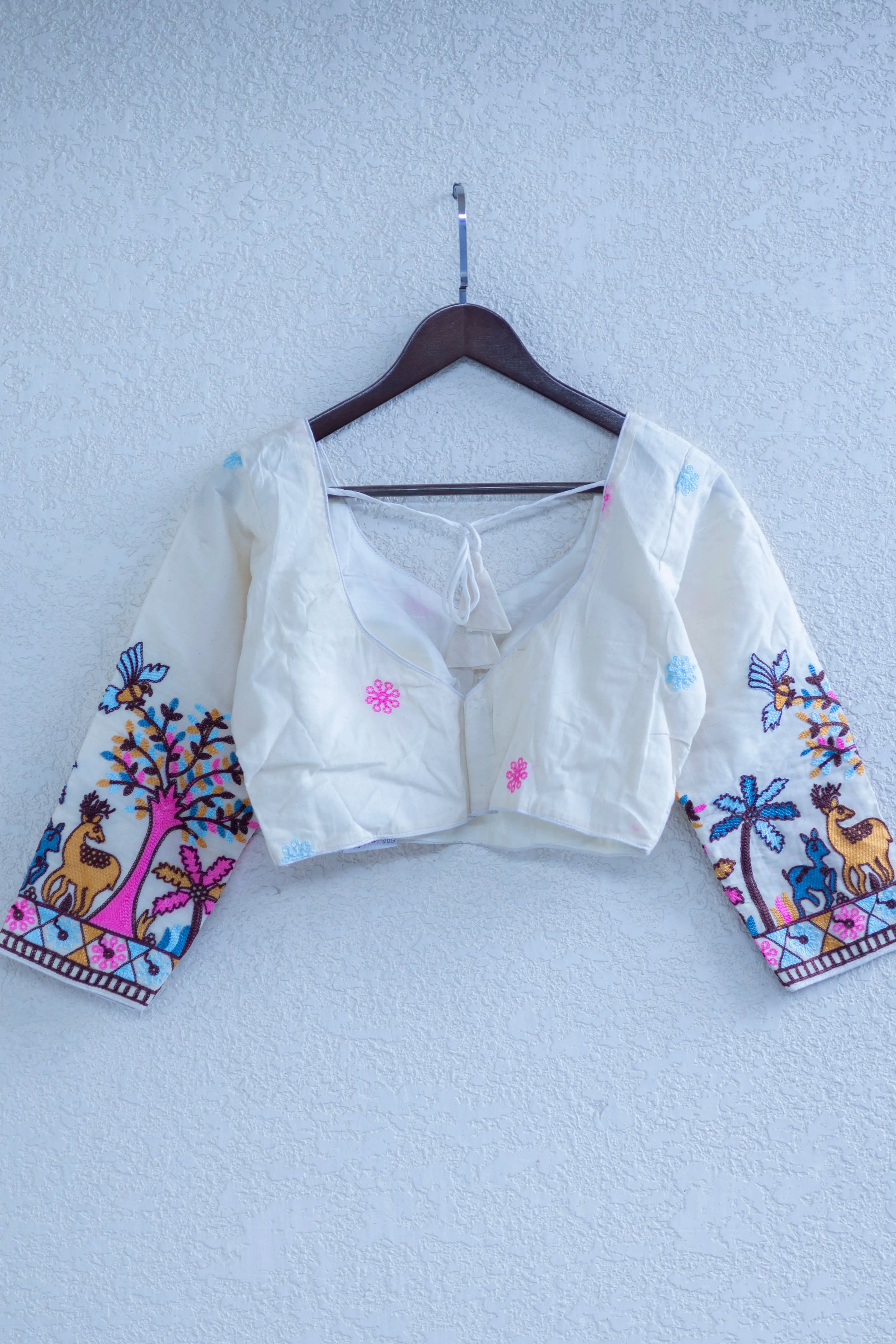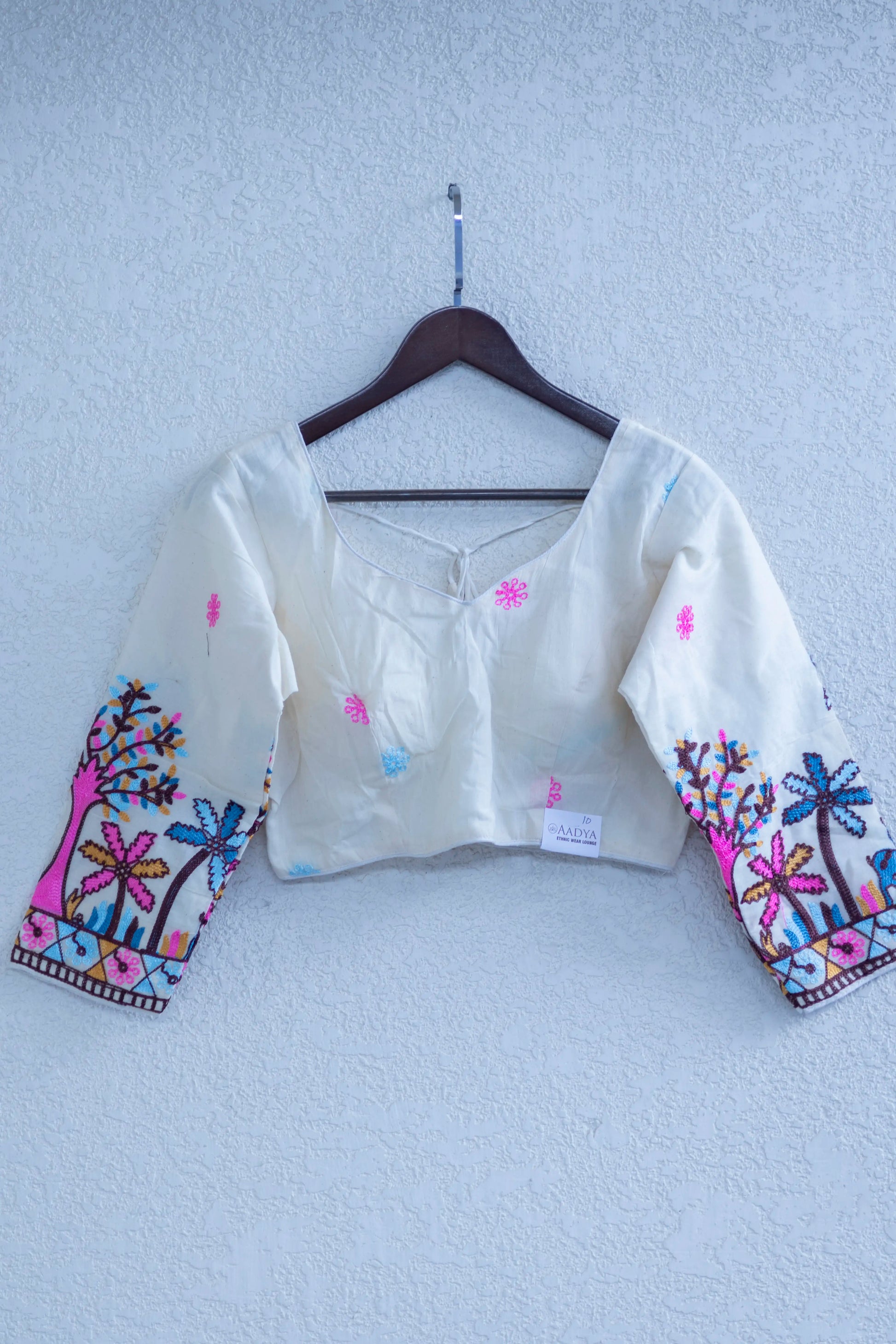 White Leaf Neck Khadi Cotton Full Sleeve Blouse
