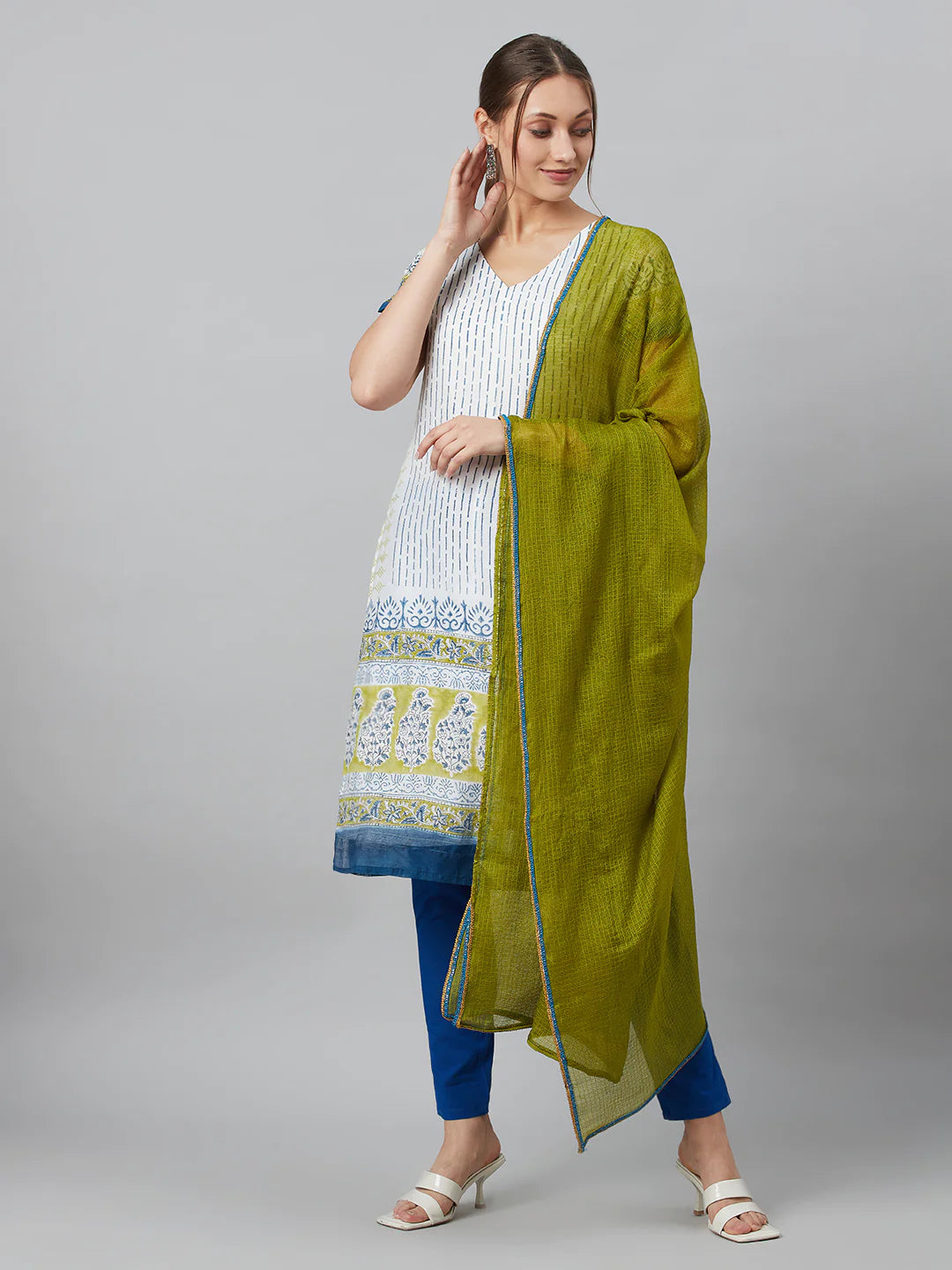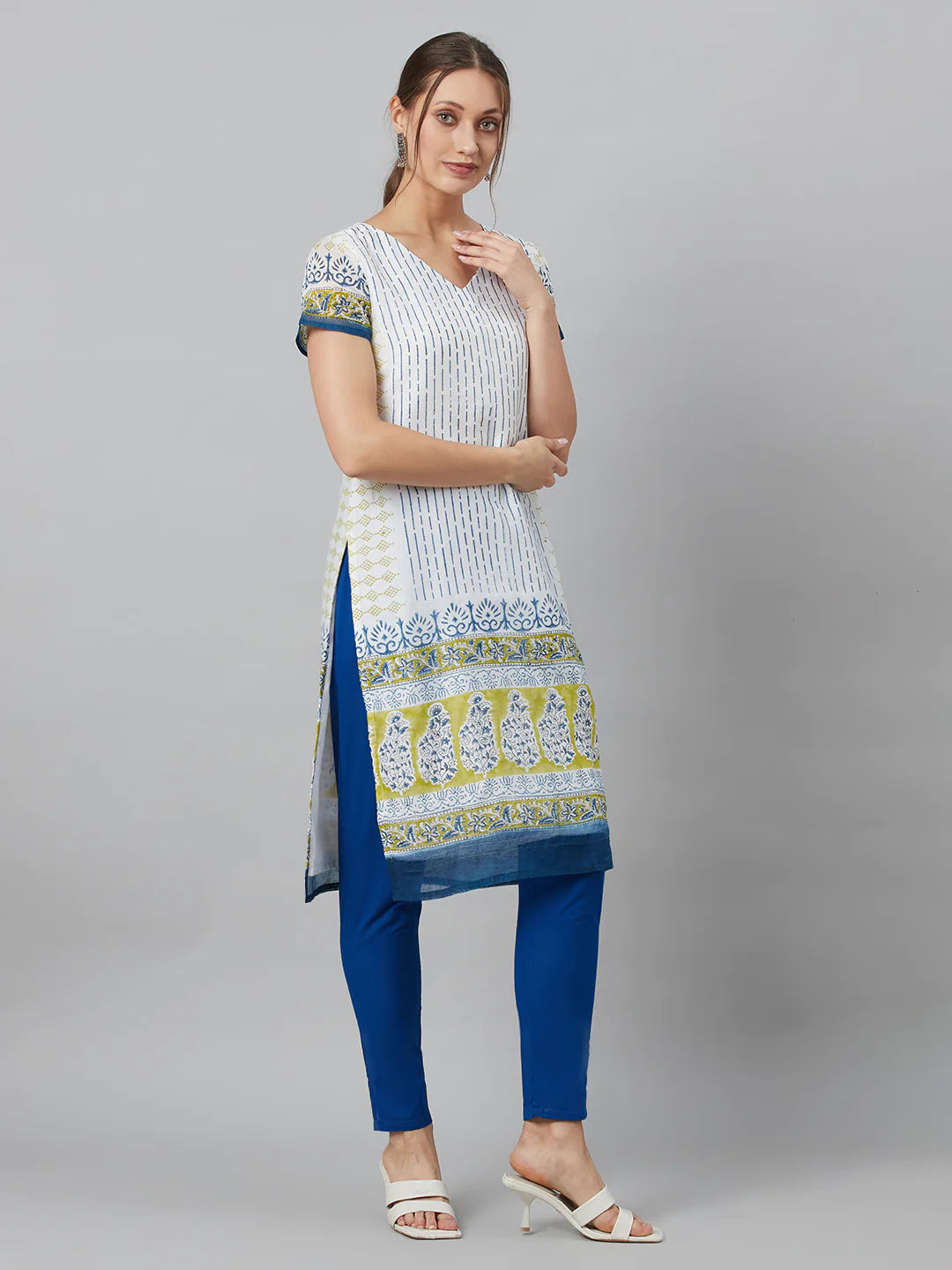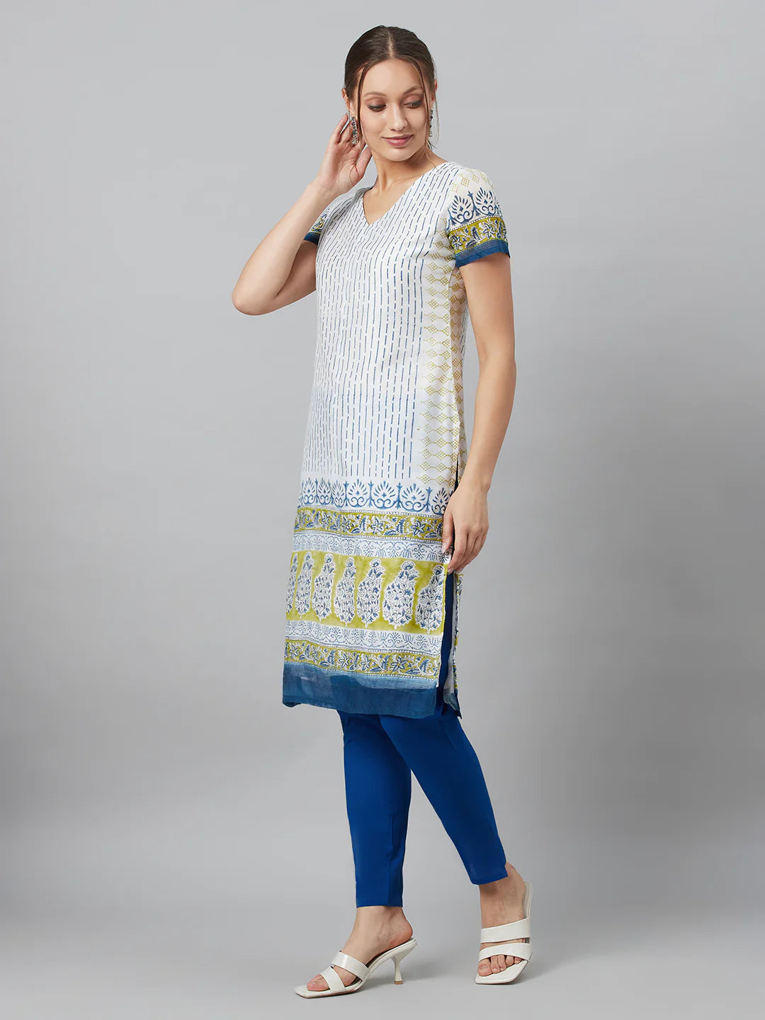 White & Blue Printed Kurti with Bottom & Dupatta Set