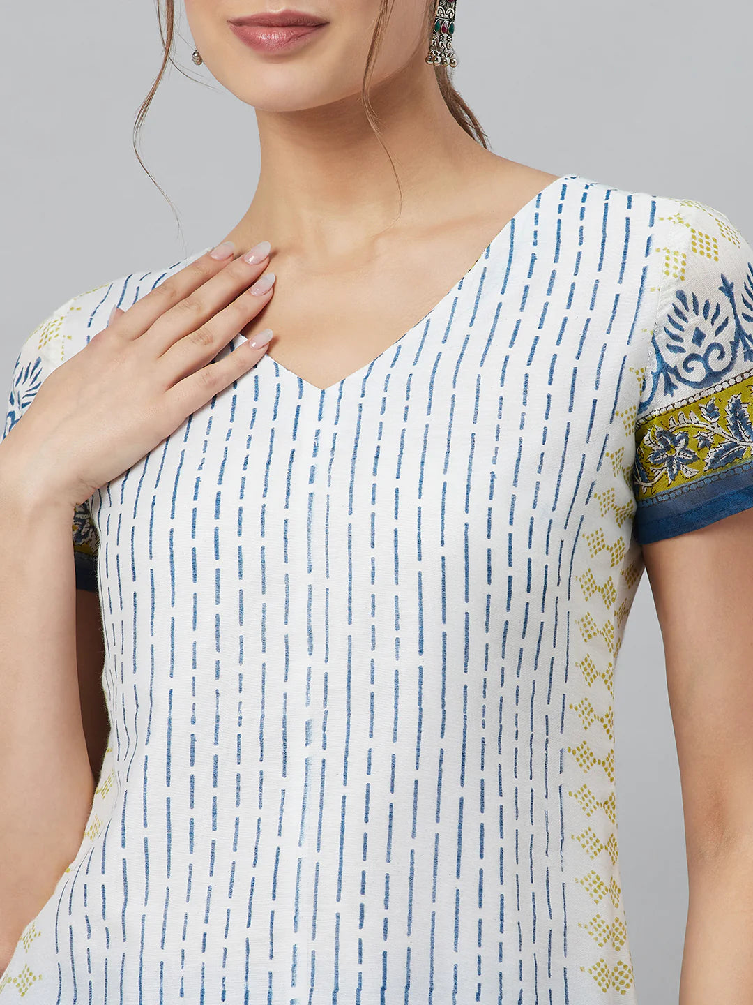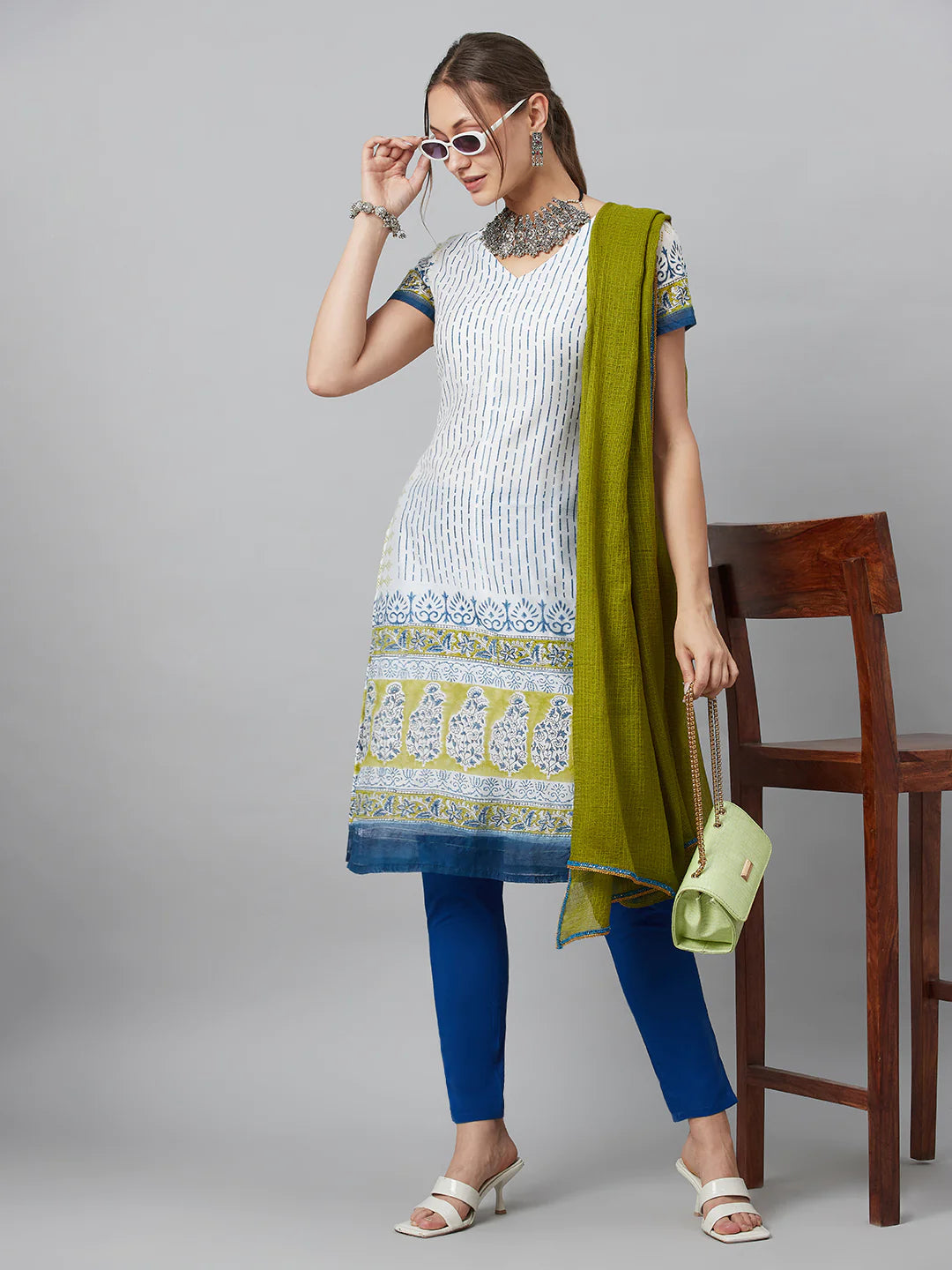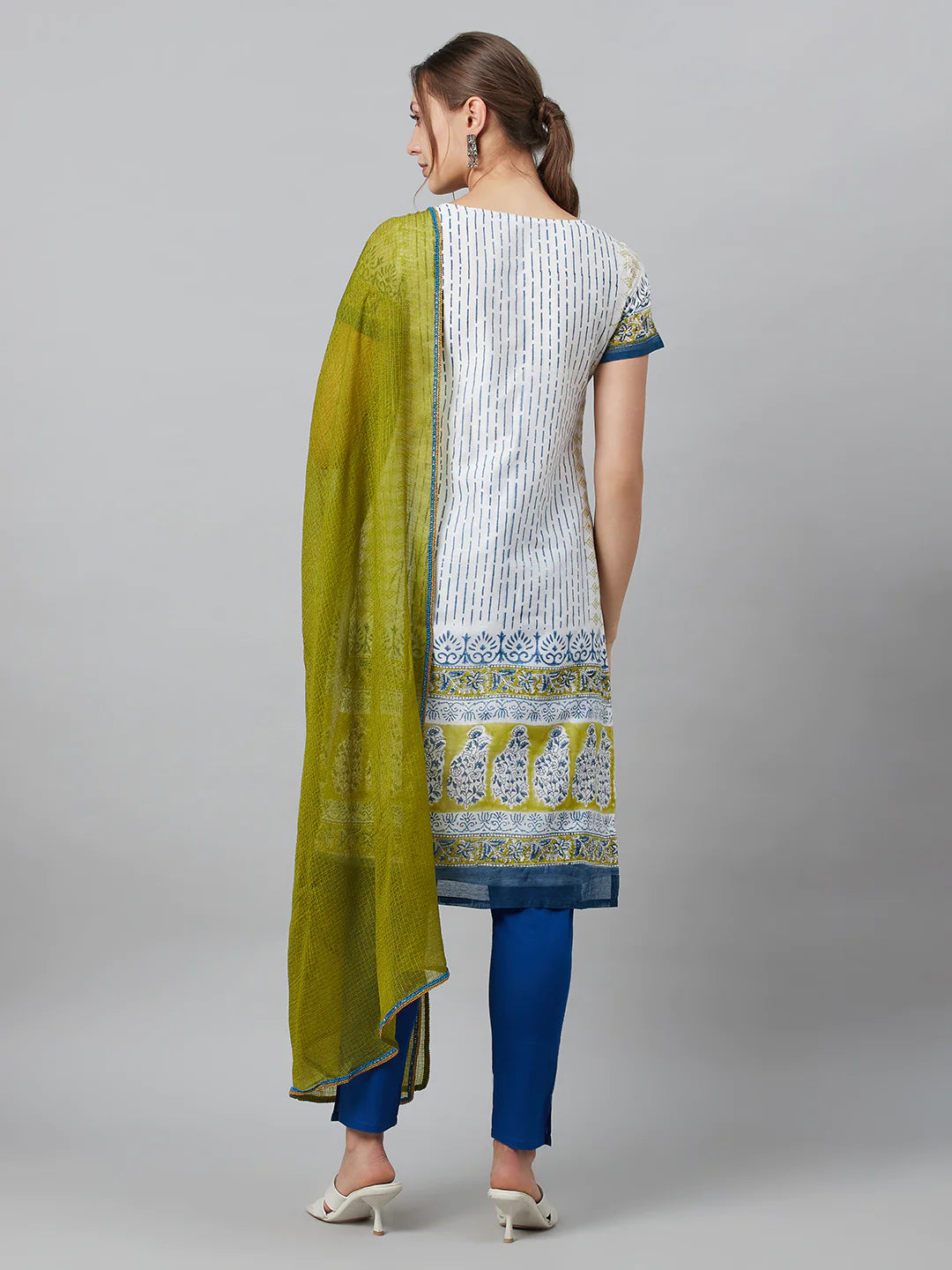 White & Blue Printed Kurti with Bottom & Dupatta Set