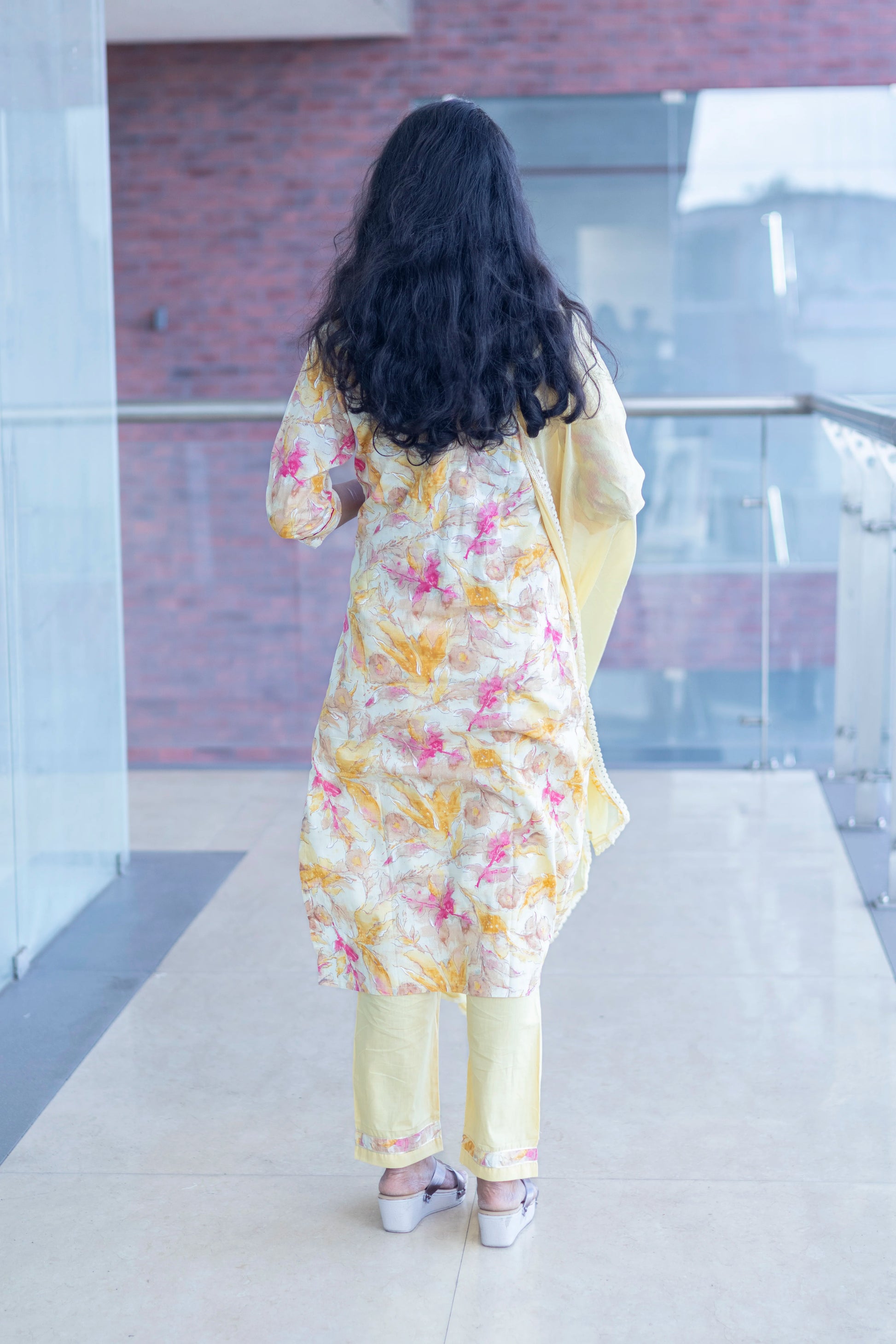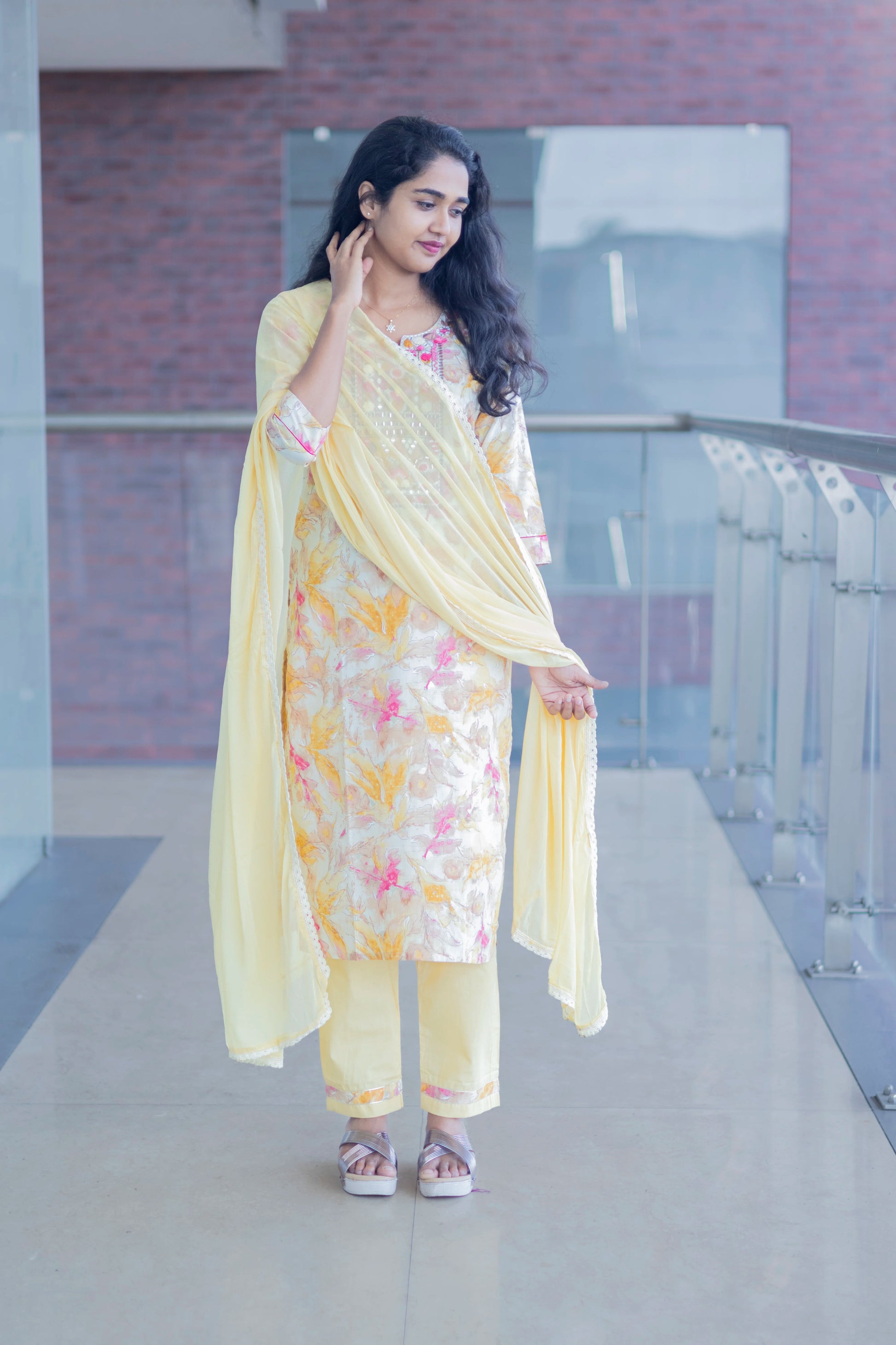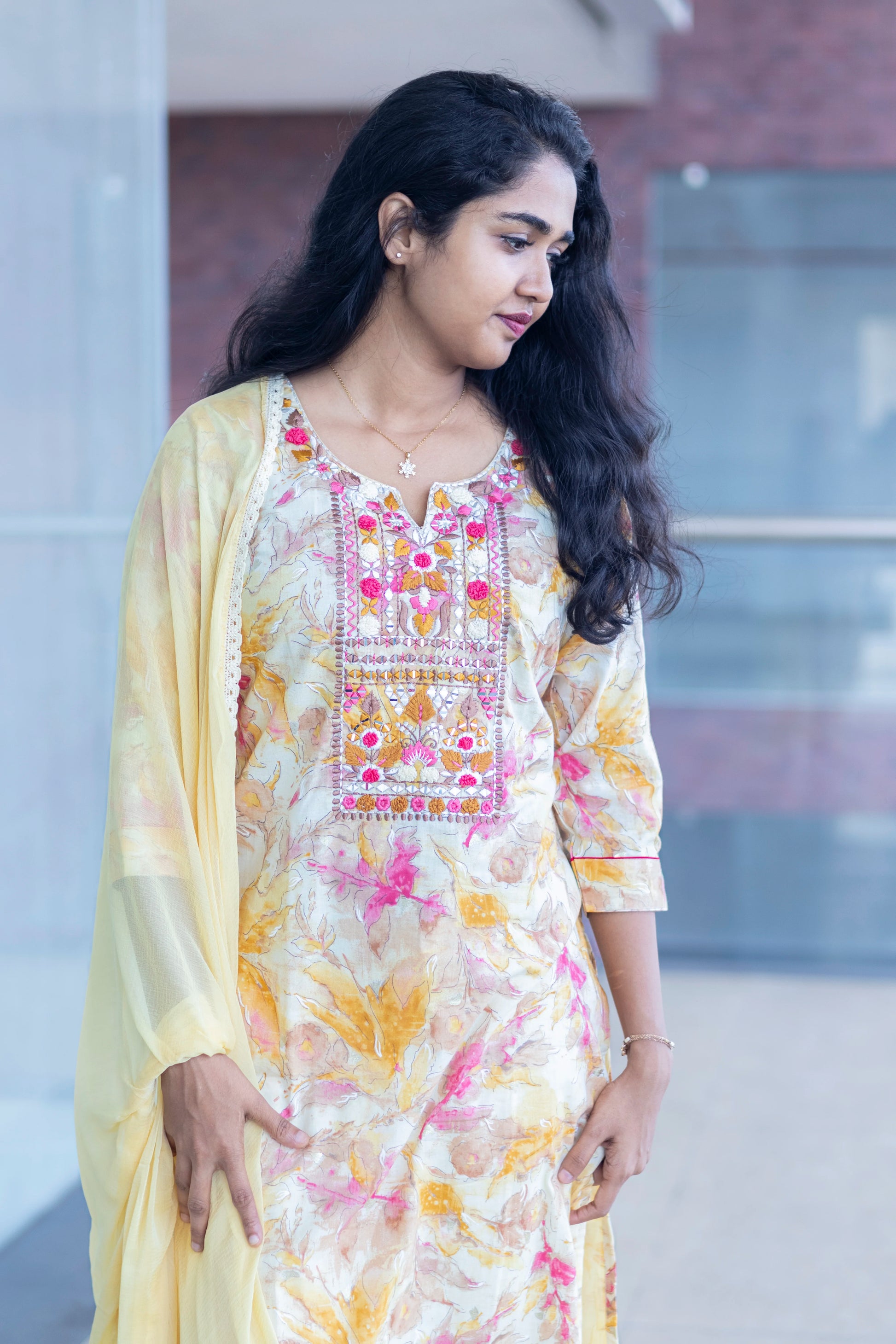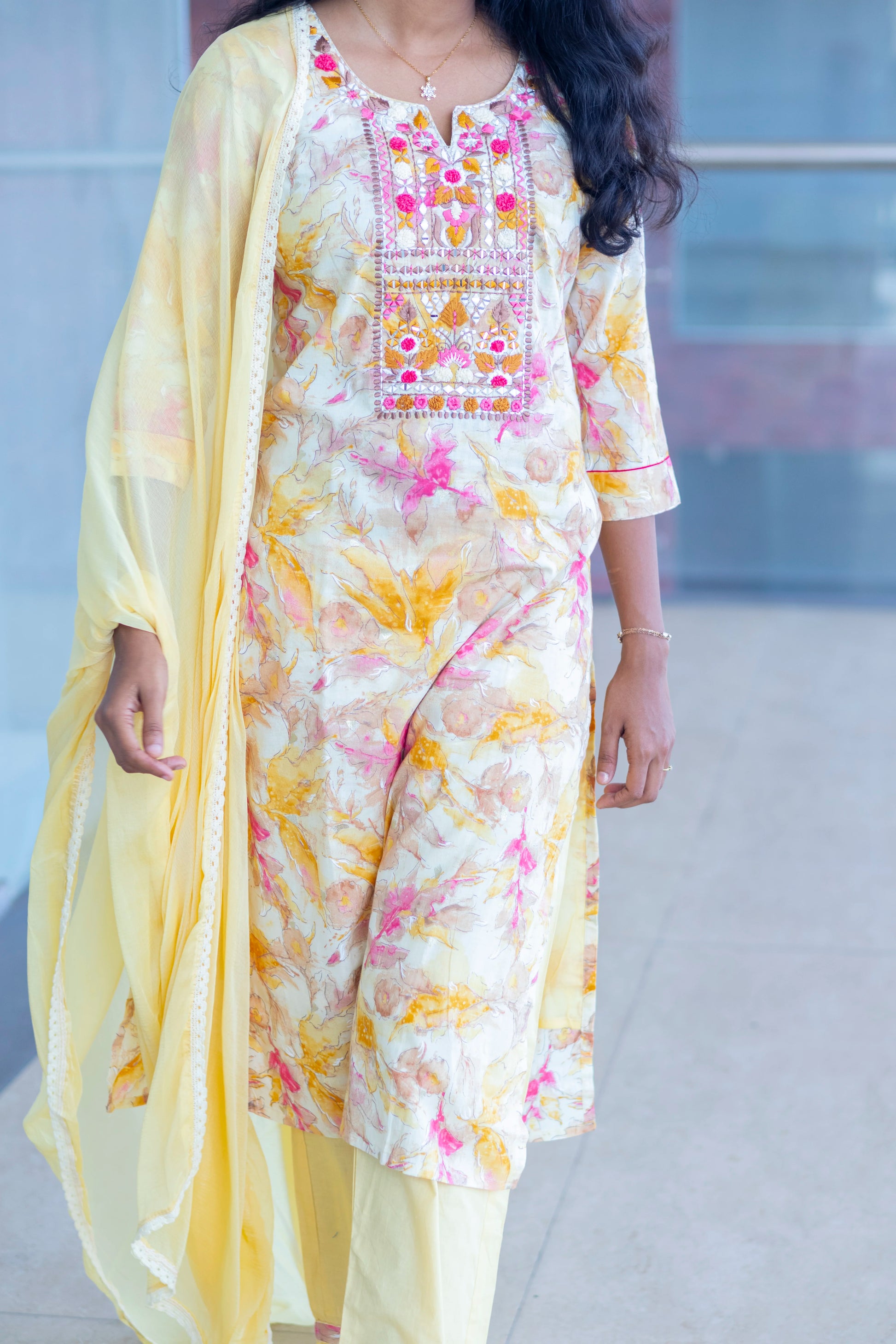 Yellow kurti set with round v neck highlighting embroidery Yoke work