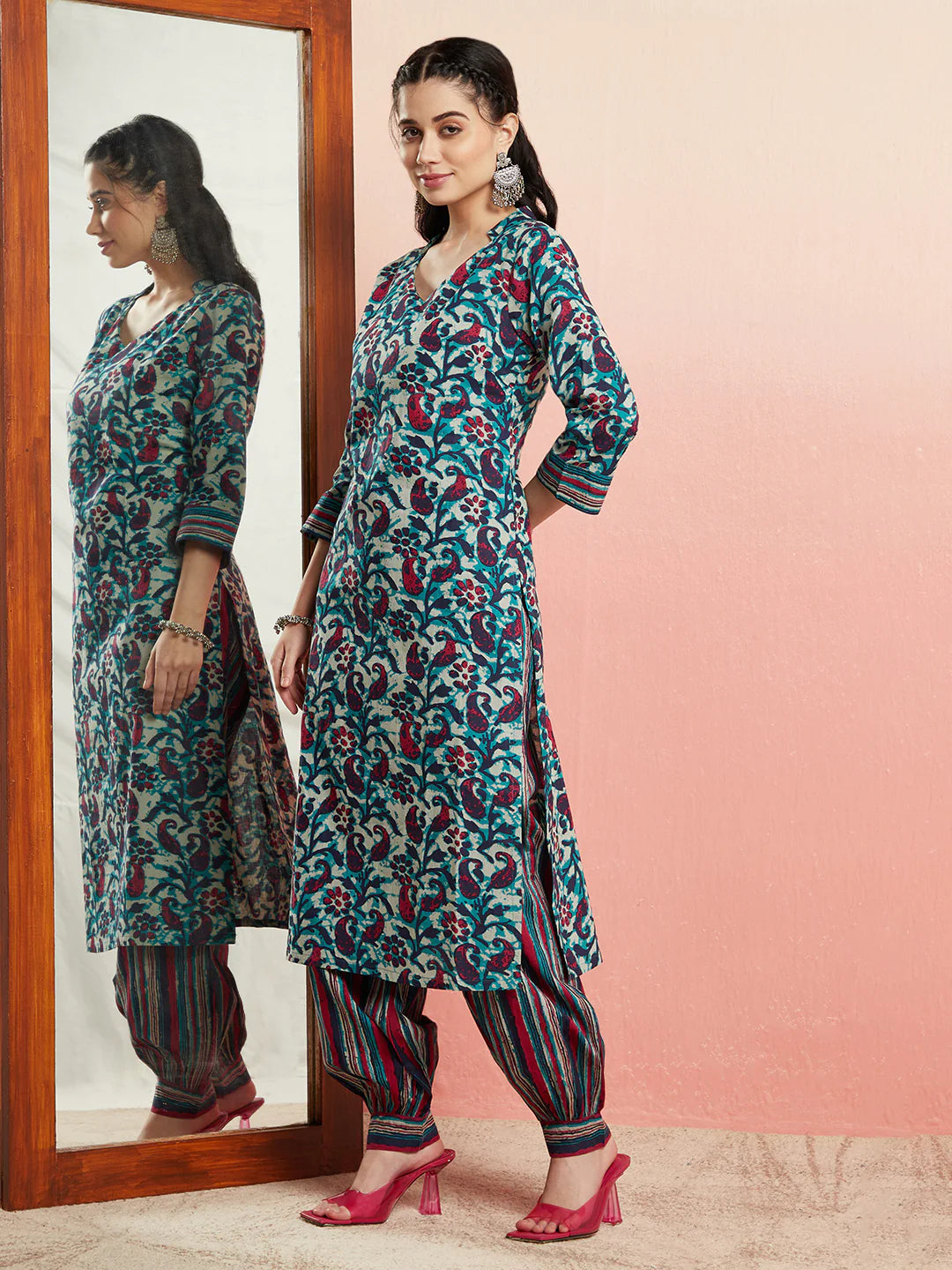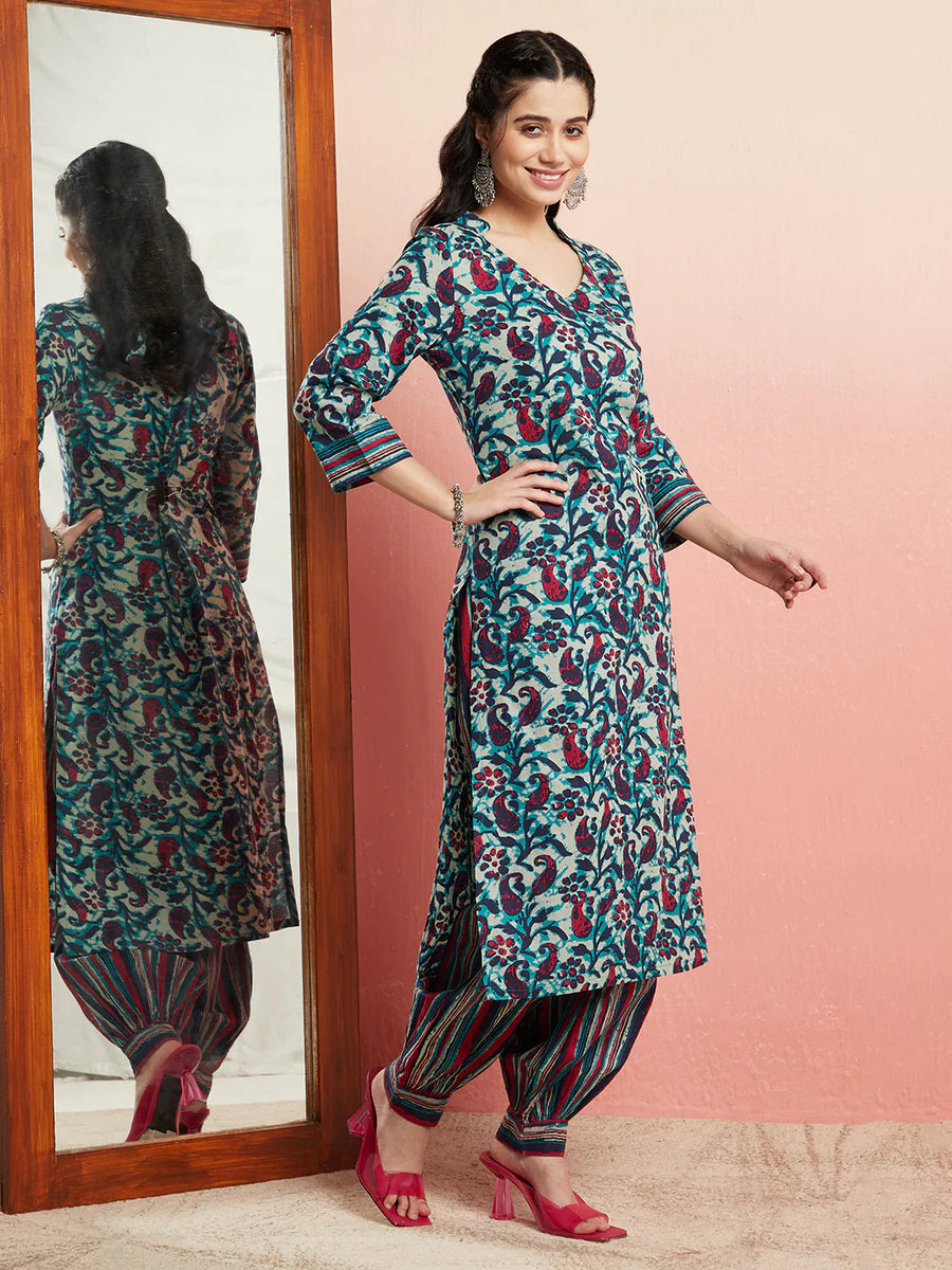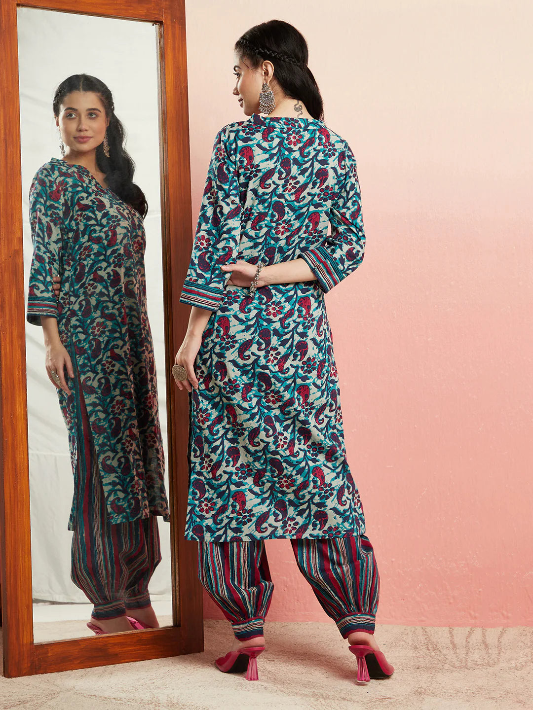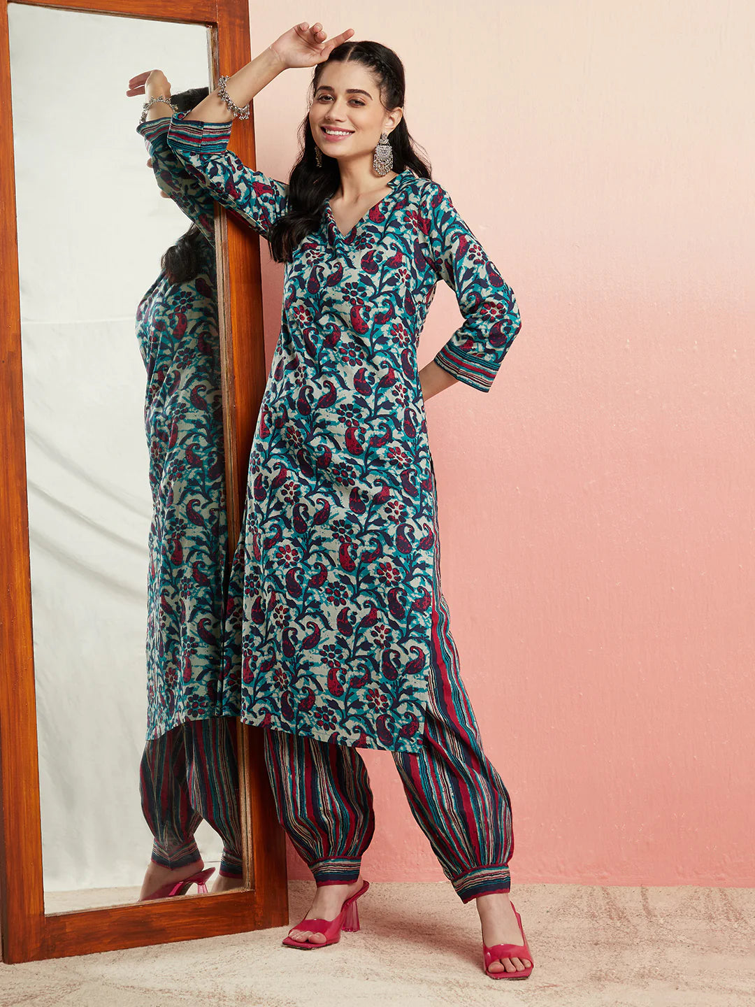 Blue Floral Print Kurta With Striped Balloon Palazzo