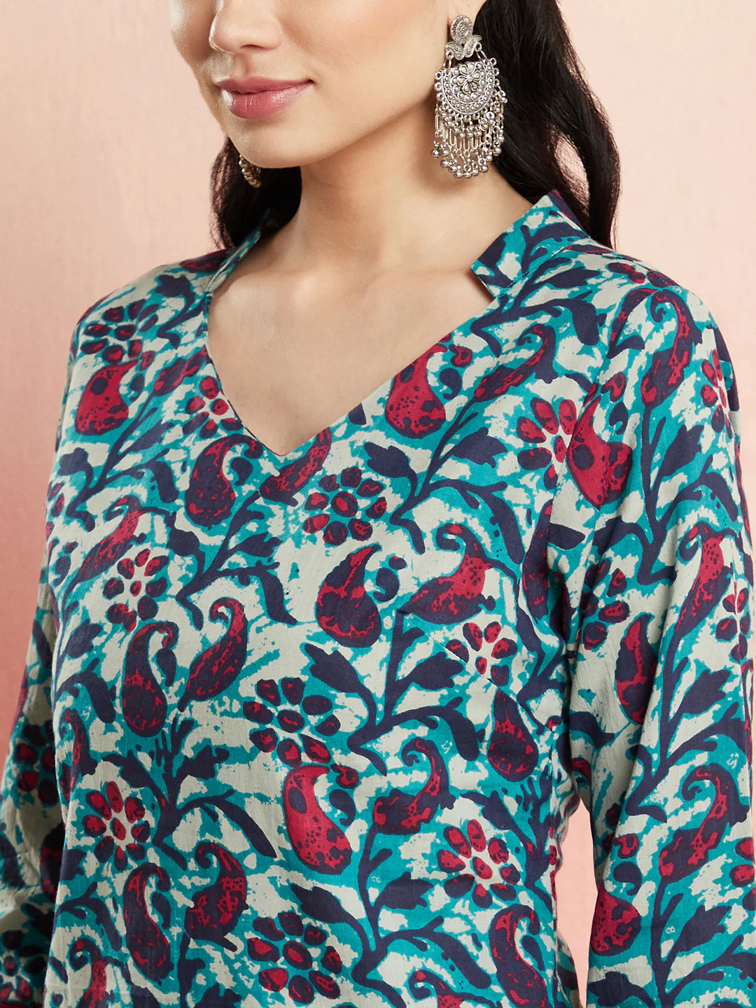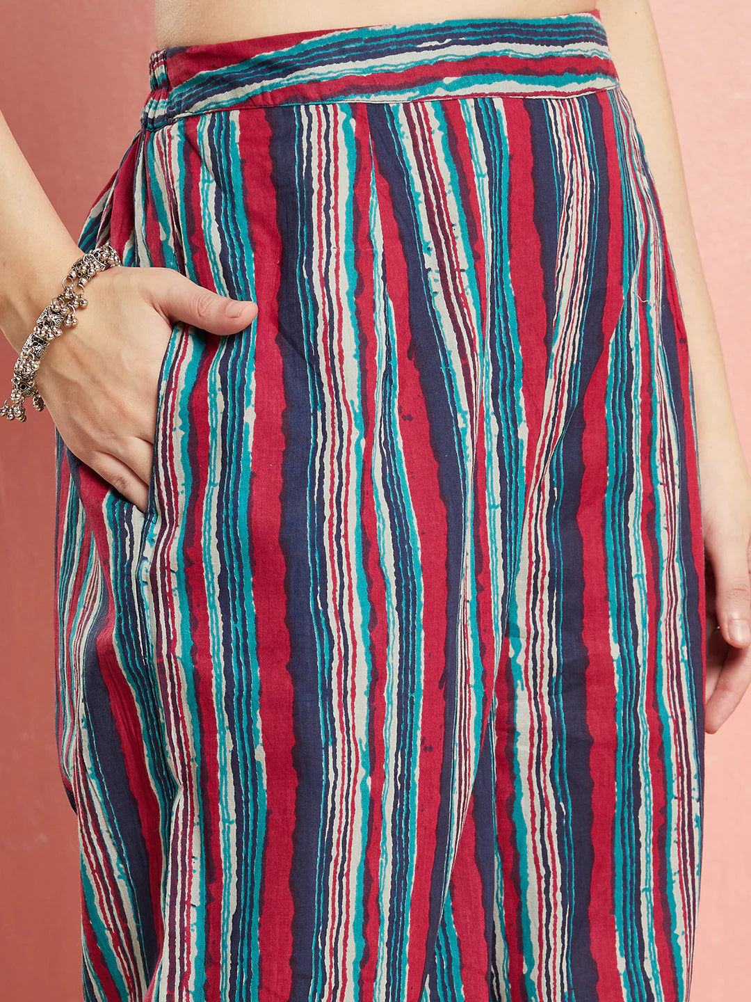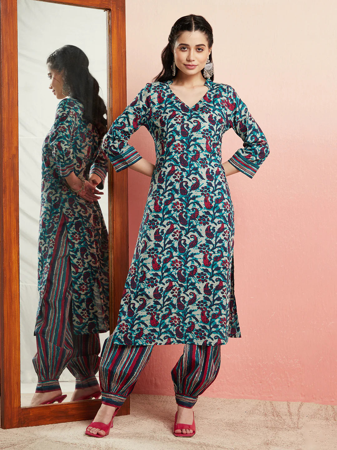 Blue Floral Print Kurta With Striped Balloon Palazzo
