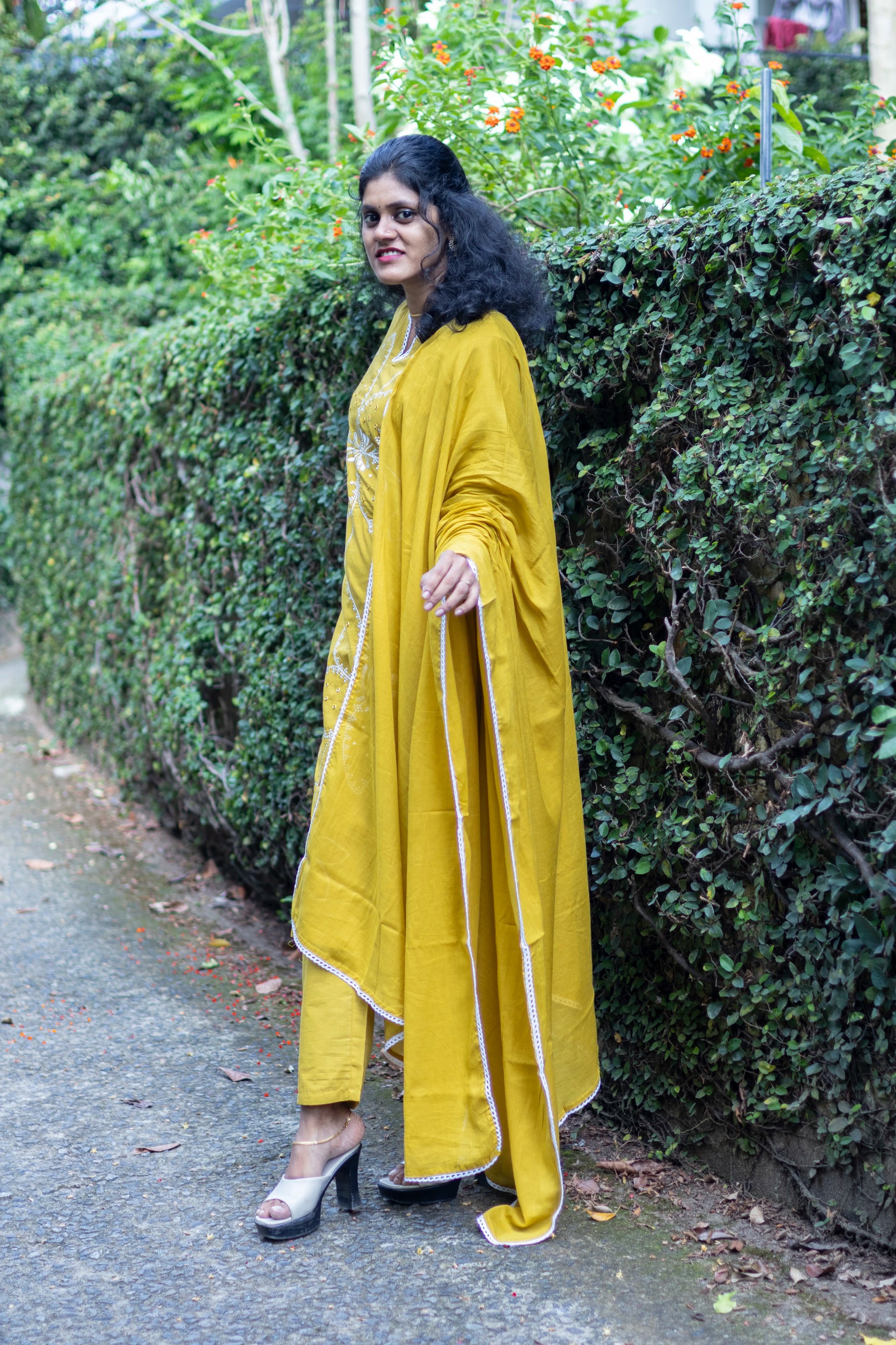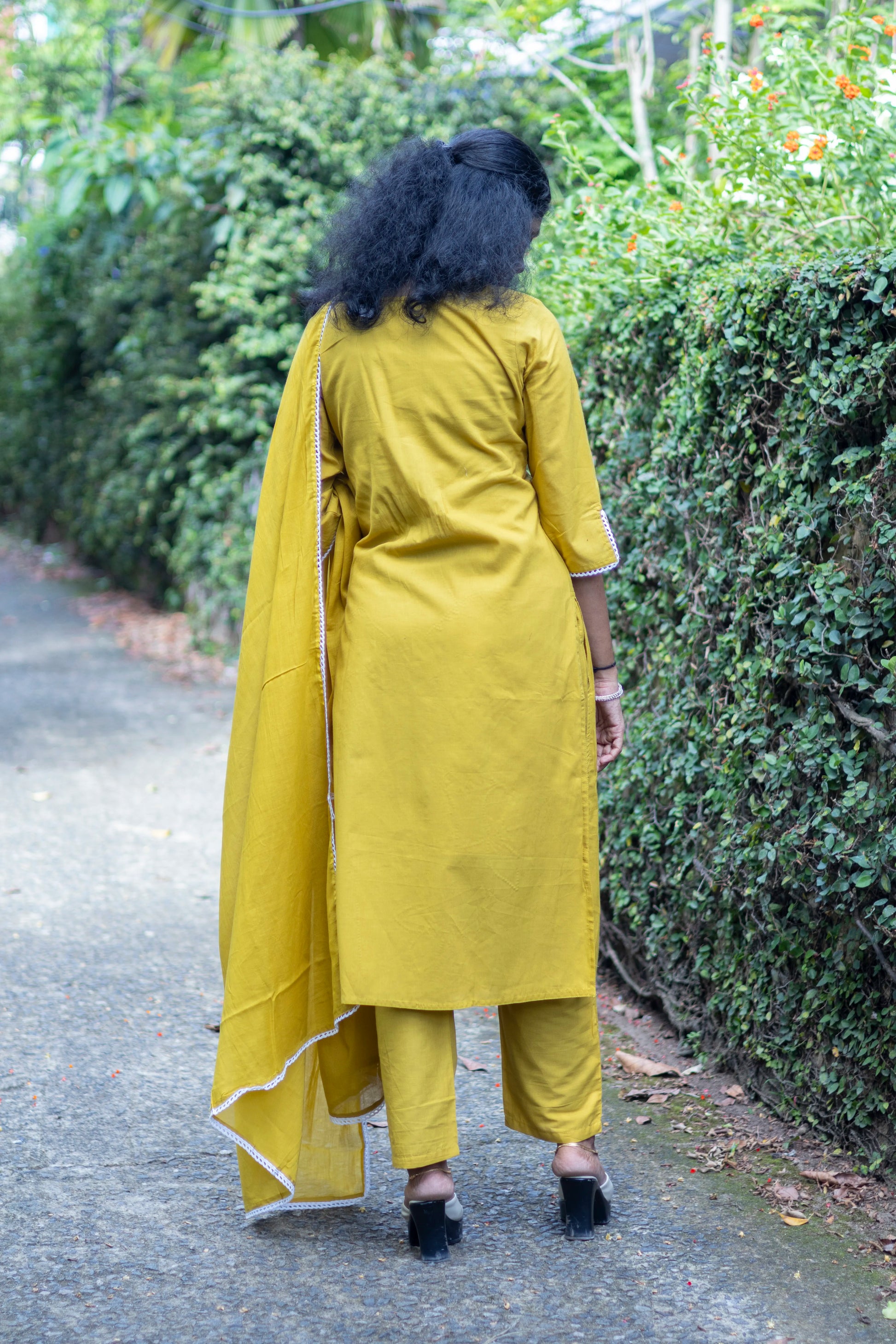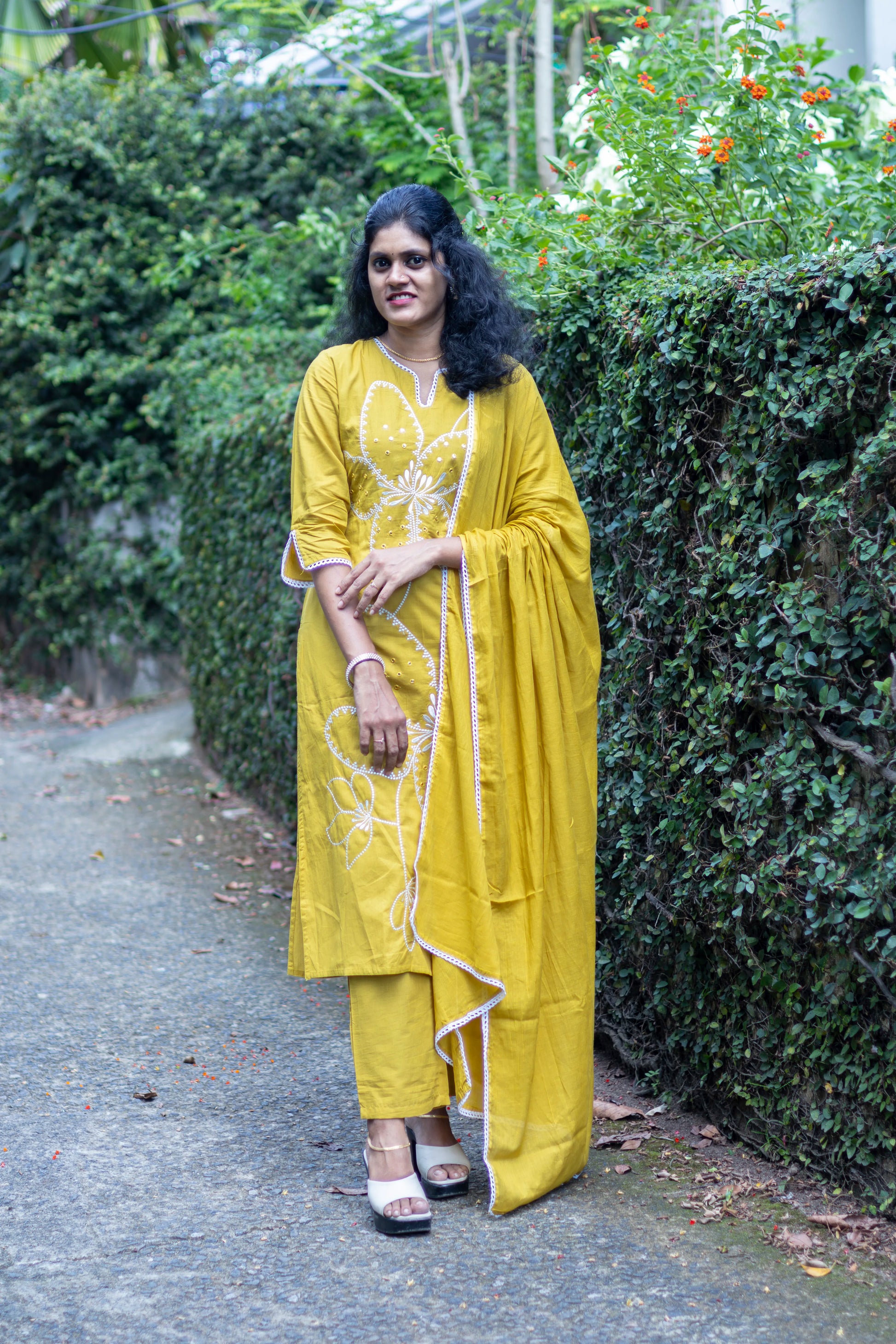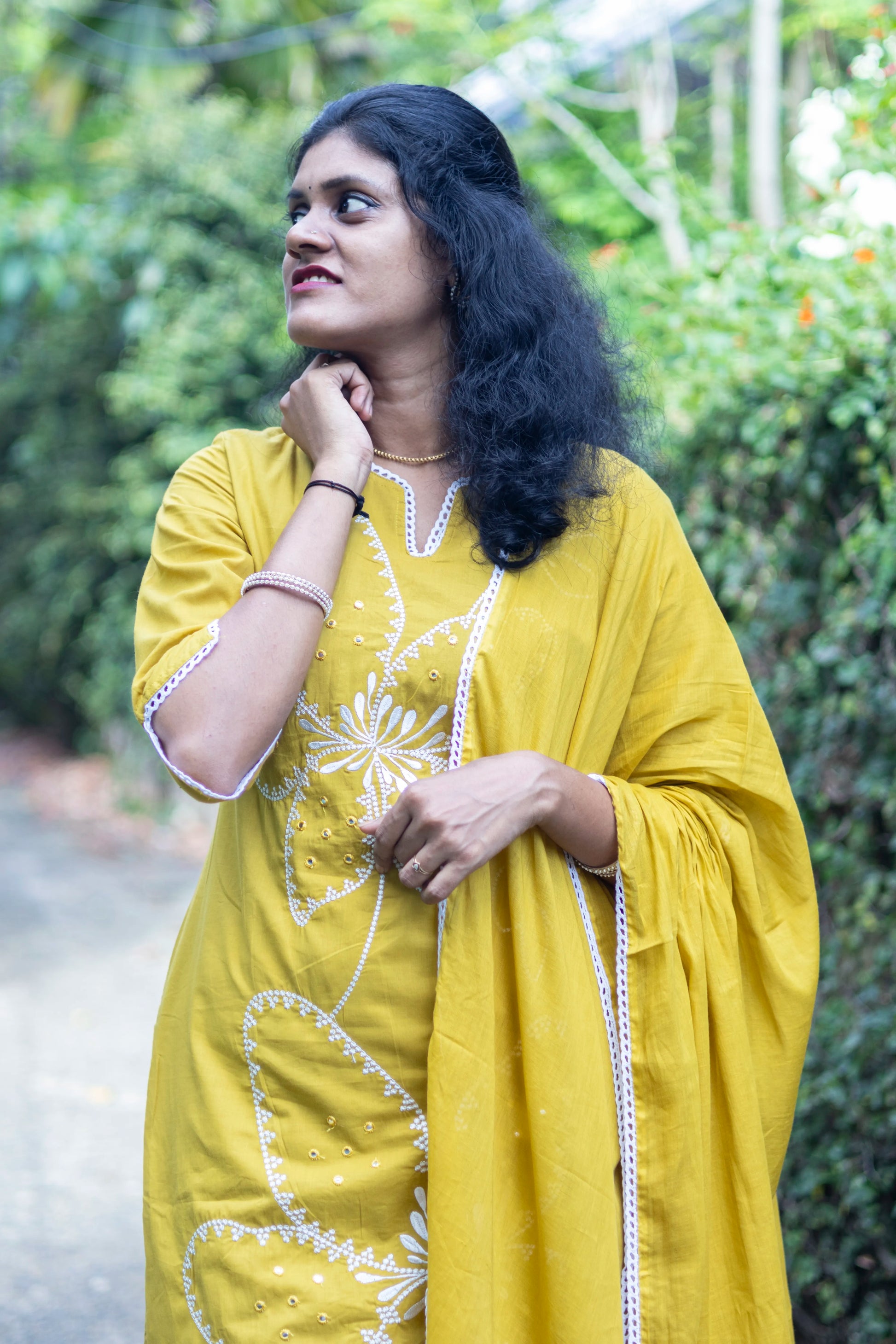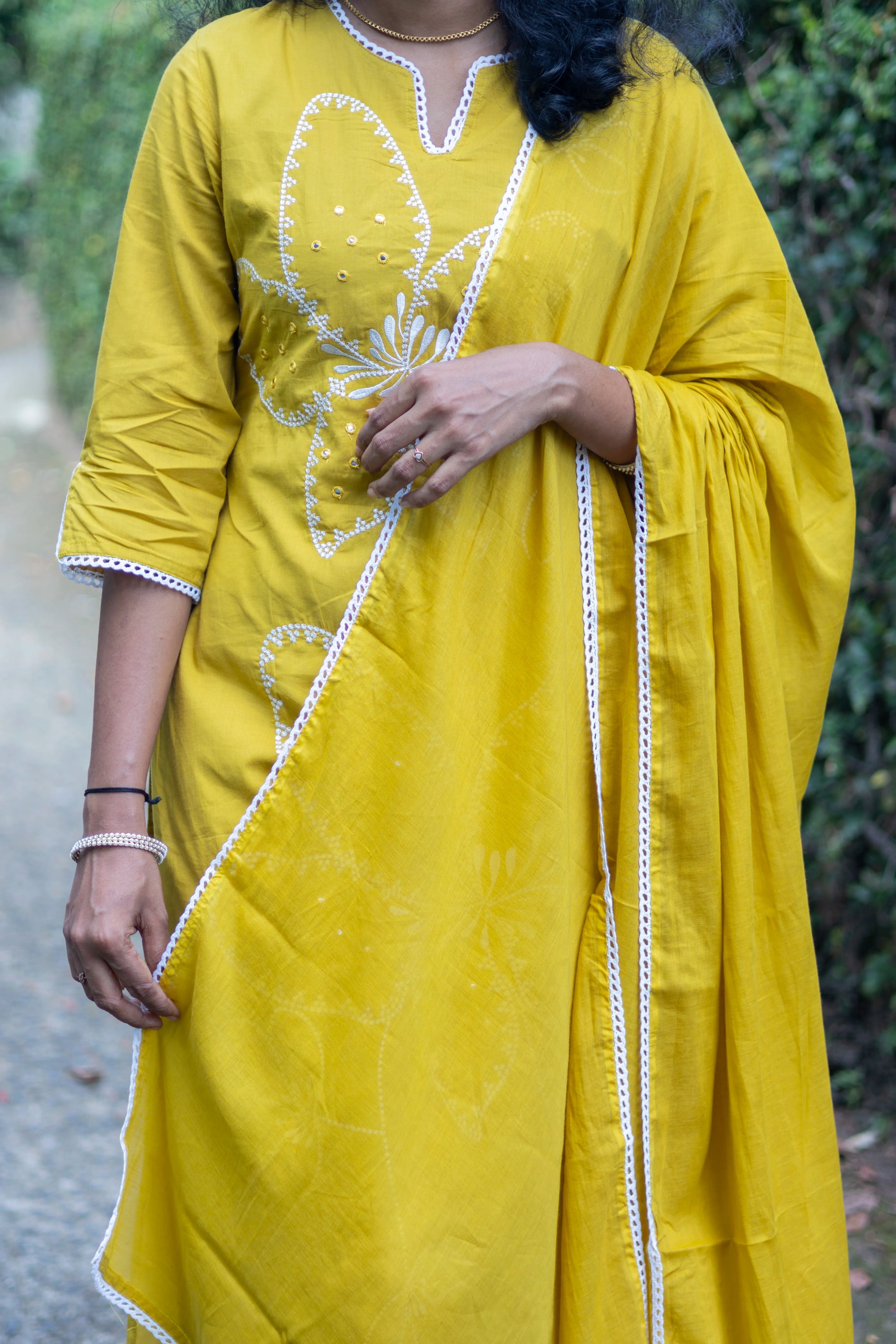 Yellow Color Embroidery Kurti with Bottom & Dupatta Set