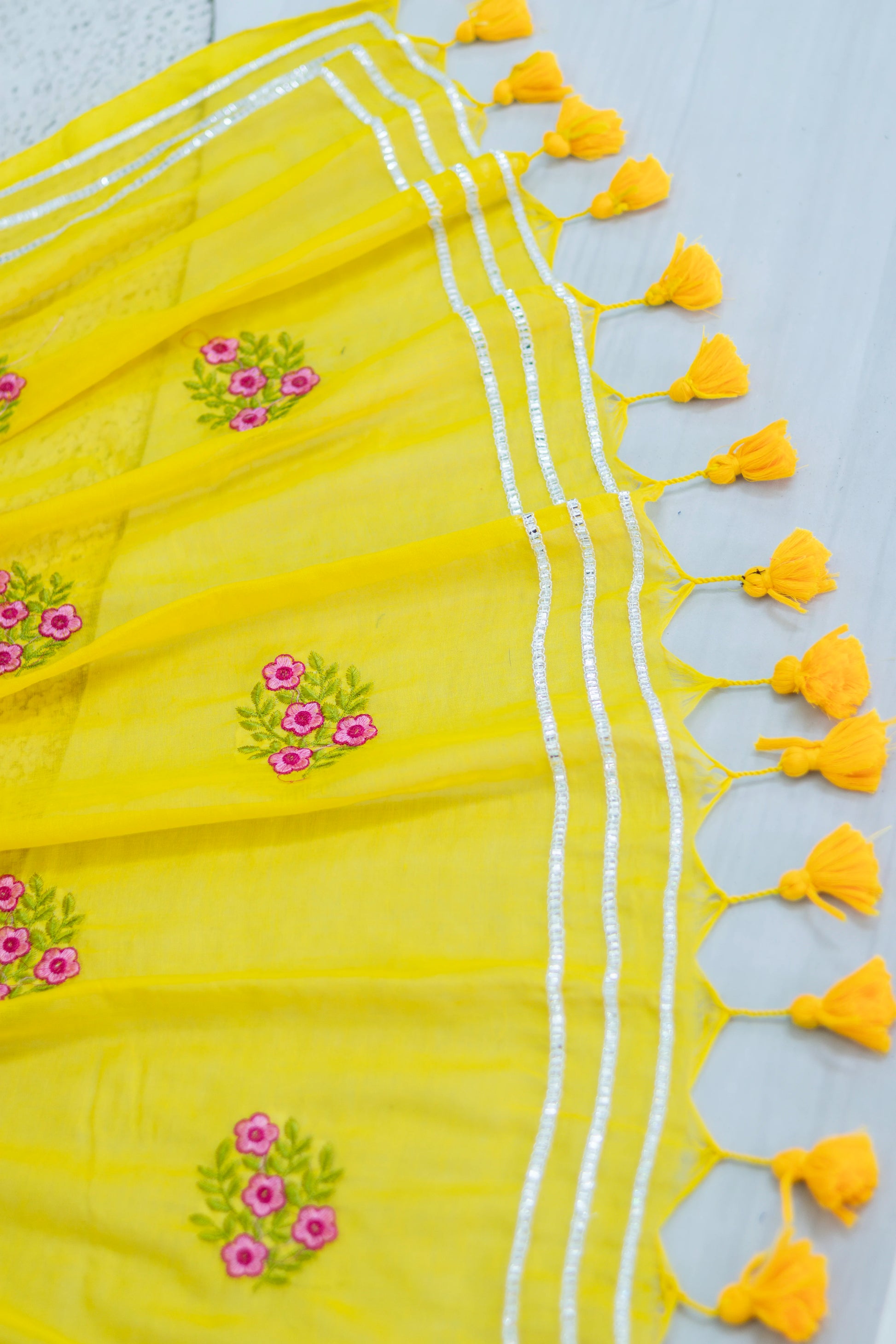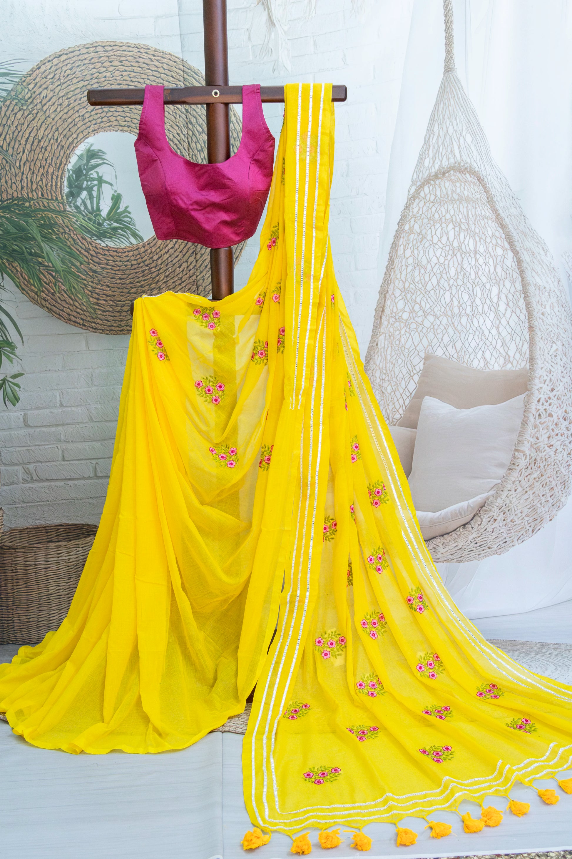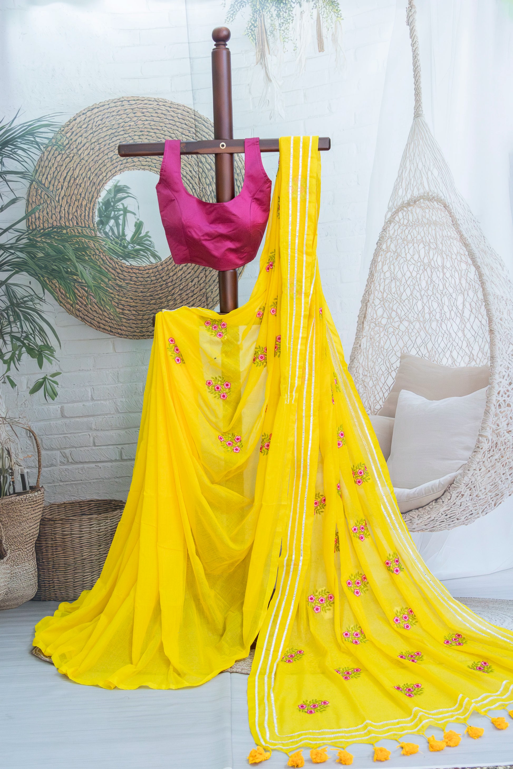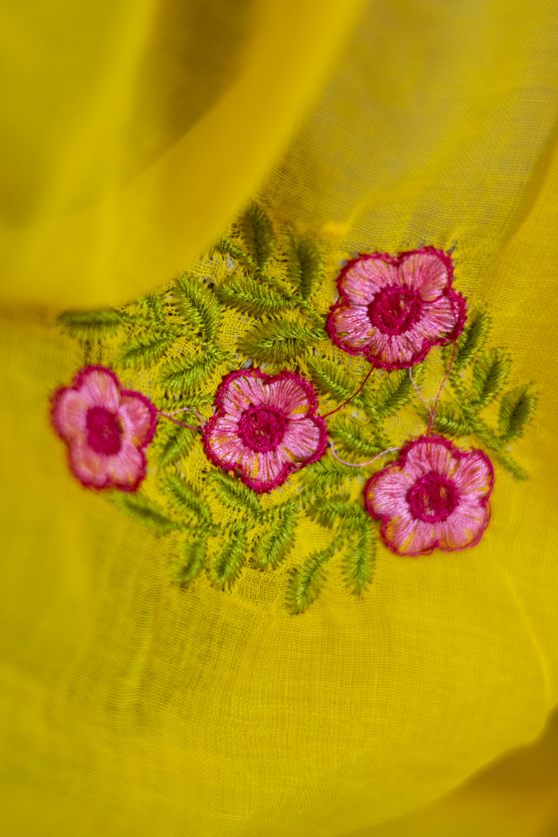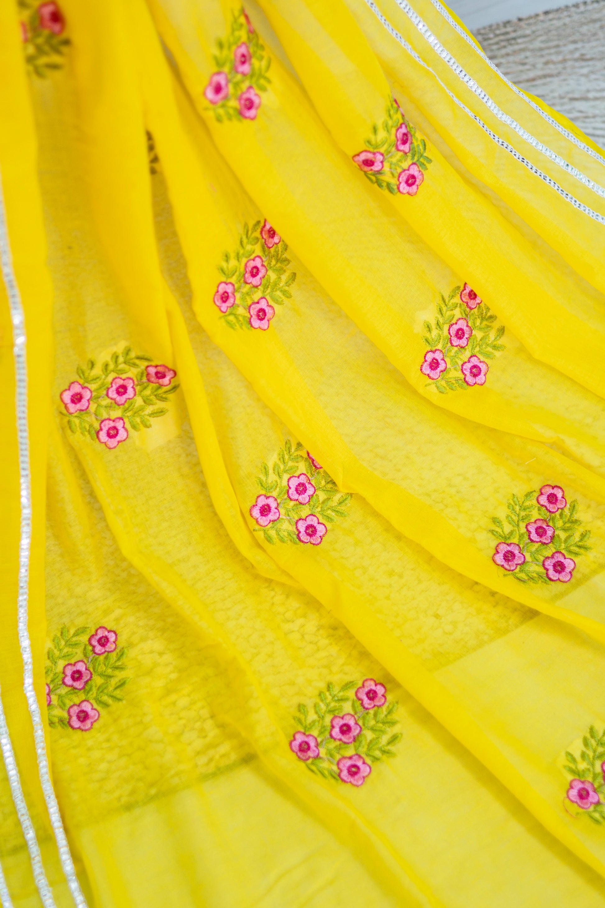 Yellow Colour Mul Cotton Embroidery Saree