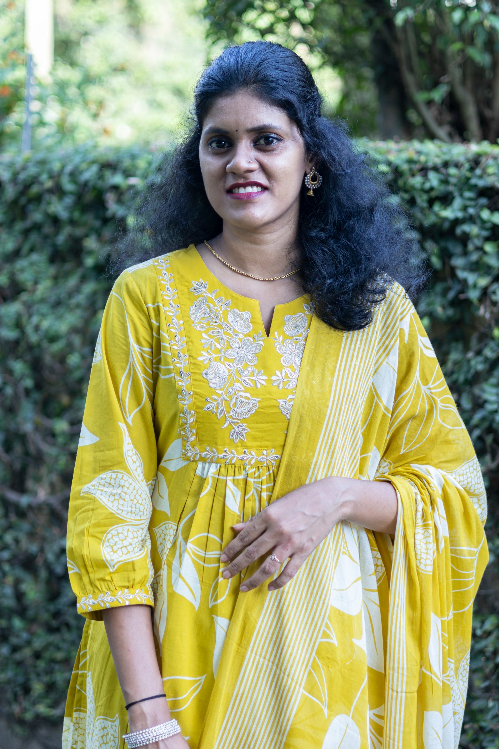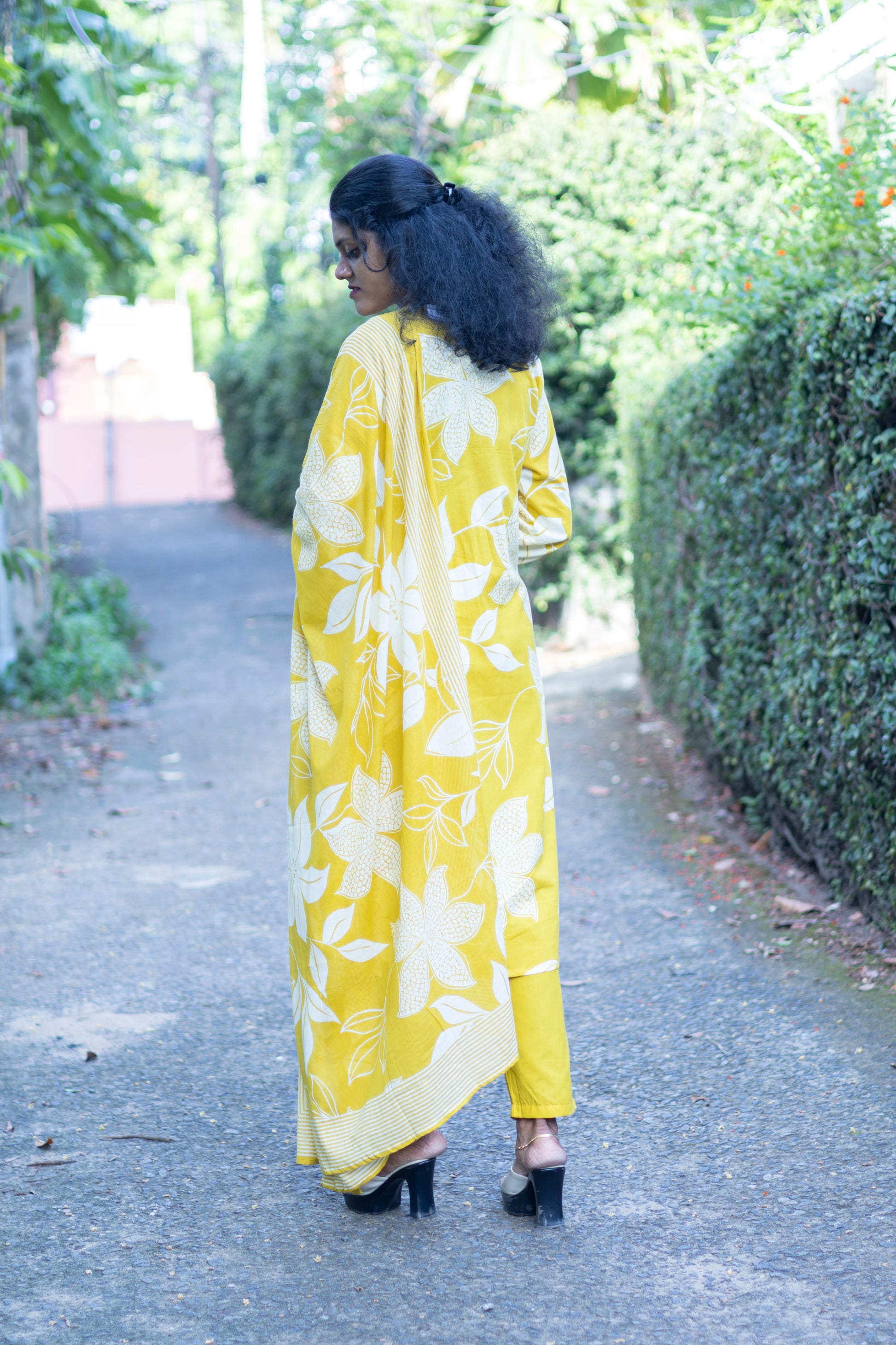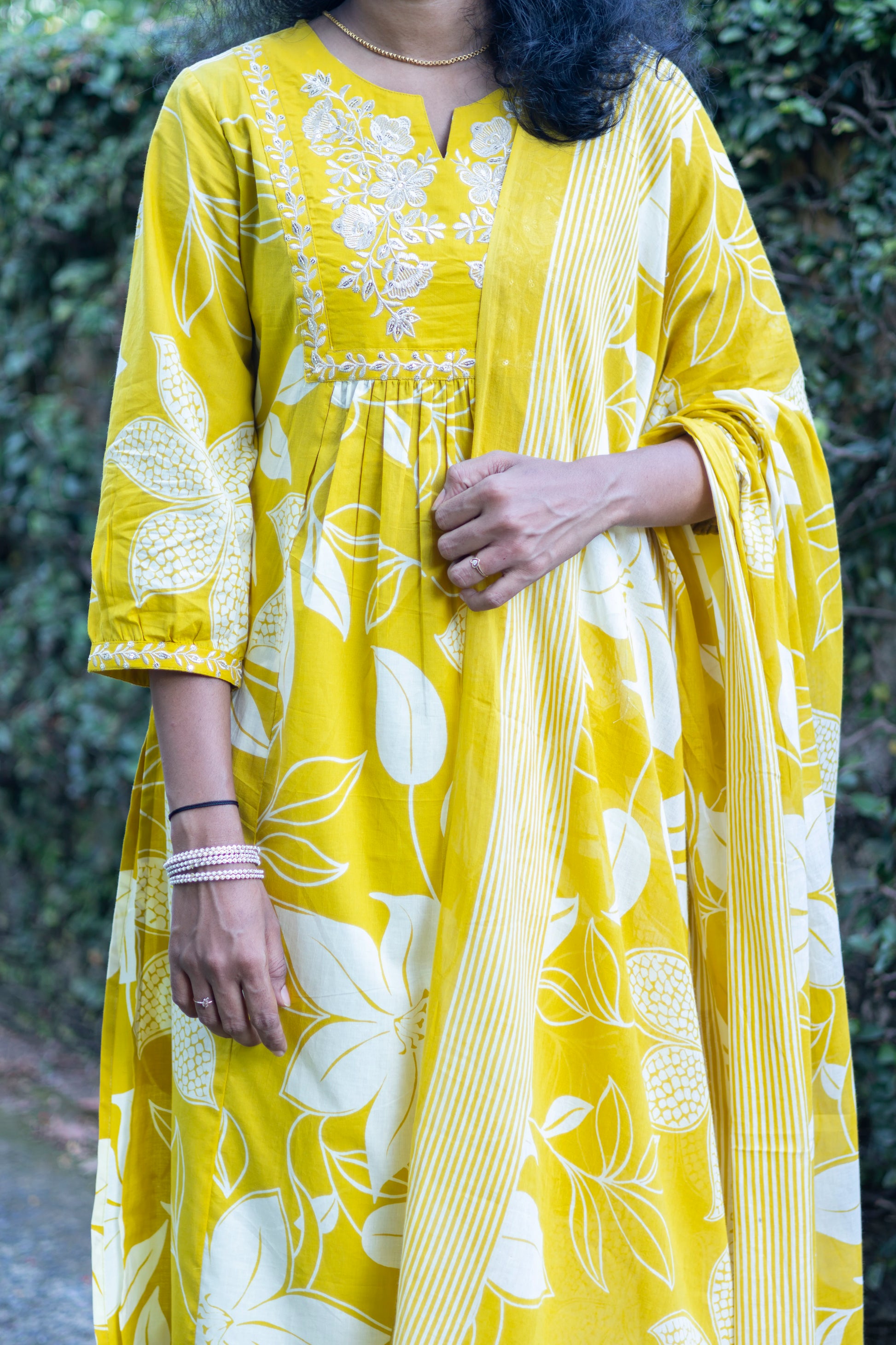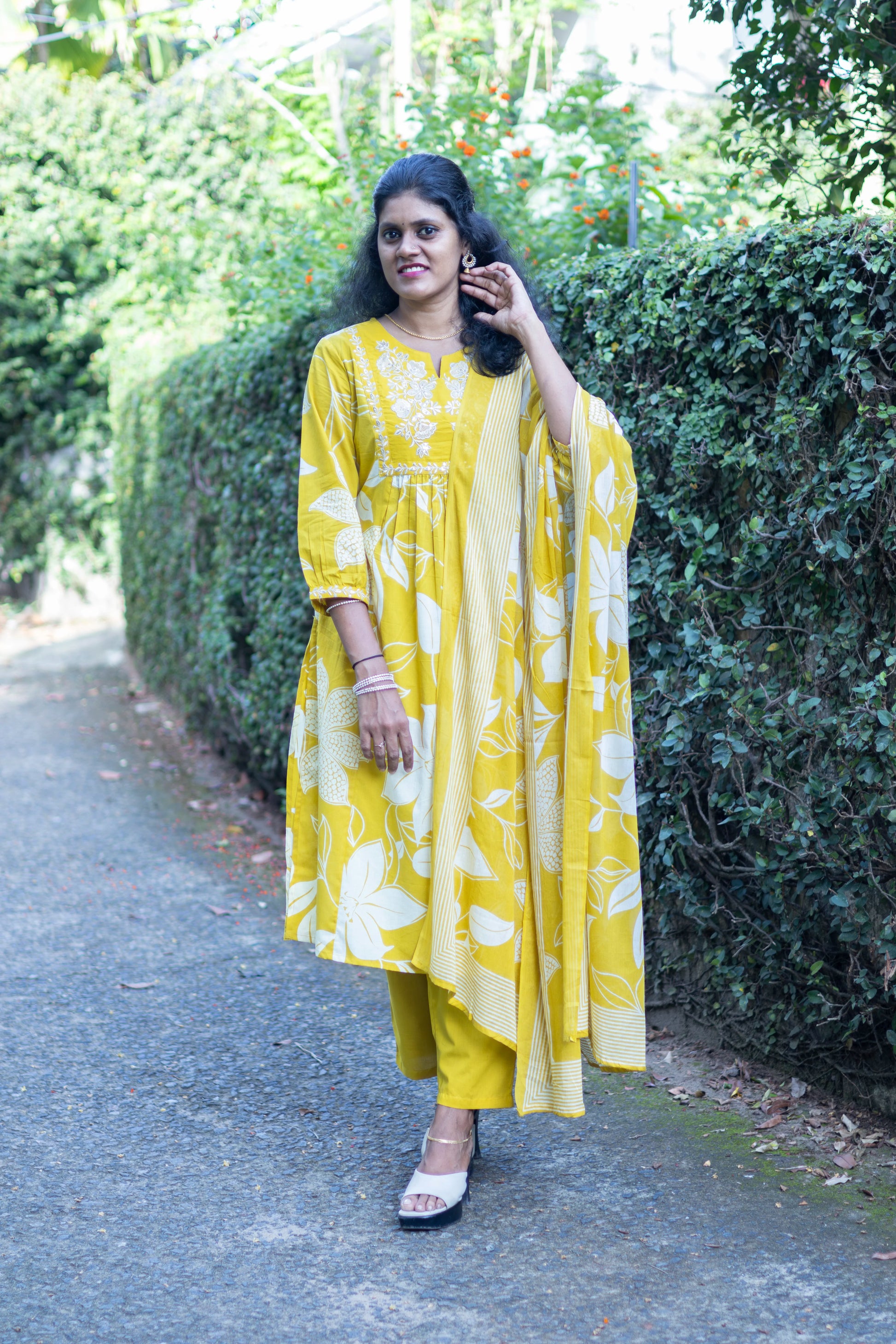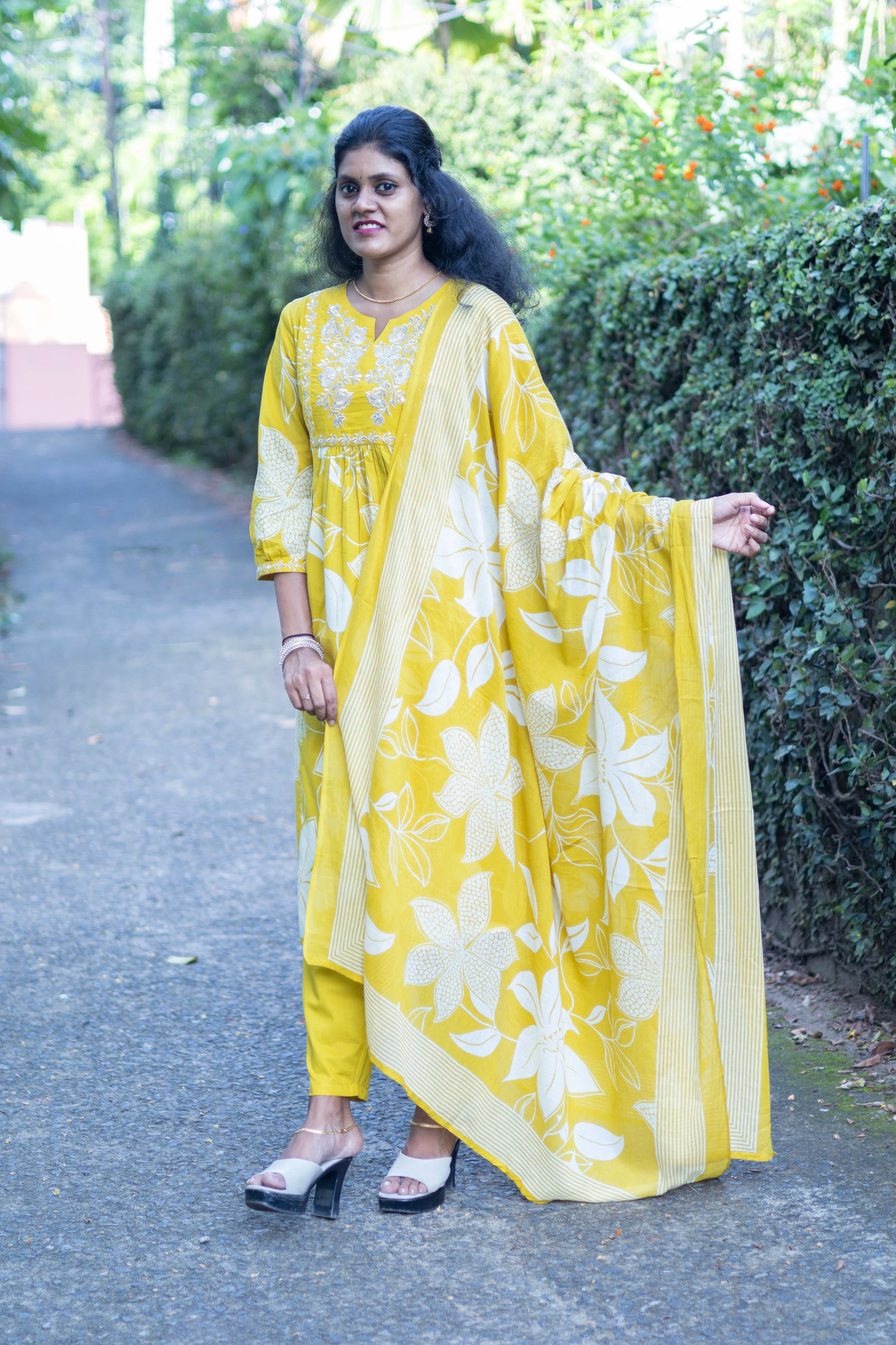 Yellow Yoke Embroidered Kurti Pant Dupatta Set
