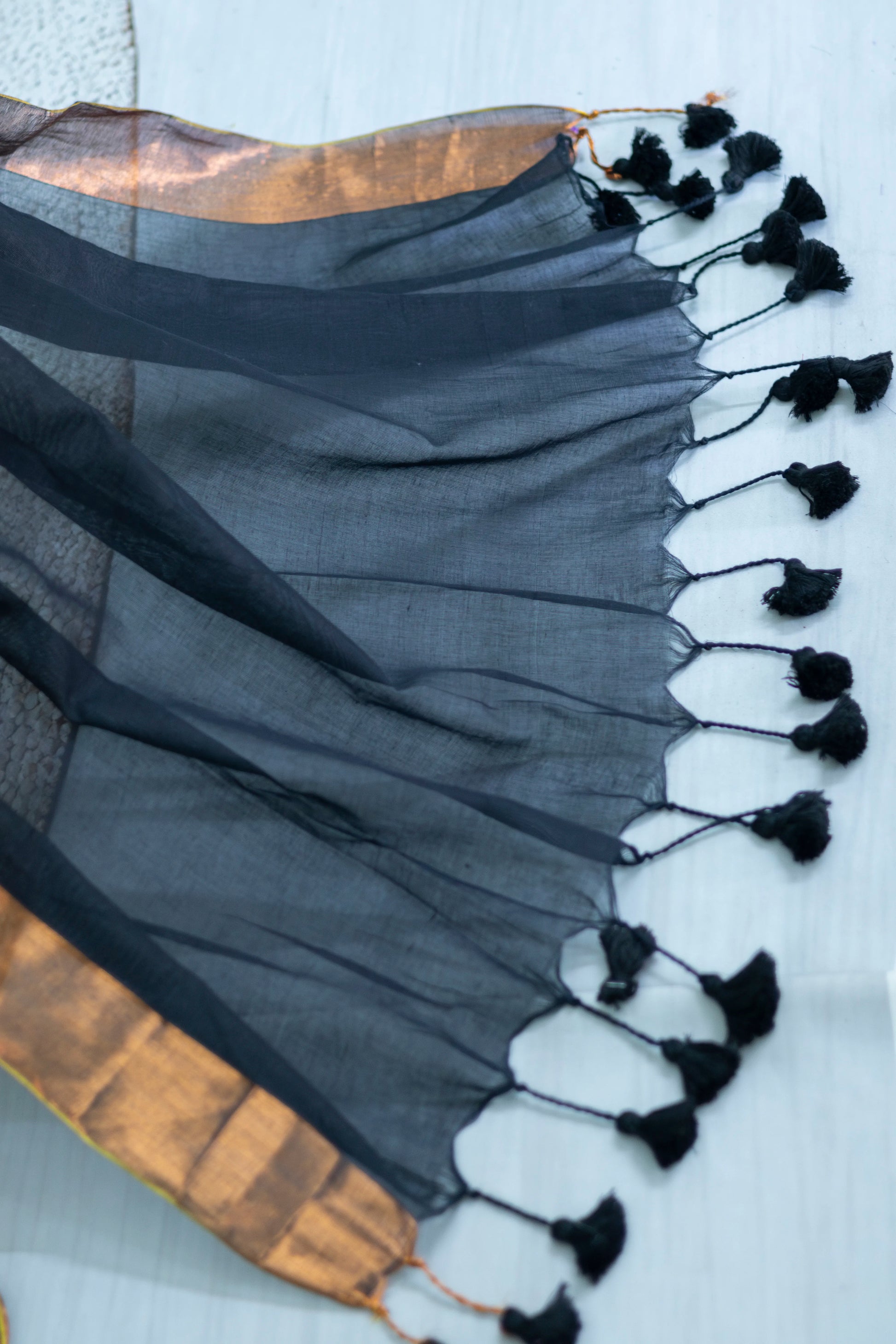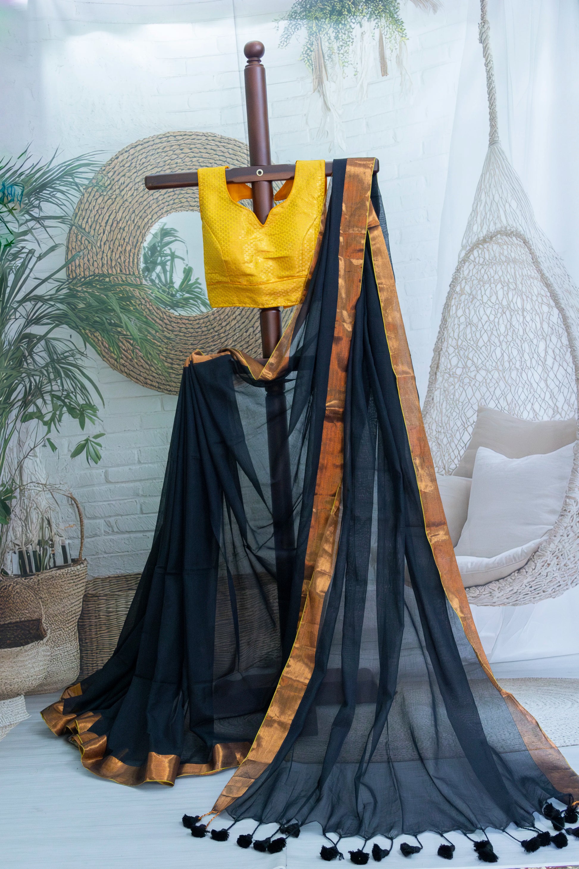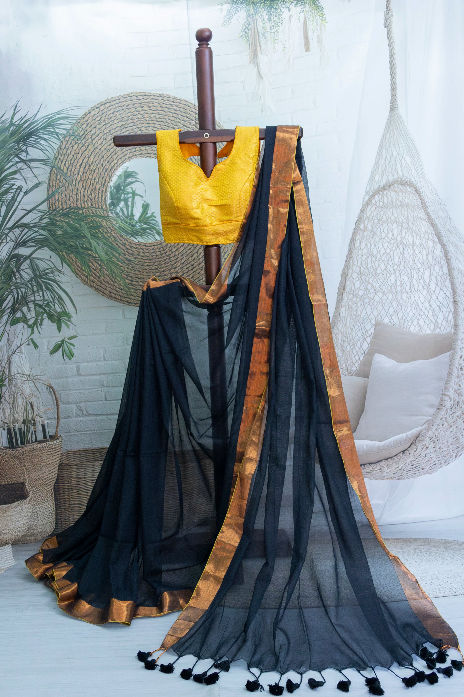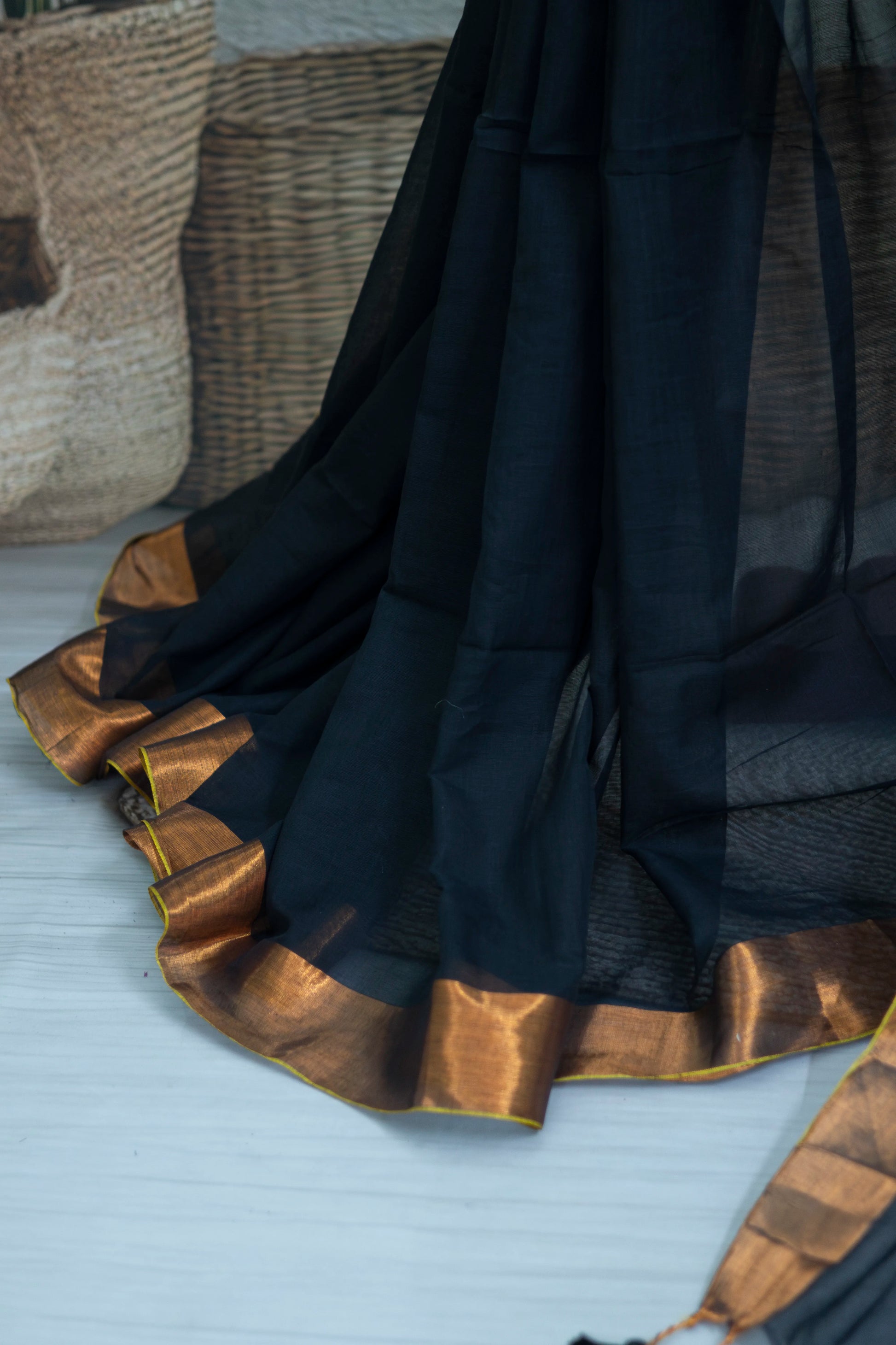 Black Colour Mul Cotton Zari Border Saree
